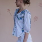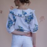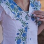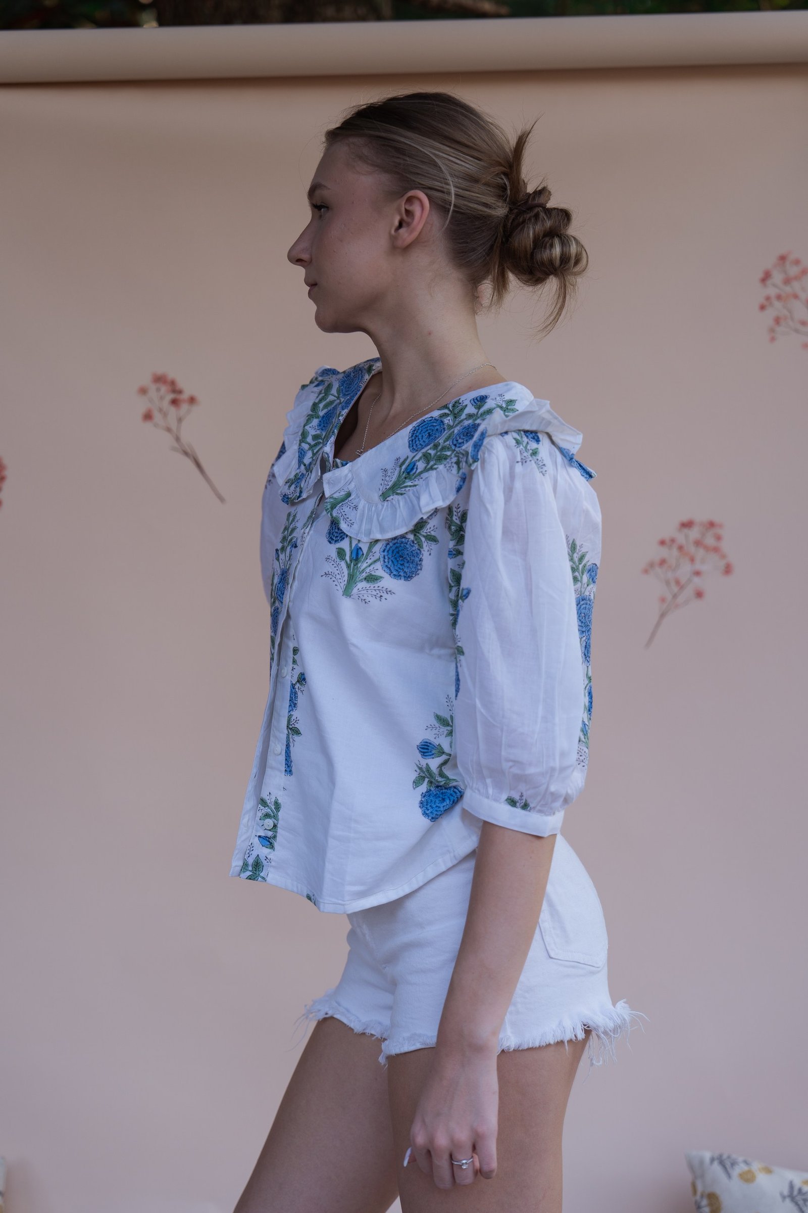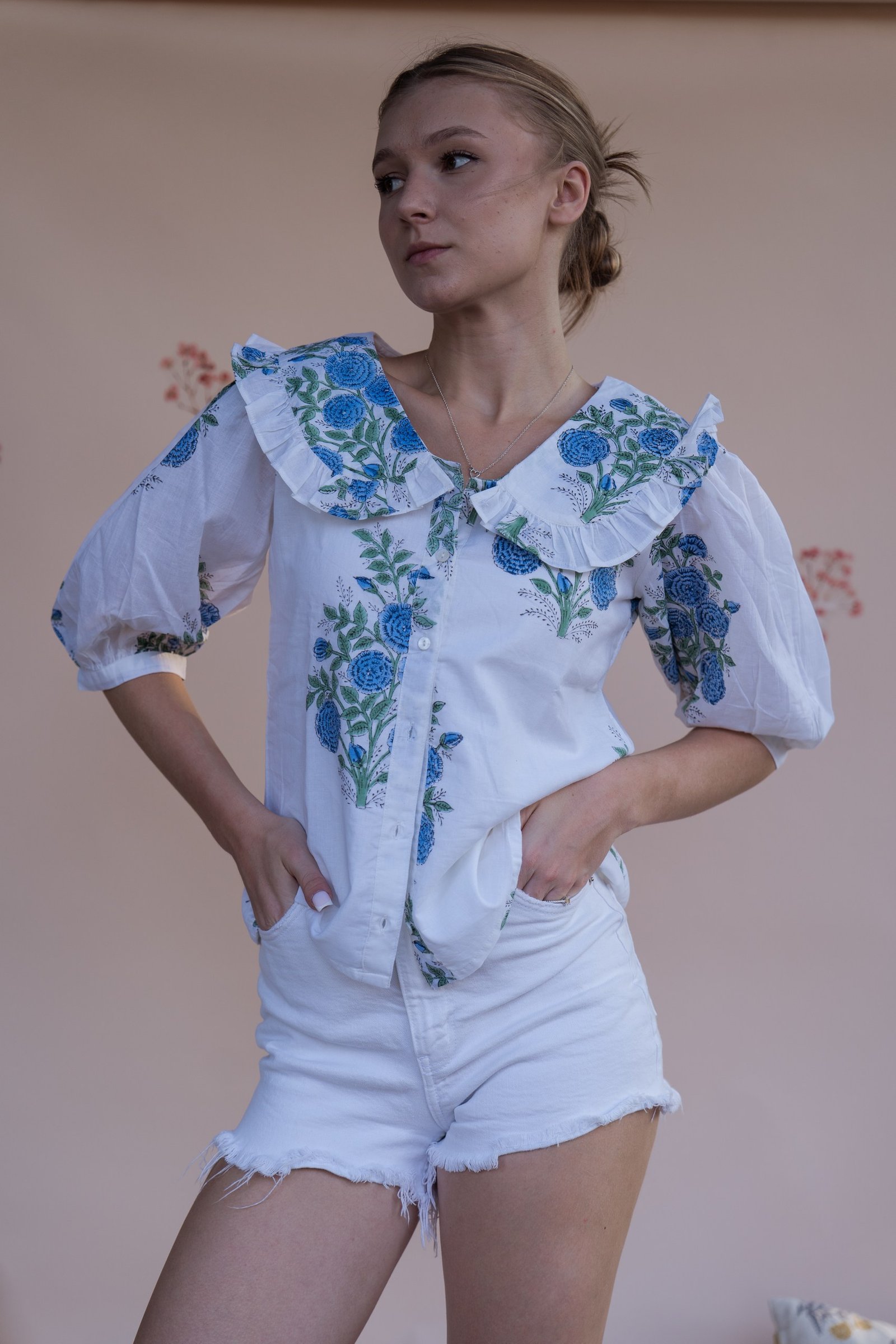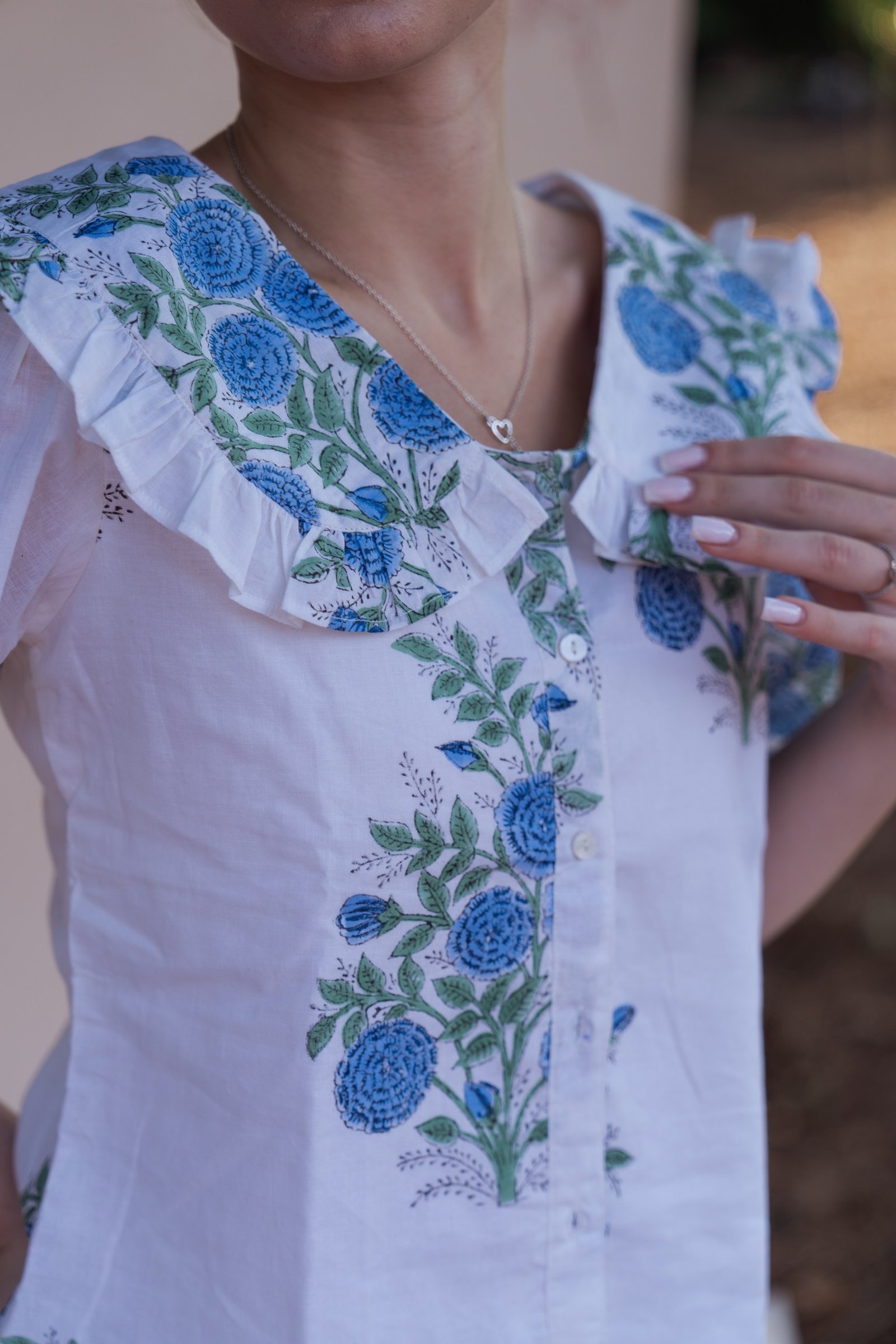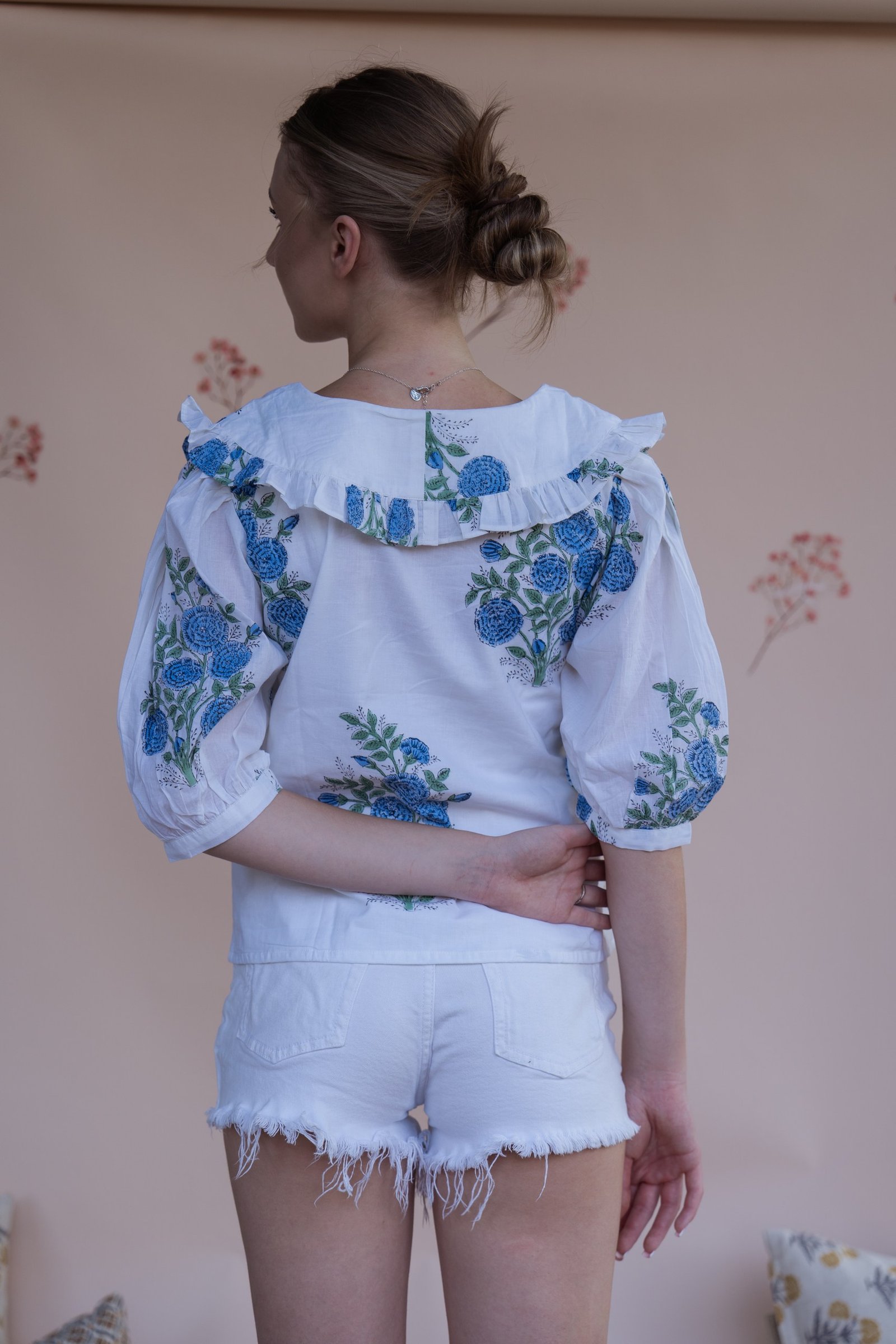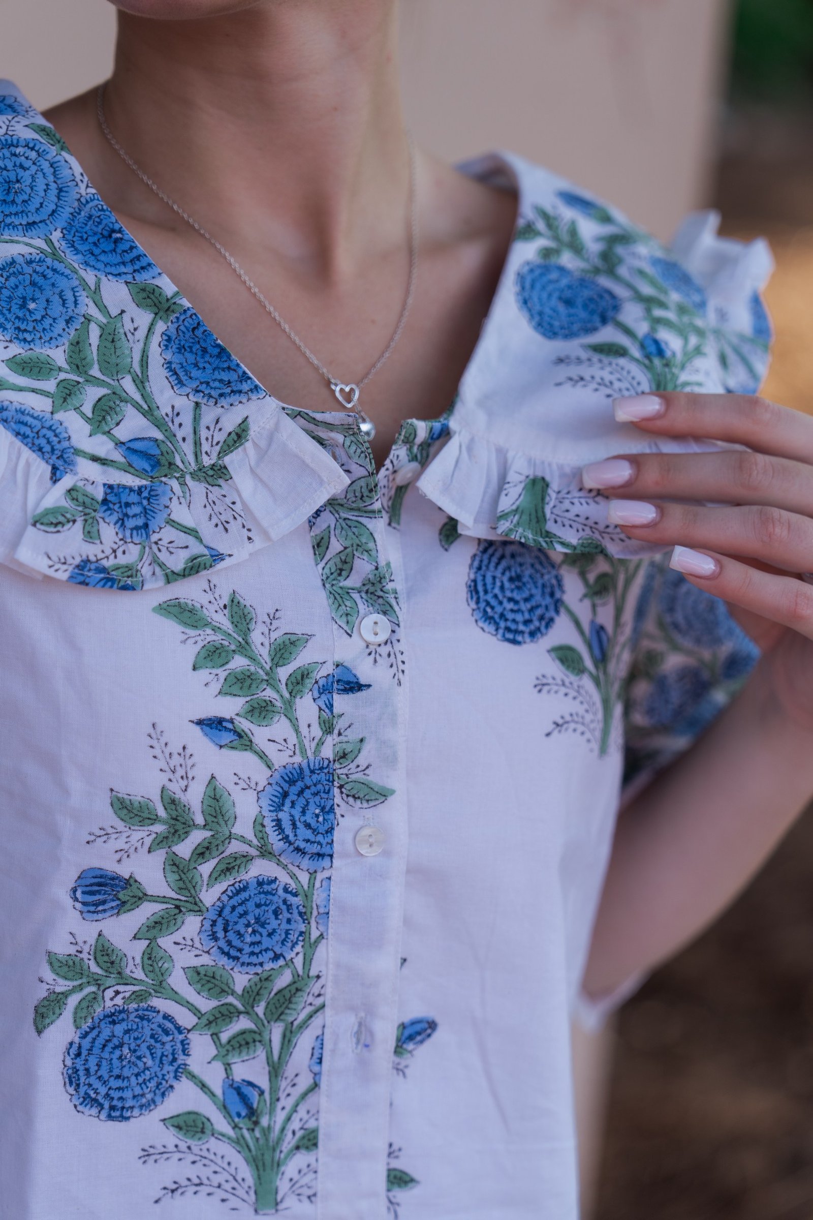The Blue Garden Top is a handcrafted cotton blouse featuring vibrant Blue flower motifs, symbolizing joy and celebration, printed using traditional Indian hand block printing techniques. and adorned with traditional hand block prints.