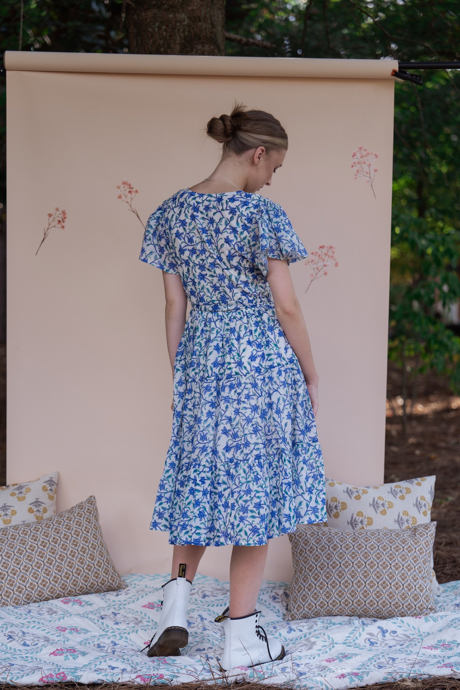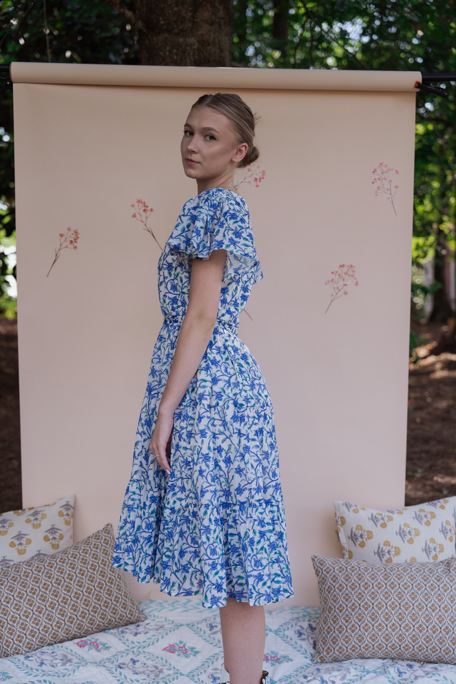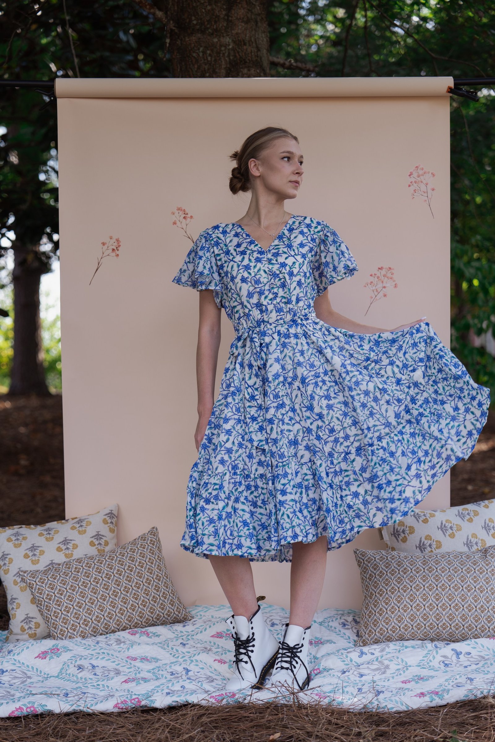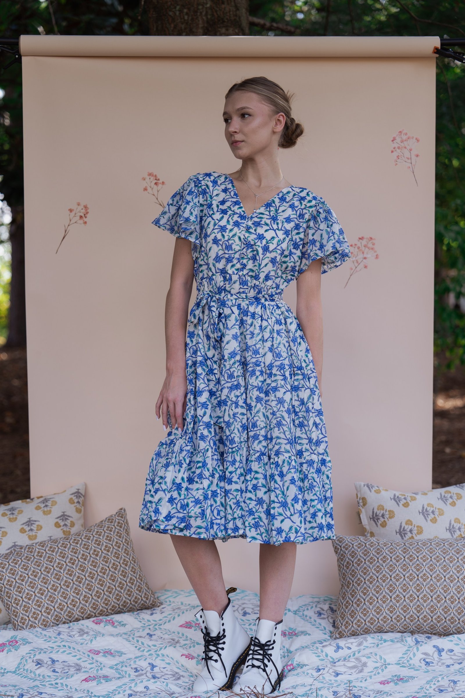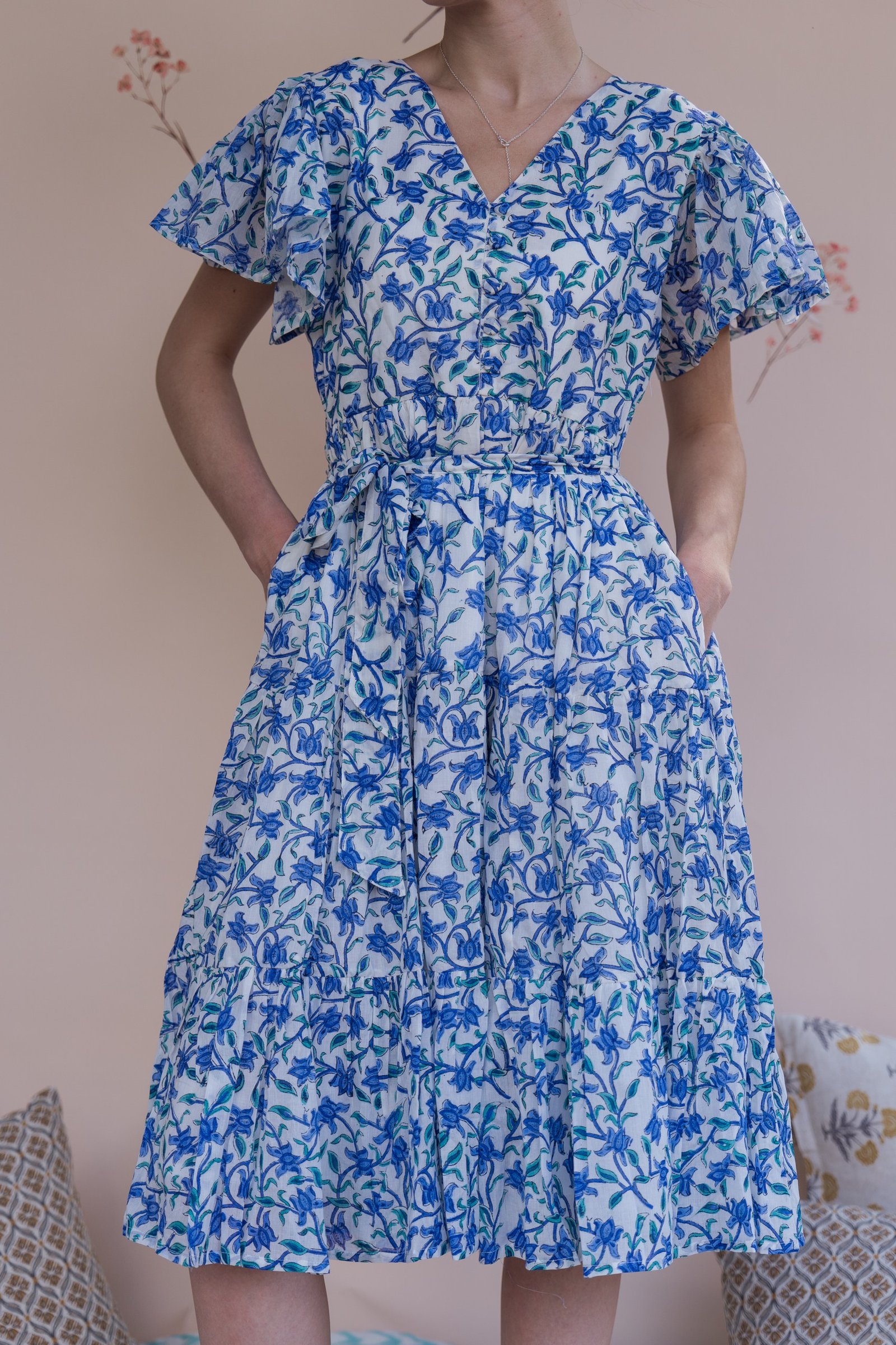 A breezy tiered cotton midi dress with flutter sleeves and hand block printed floral motif in beautiful shades of blue and soft white base. The flowy silhouette, flutter sleeves, and gathered waist create a breezy, feminine charm – perfect for a picnic day, brunch outing, or a stroll under the sun.