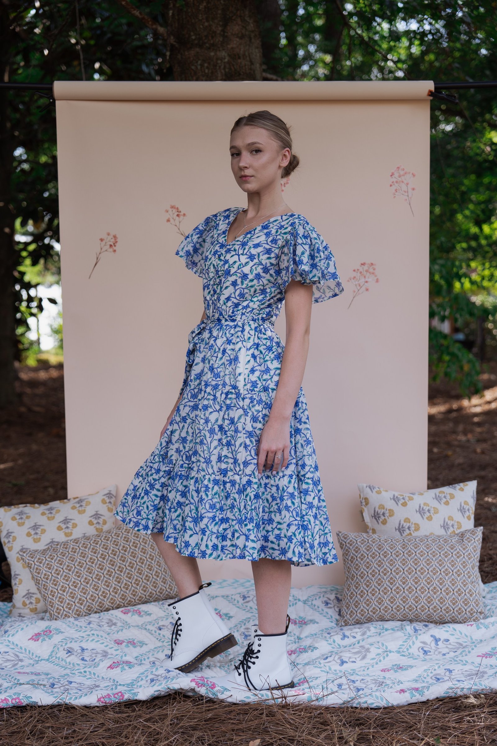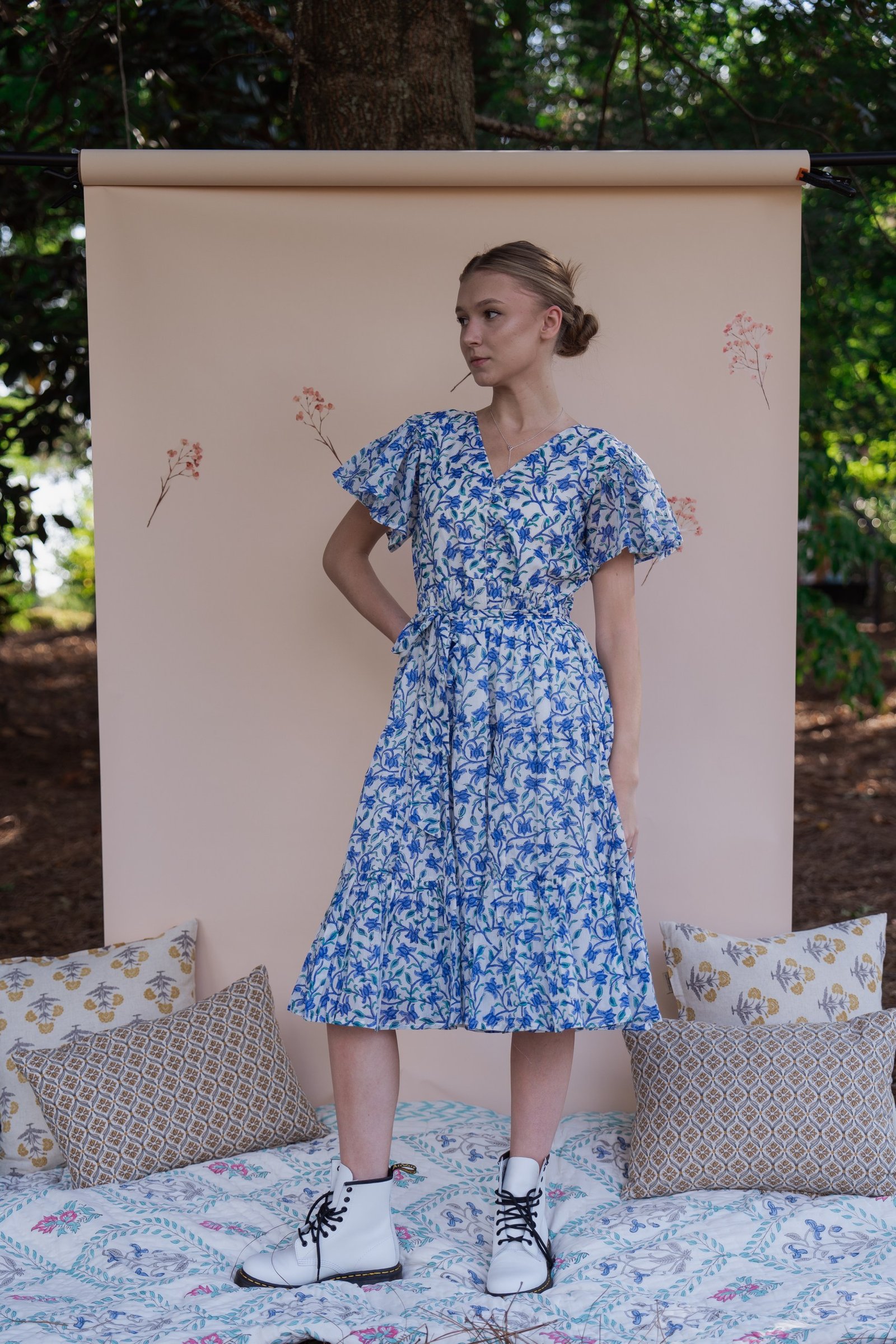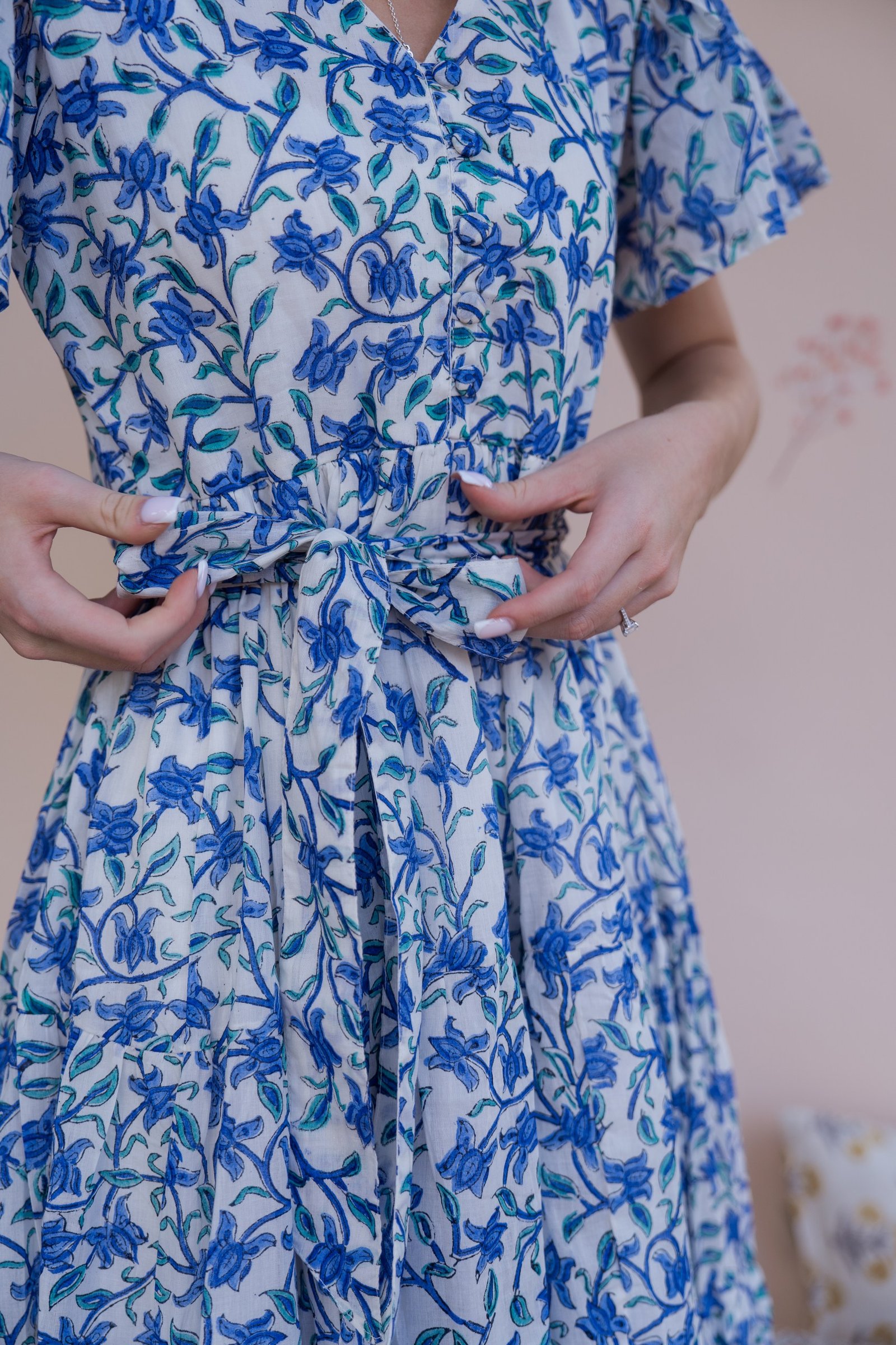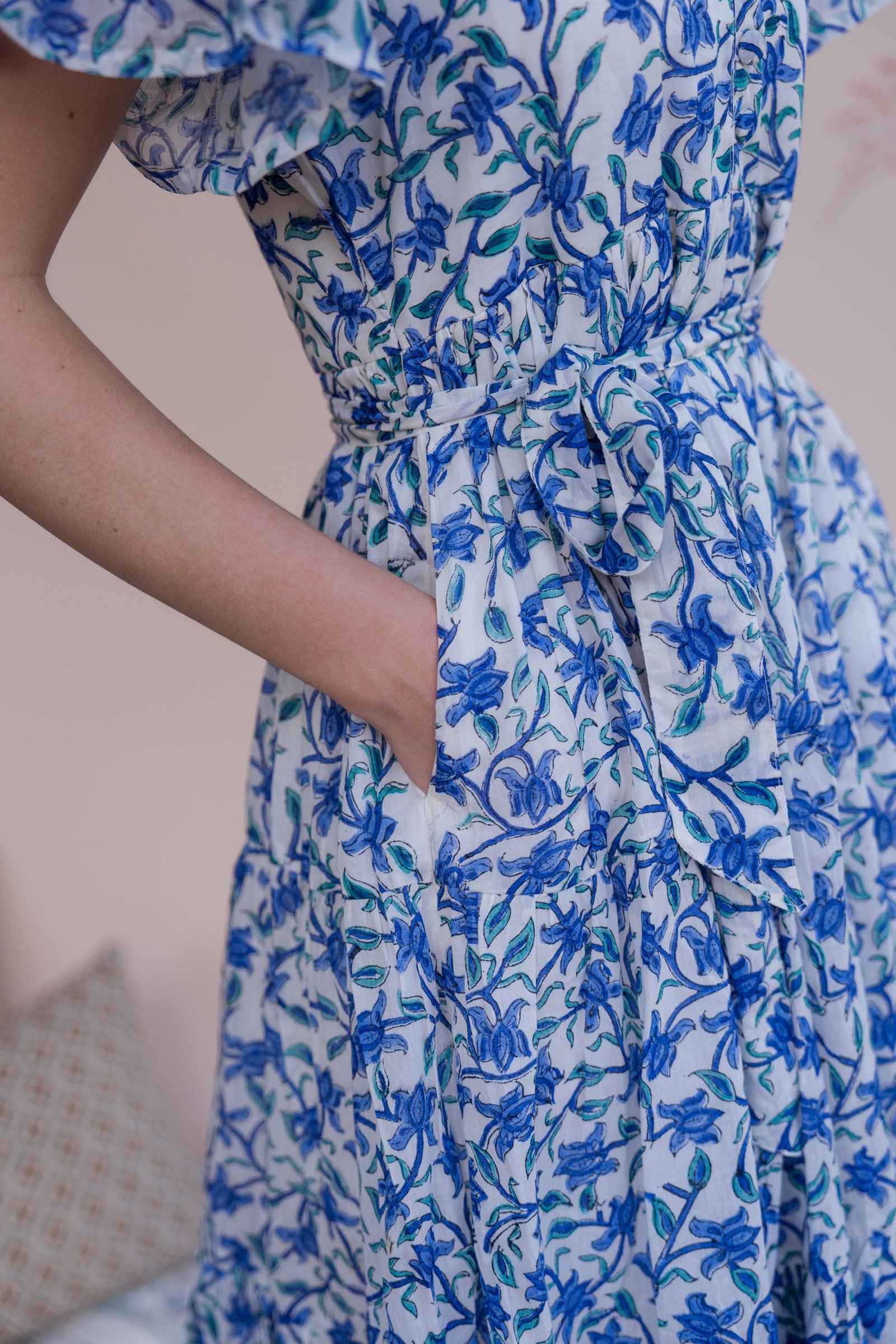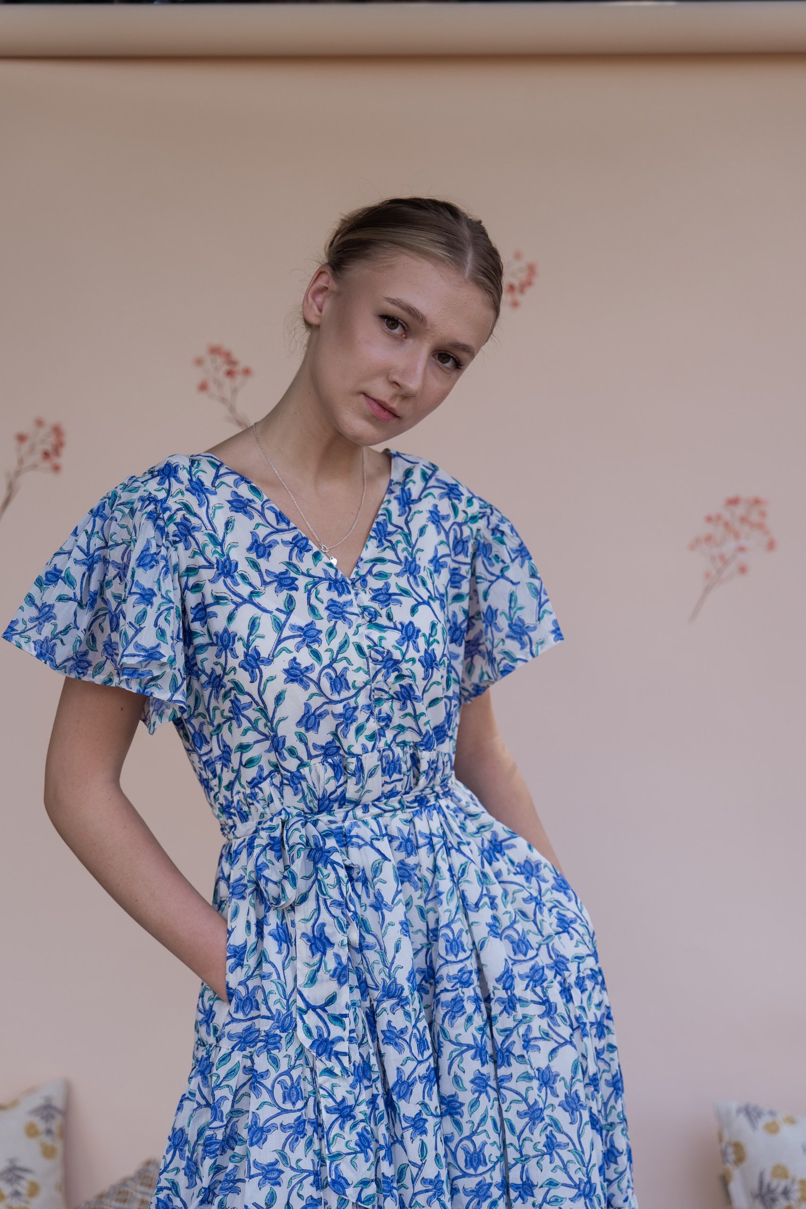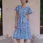 A breezy tiered cotton midi dress with flutter sleeves and hand block printed floral motif in beautiful shades of blue and soft white base. The flowy silhouette, flutter sleeves, and gathered waist create a breezy, feminine charm – perfect for a picnic day, brunch outing, or a stroll under the sun.