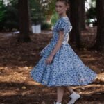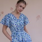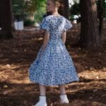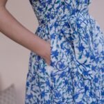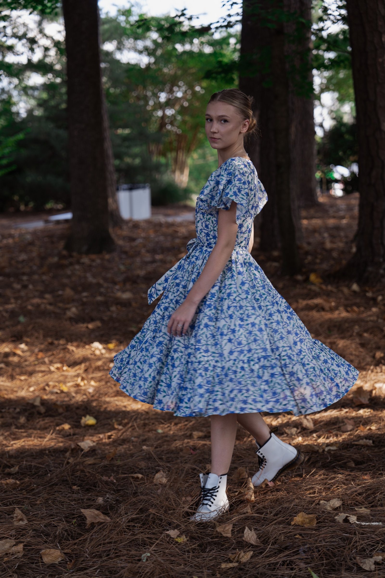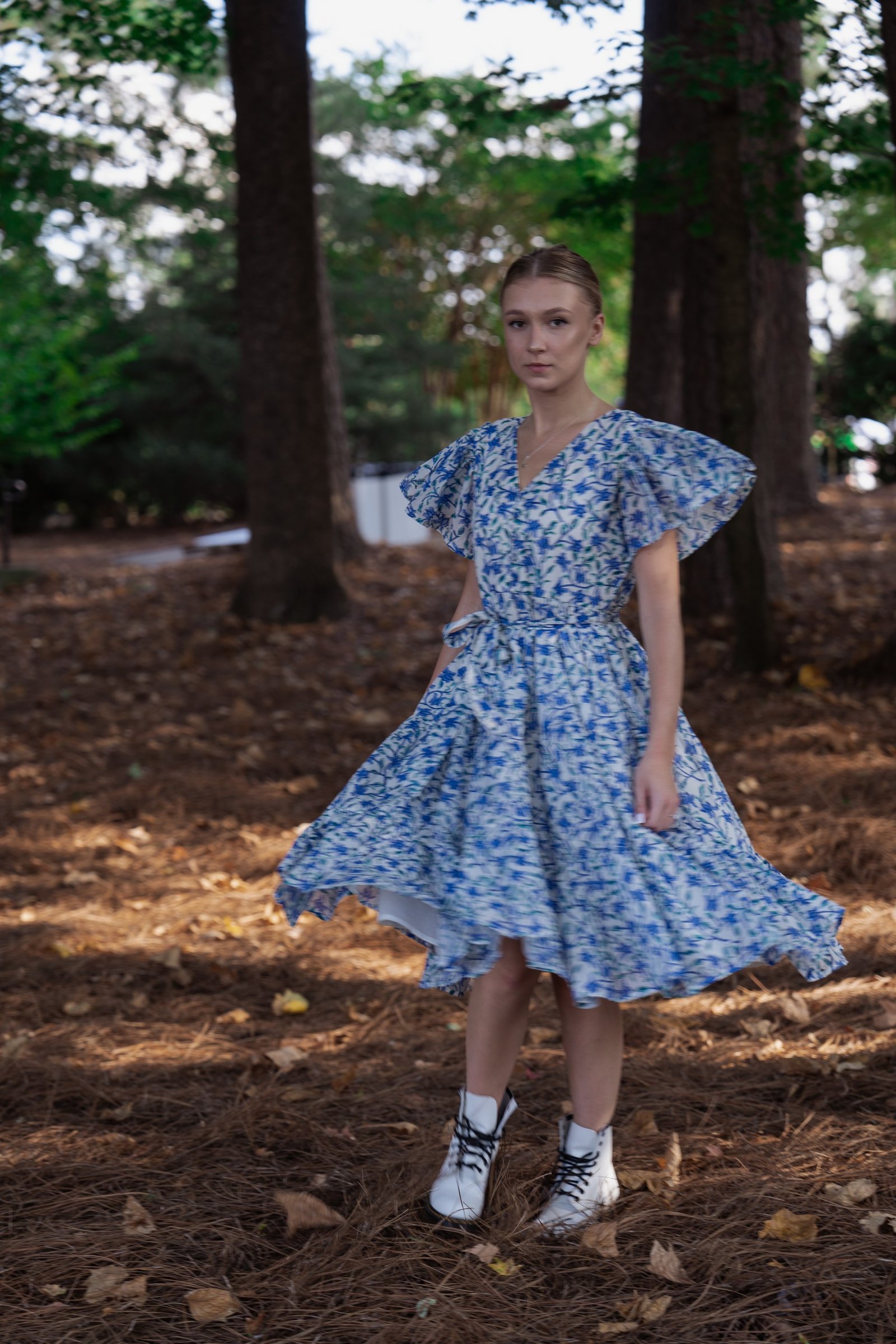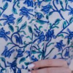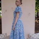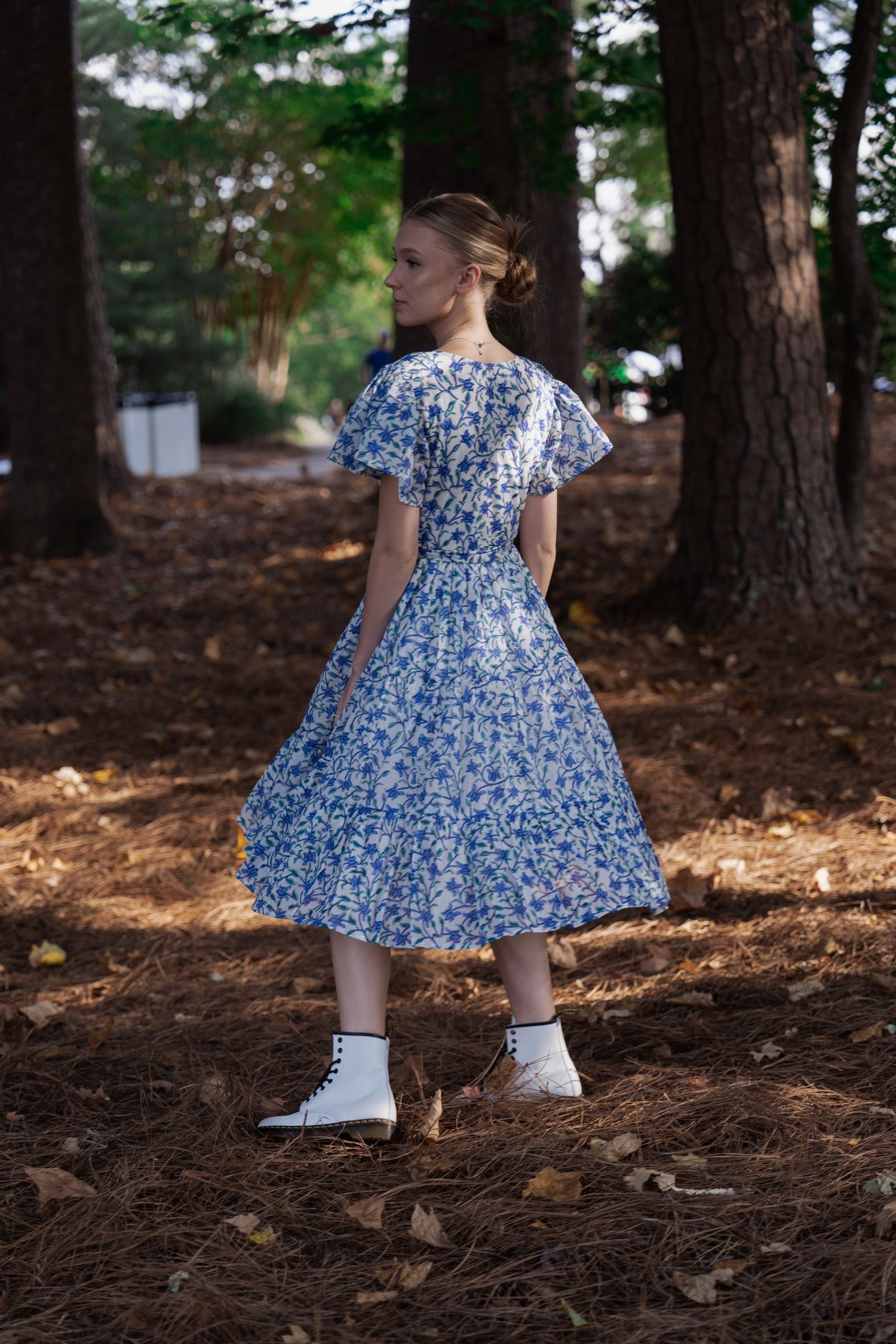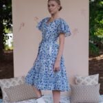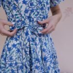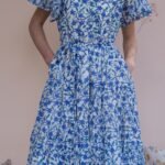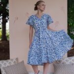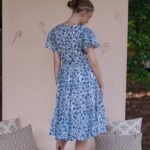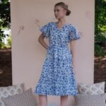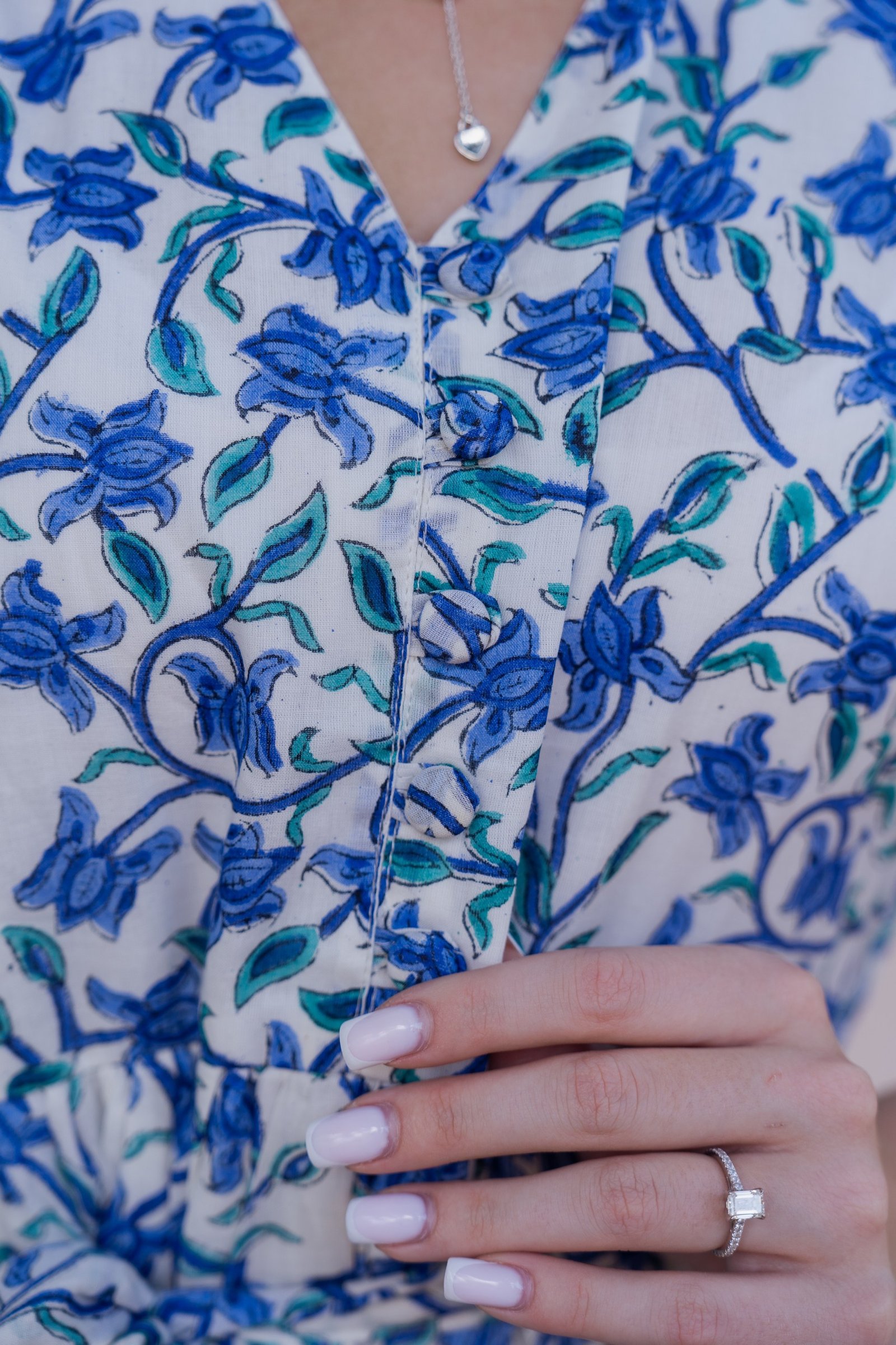 A breezy tiered cotton midi dress with flutter sleeves and hand block printed floral motif in beautiful shades of blue and soft white base. The flowy silhouette, flutter sleeves, and gathered waist create a breezy, feminine charm – perfect for a picnic day, brunch outing, or a stroll under the sun.