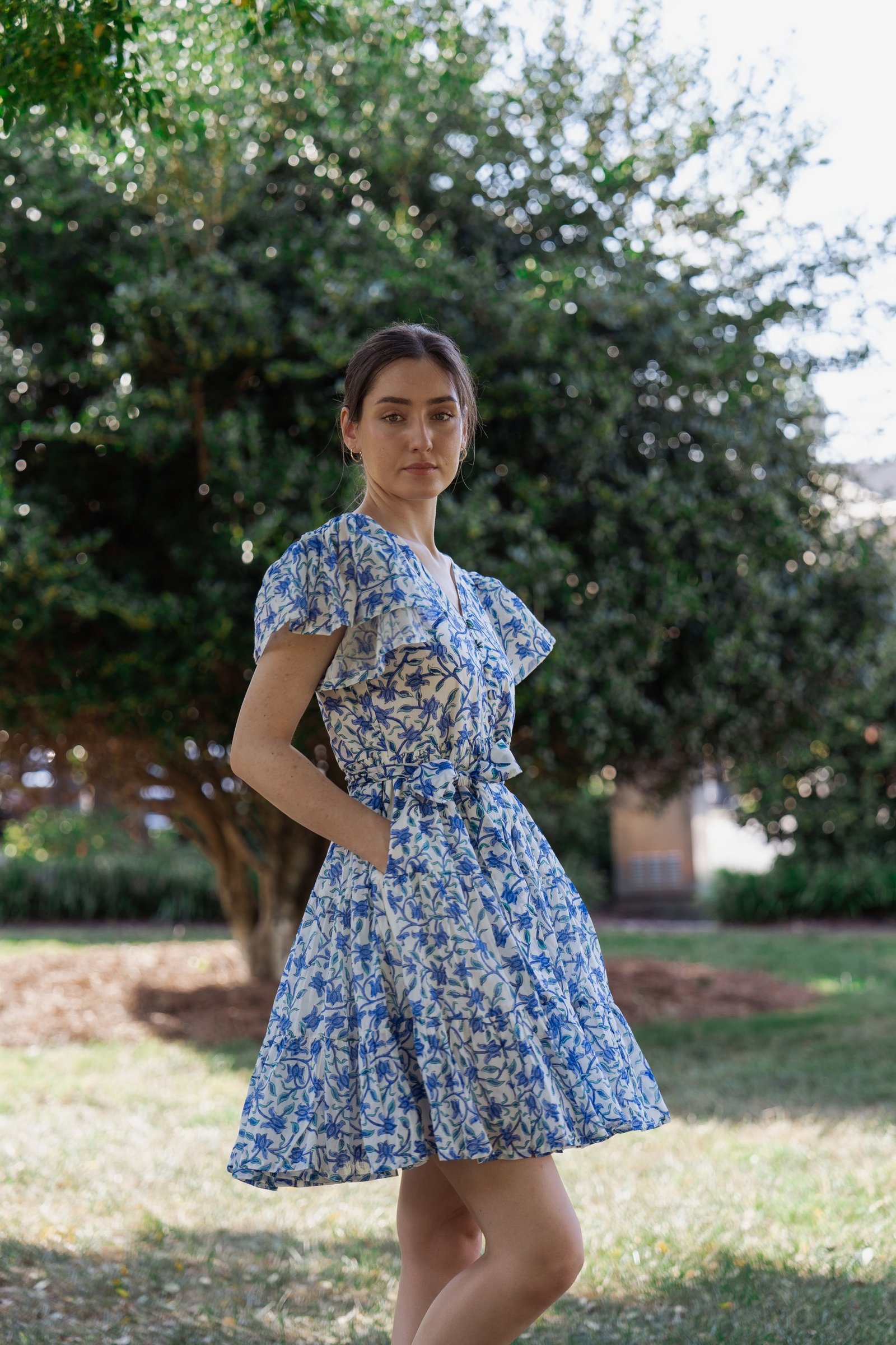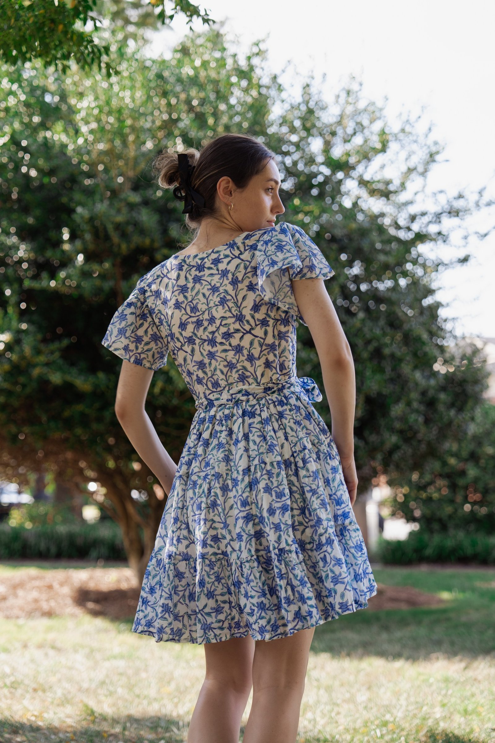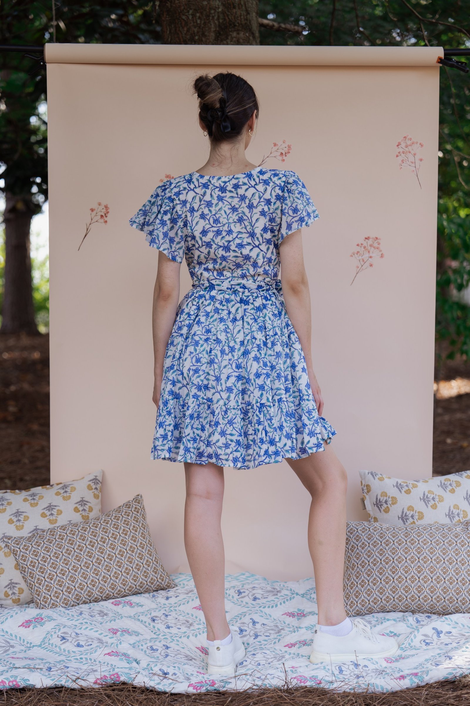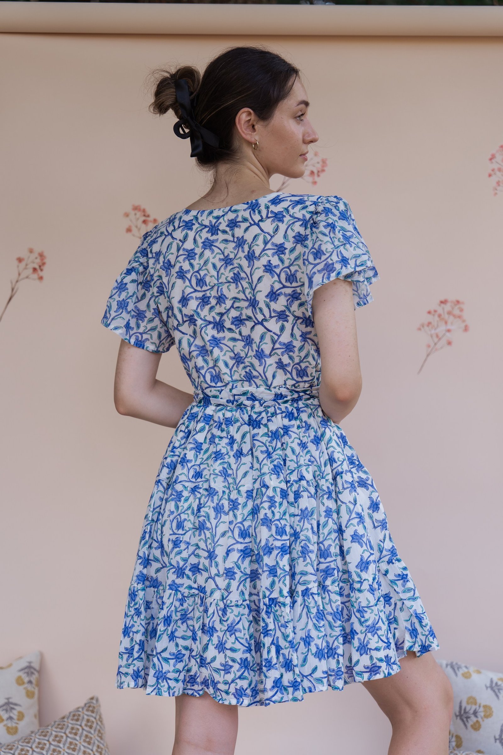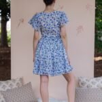 A breezy tiered cotton mini dress with flutter sleeves and hand block printed floral motif in beautiful shades of blue and soft white base. The flowy silhouette, flutter sleeves, and gathered waist create a breezy, feminine charm – perfect for a picnic day, brunch outing, or a stroll under the sun.