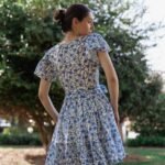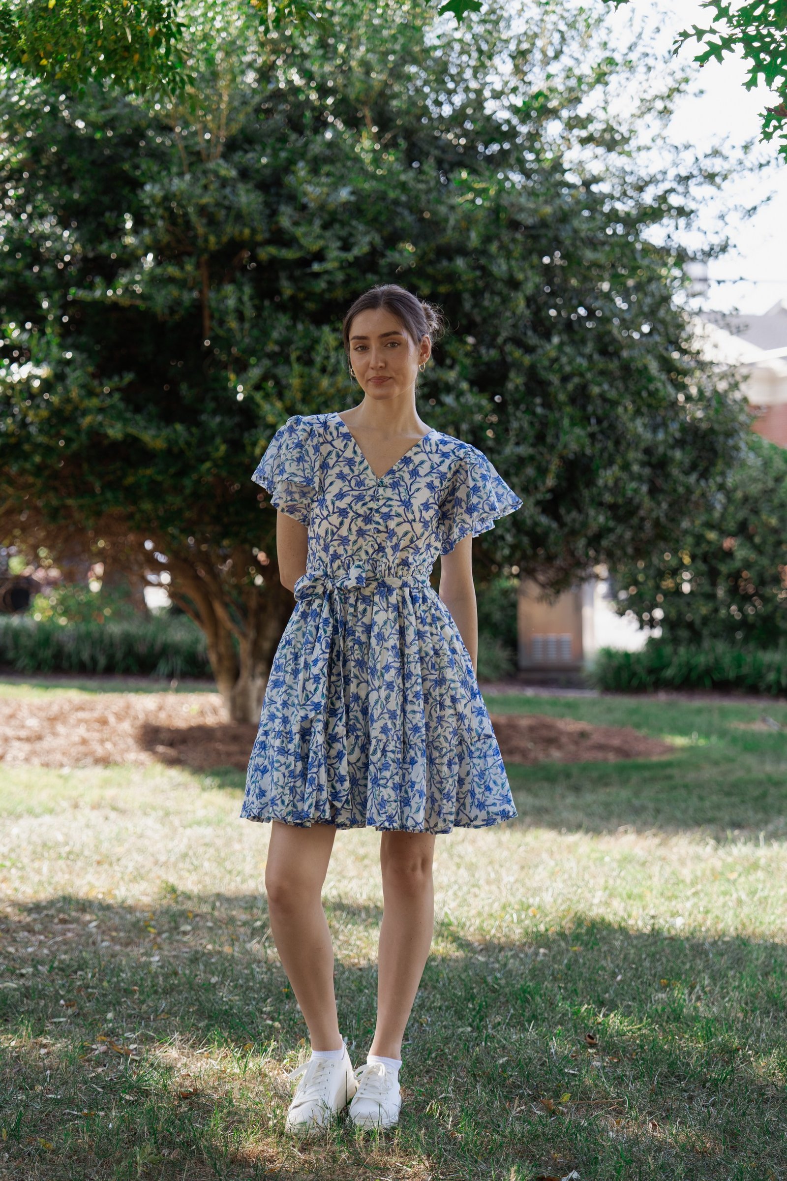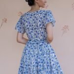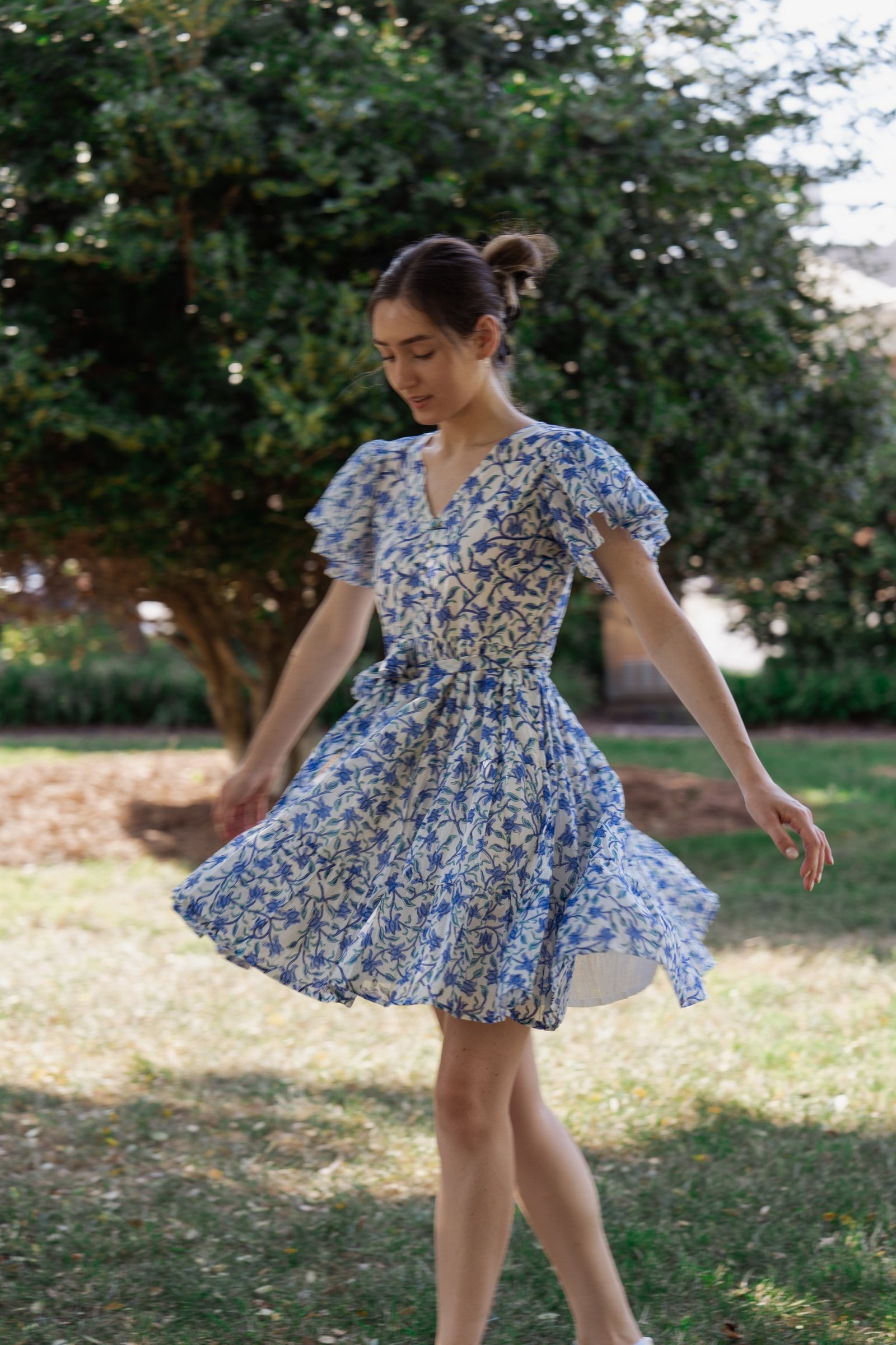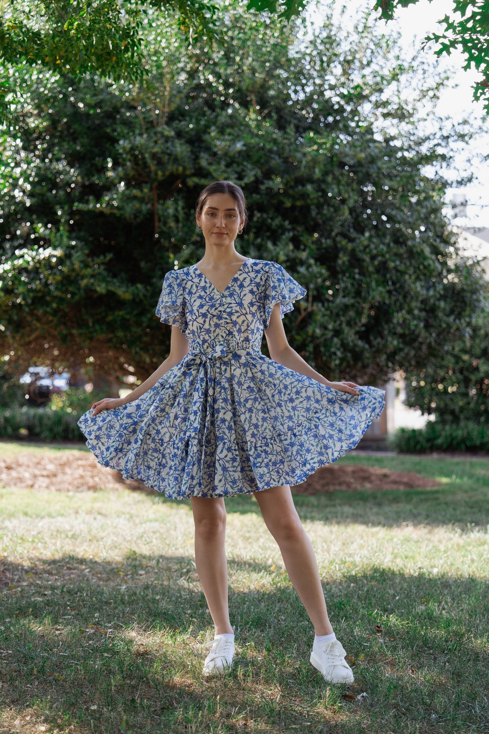 A breezy tiered cotton mini dress with flutter sleeves and hand block printed floral motif in beautiful shades of blue and soft white base. The flowy silhouette, flutter sleeves, and gathered waist create a breezy, feminine charm – perfect for a picnic day, brunch outing, or a stroll under the sun.