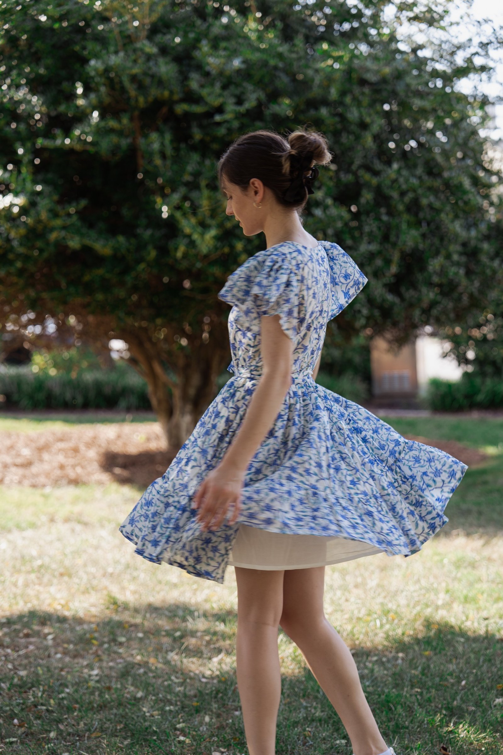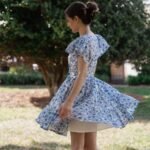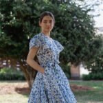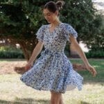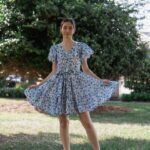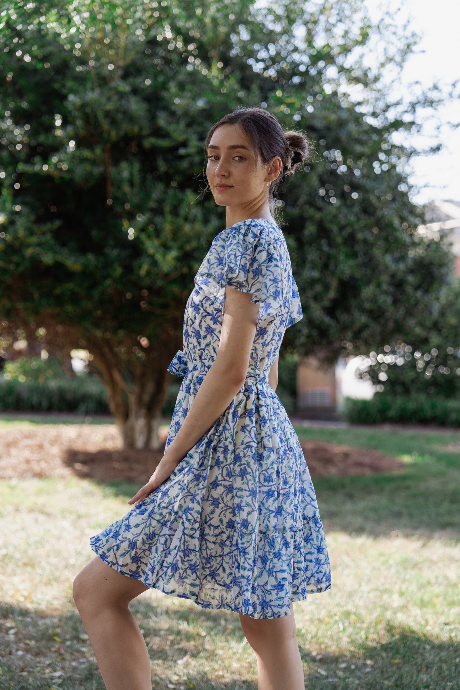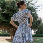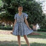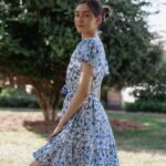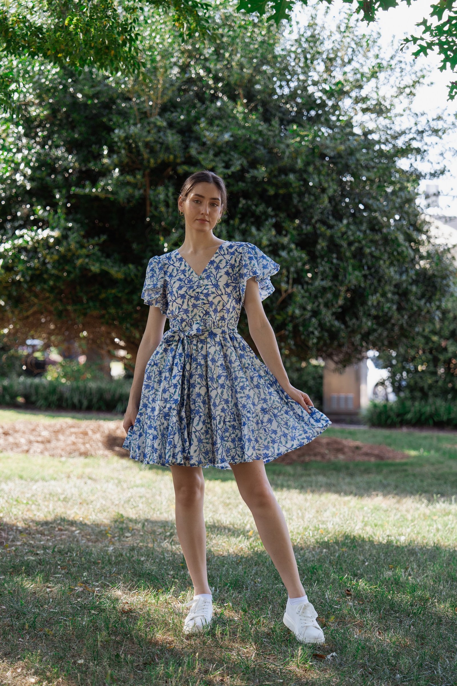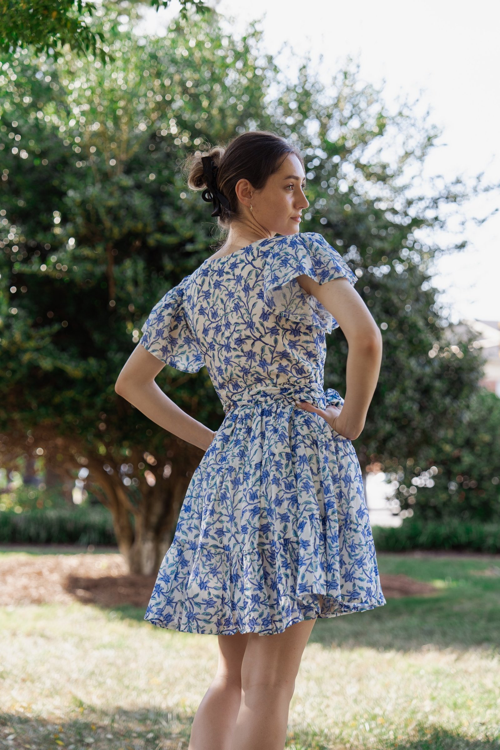 A breezy tiered cotton mini dress with flutter sleeves and hand block printed floral motif in beautiful shades of blue and soft white base. The flowy silhouette, flutter sleeves, and gathered waist create a breezy, feminine charm – perfect for a picnic day, brunch outing, or a stroll under the sun.