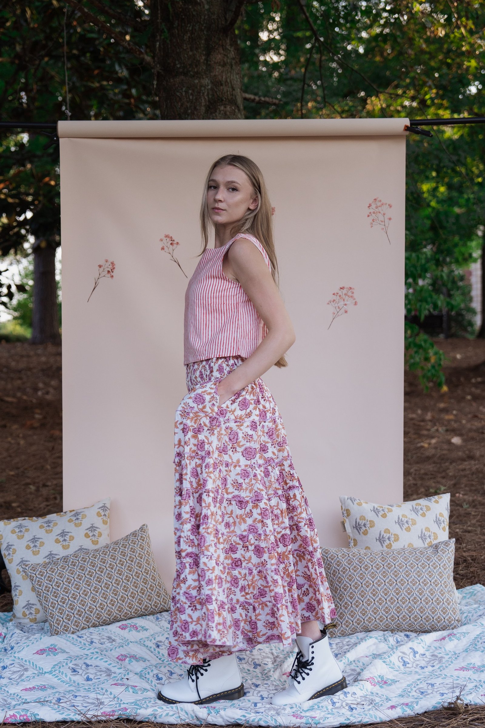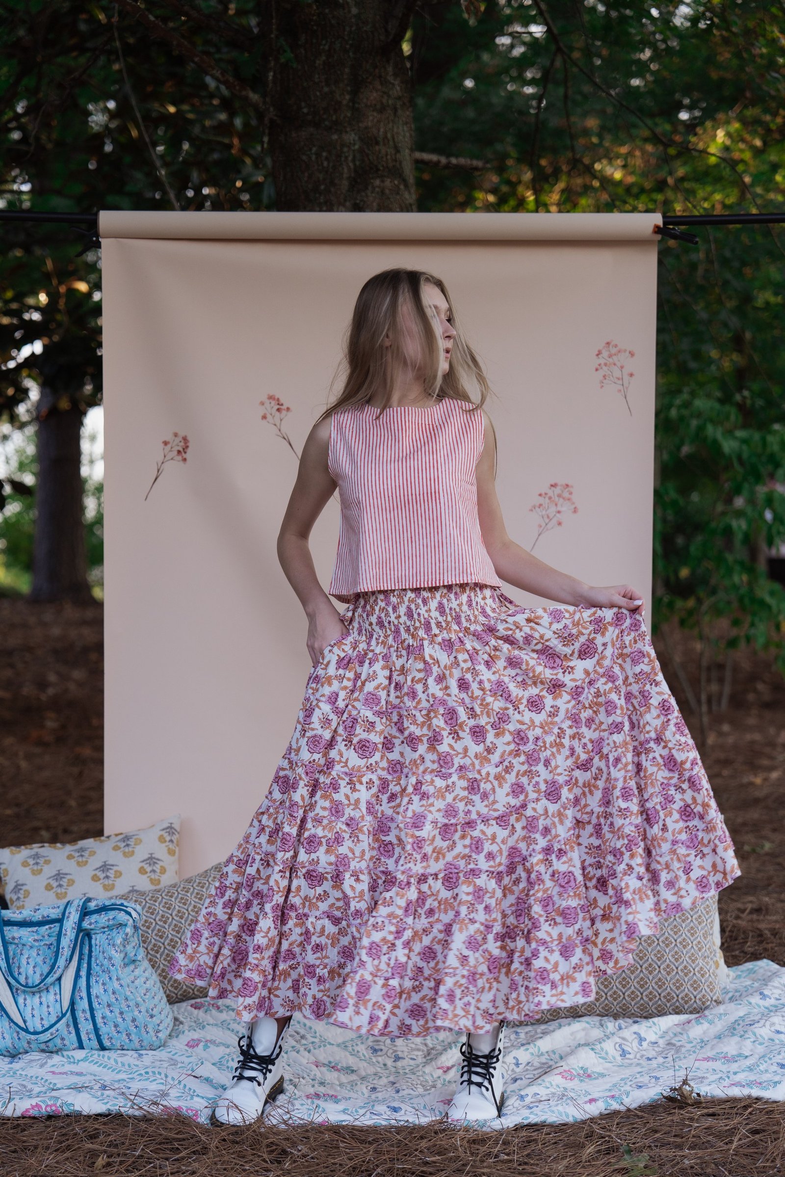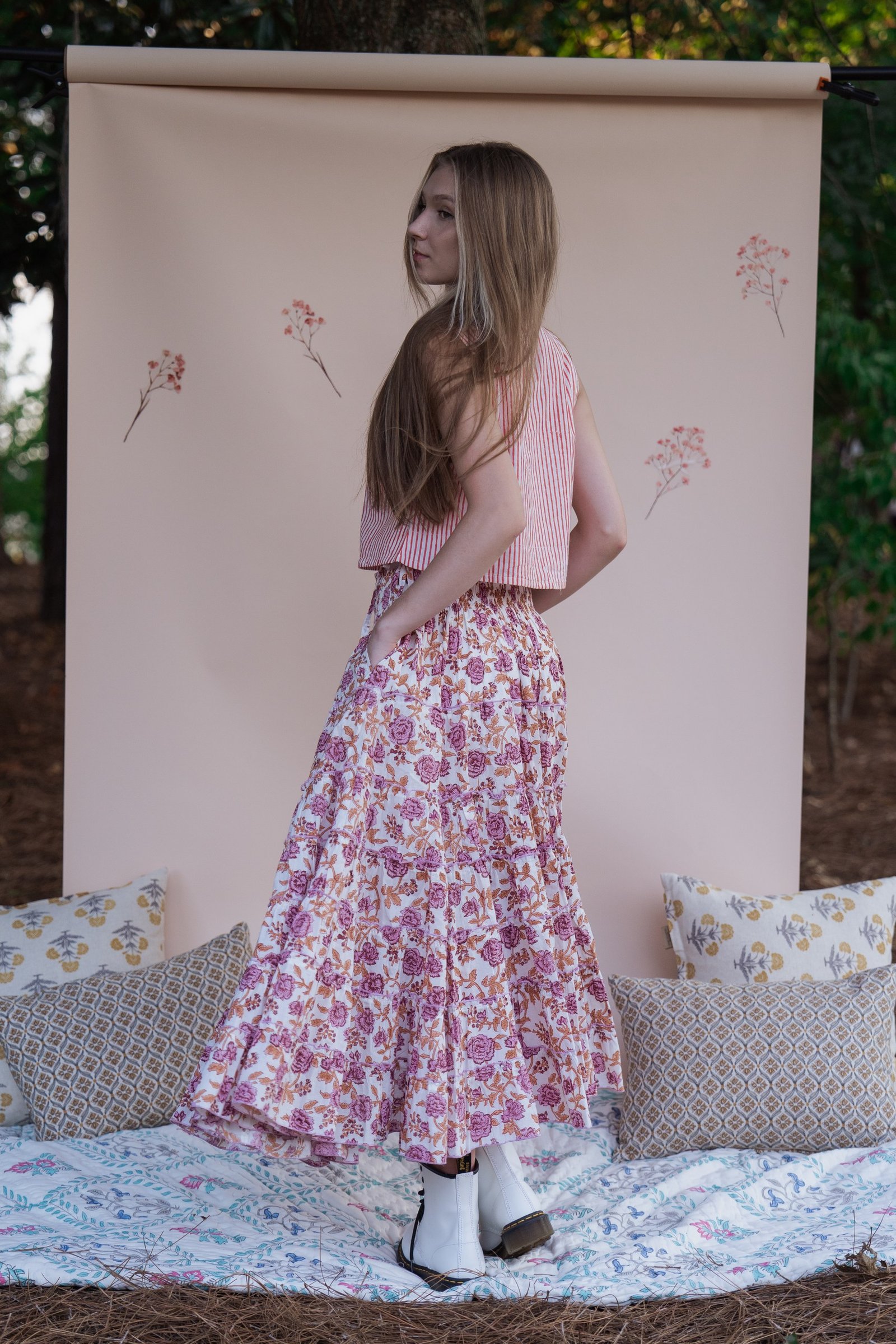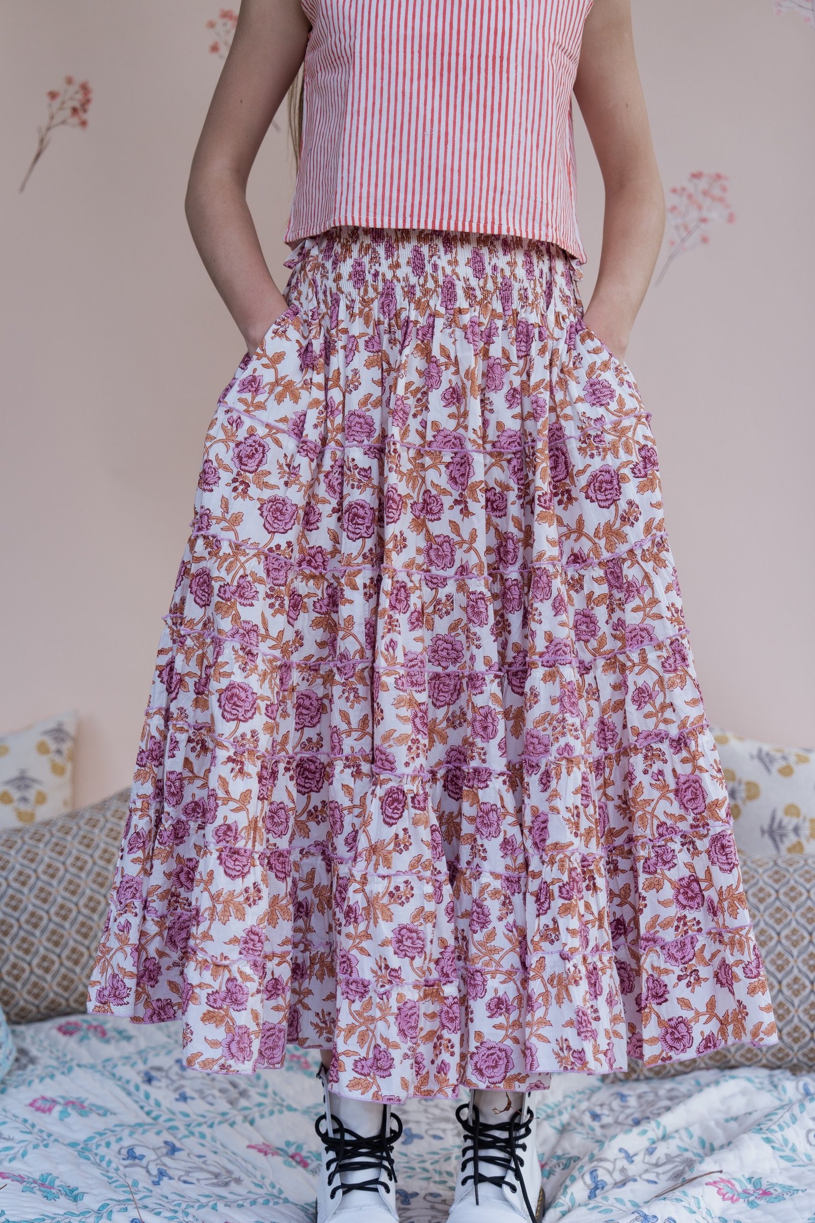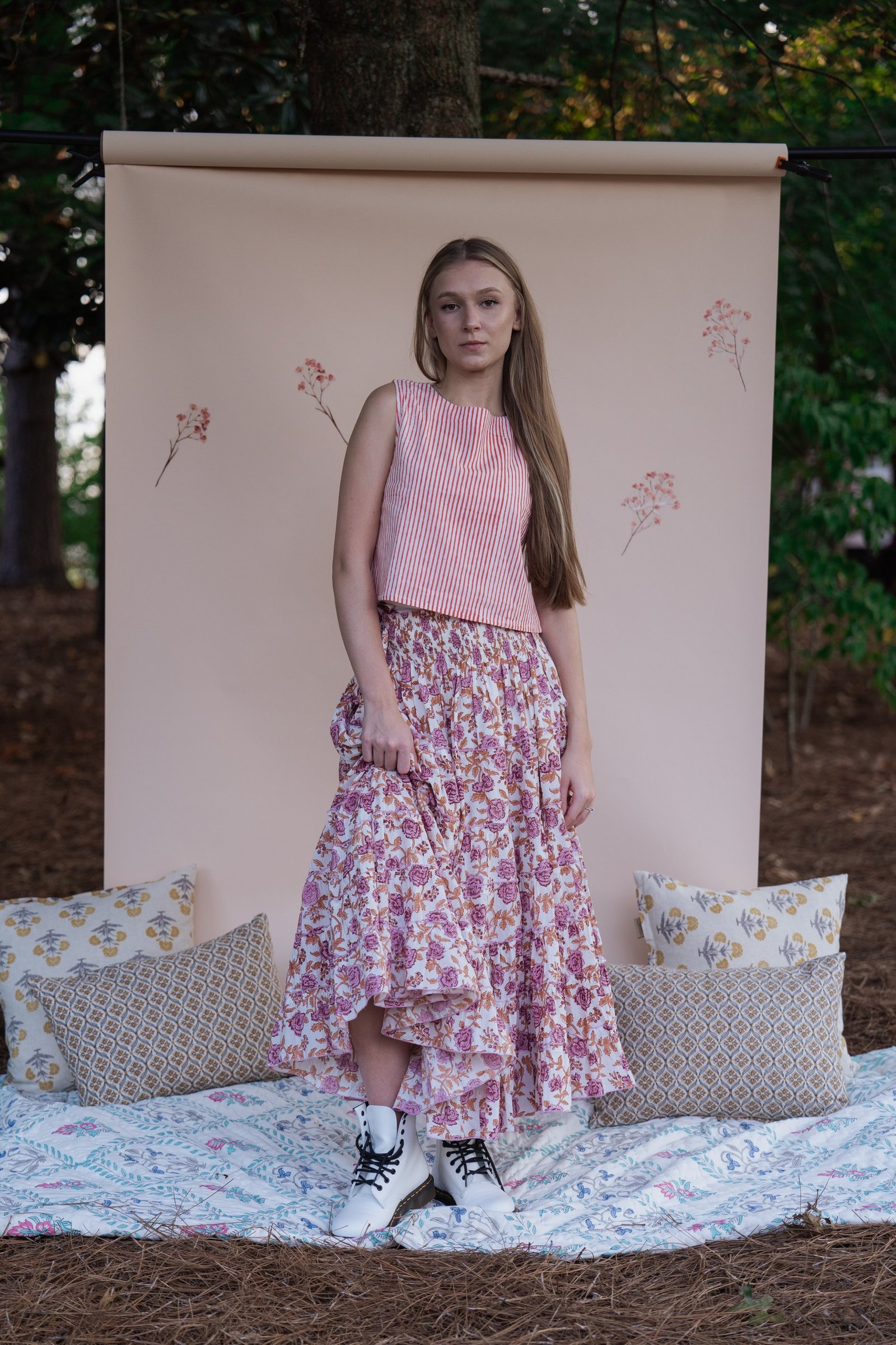 Bask in sunshine and slow fashion charm with 100% cotton, this flowy skirt/dress features a soft white base adorned with delicate rose pink and marigold yellow blooms, hand-block printed by skilled artisans.