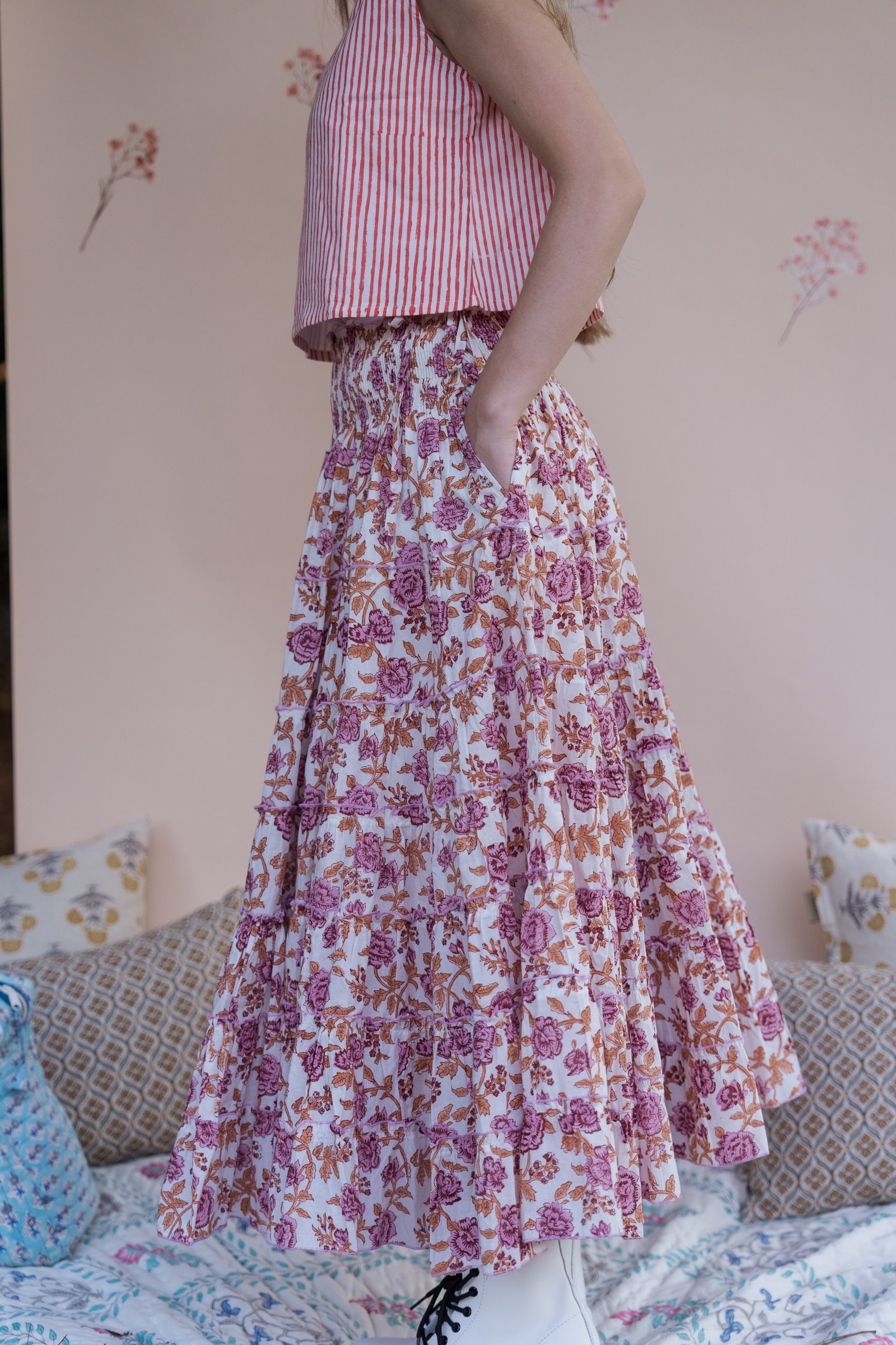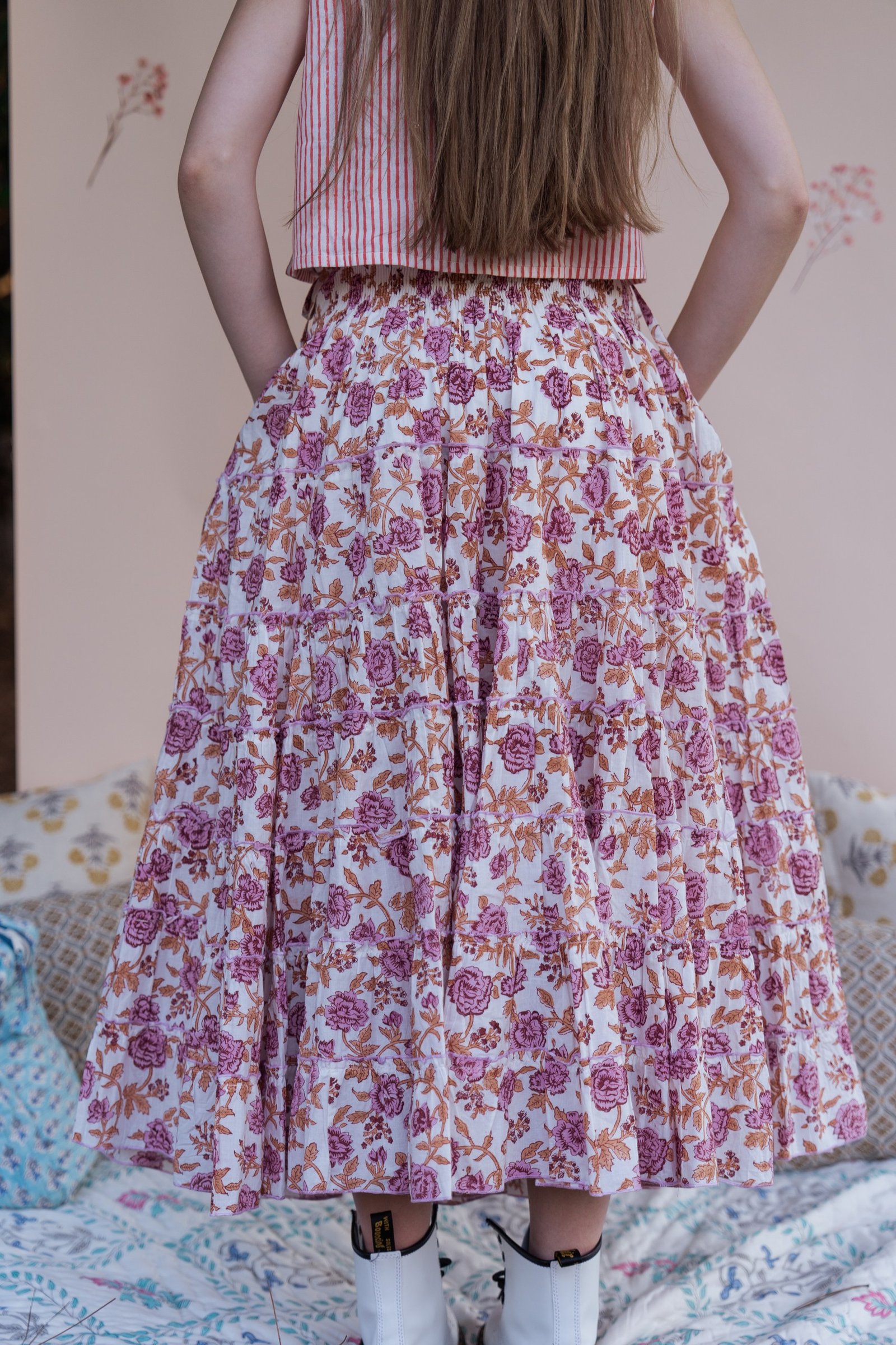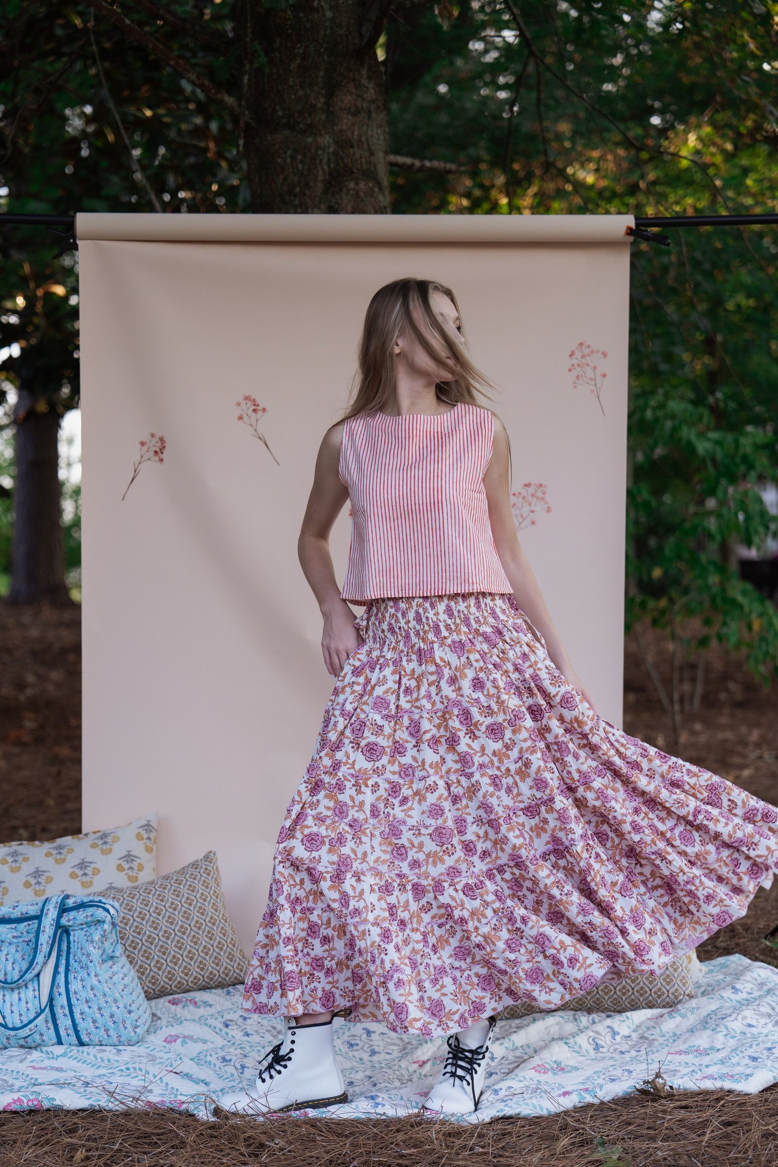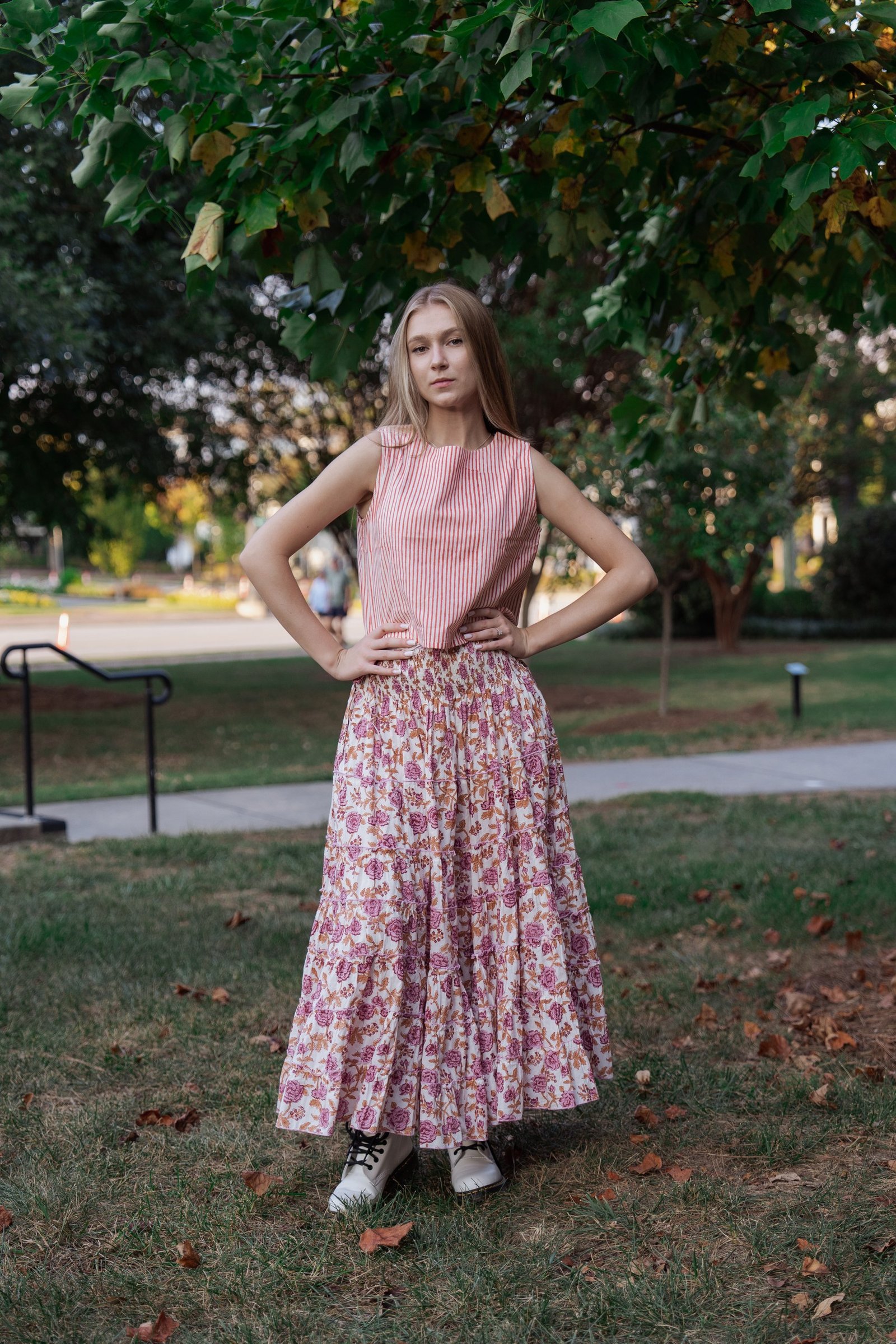 Bask in sunshine and slow fashion charm with 100% cotton, this flowy skirt/dress features a soft white base adorned with delicate rose pink and marigold yellow blooms, hand-block printed by skilled artisans.