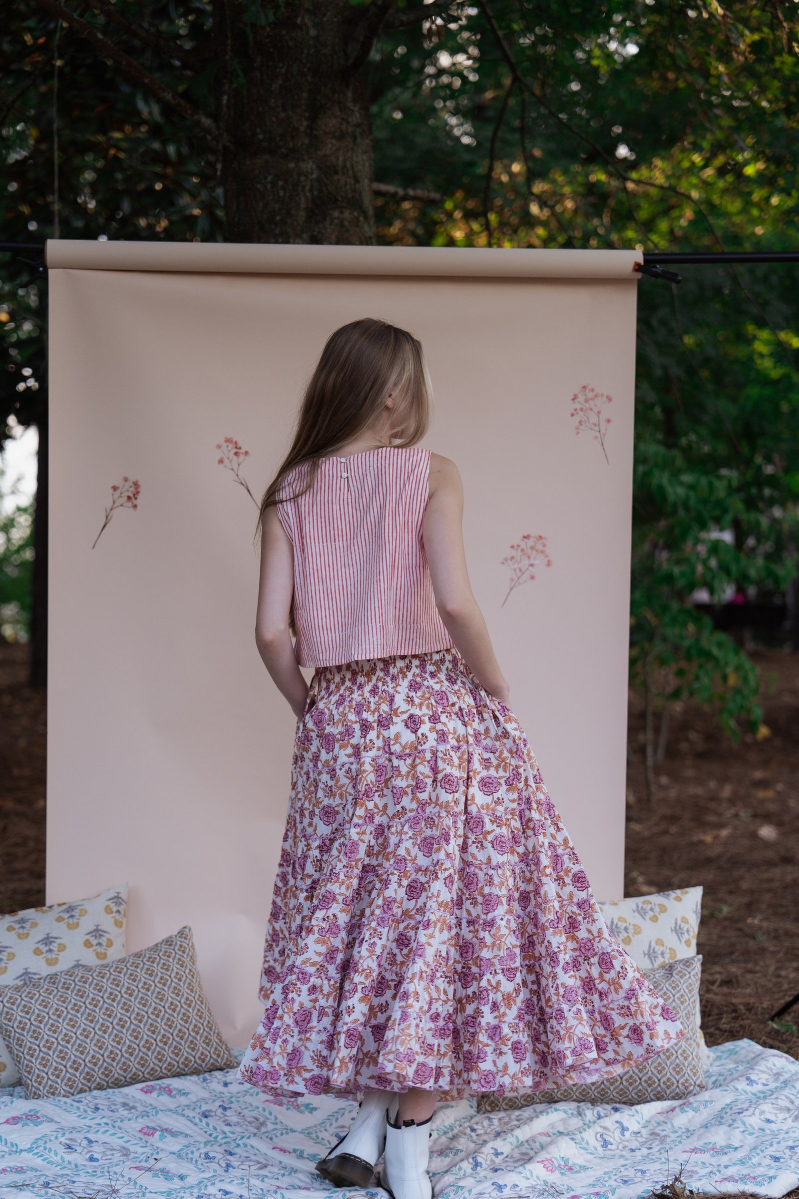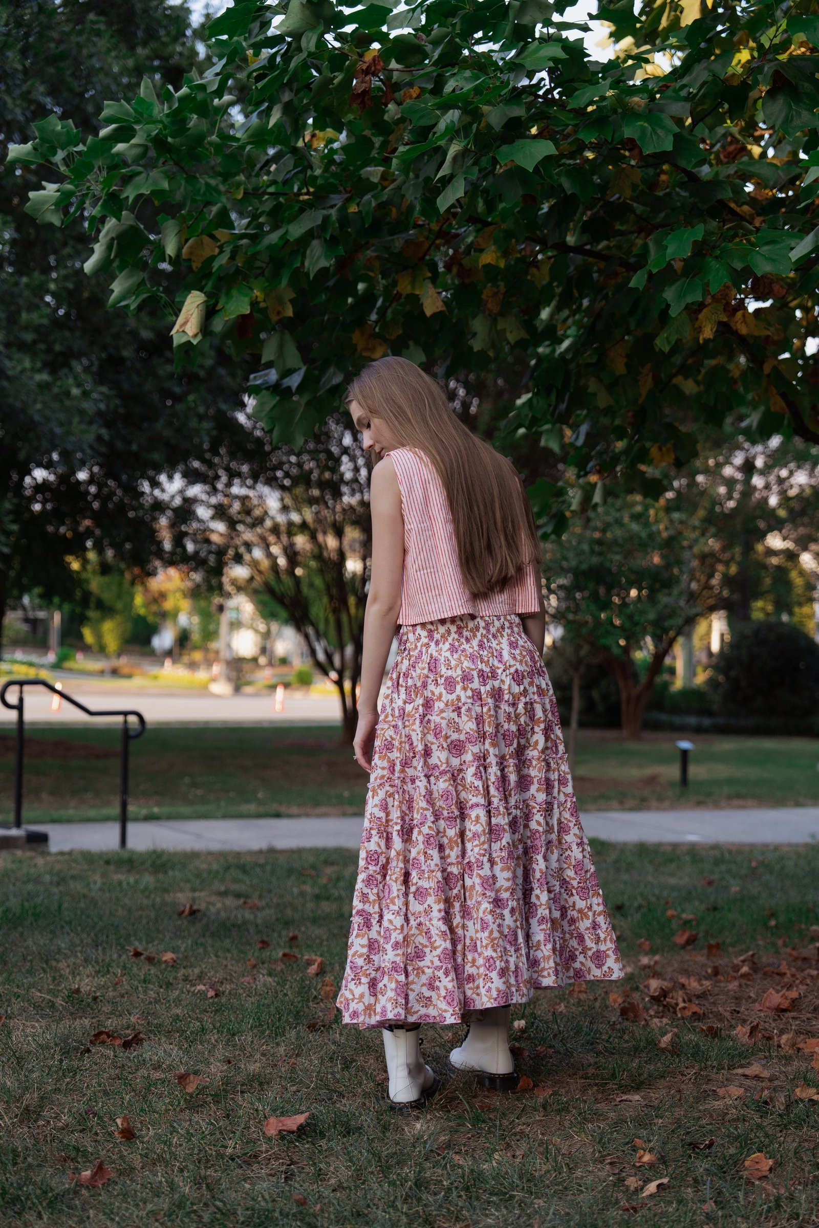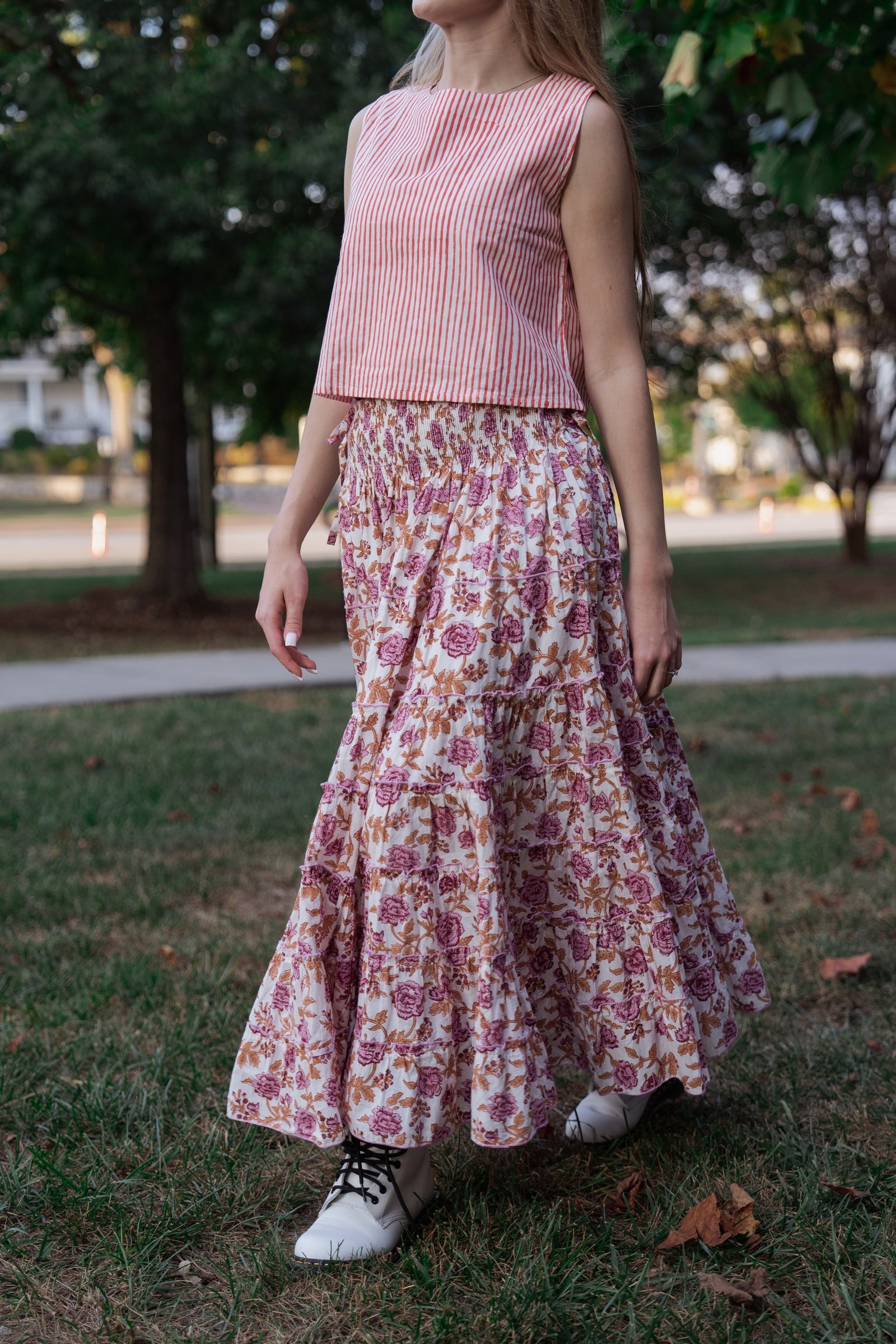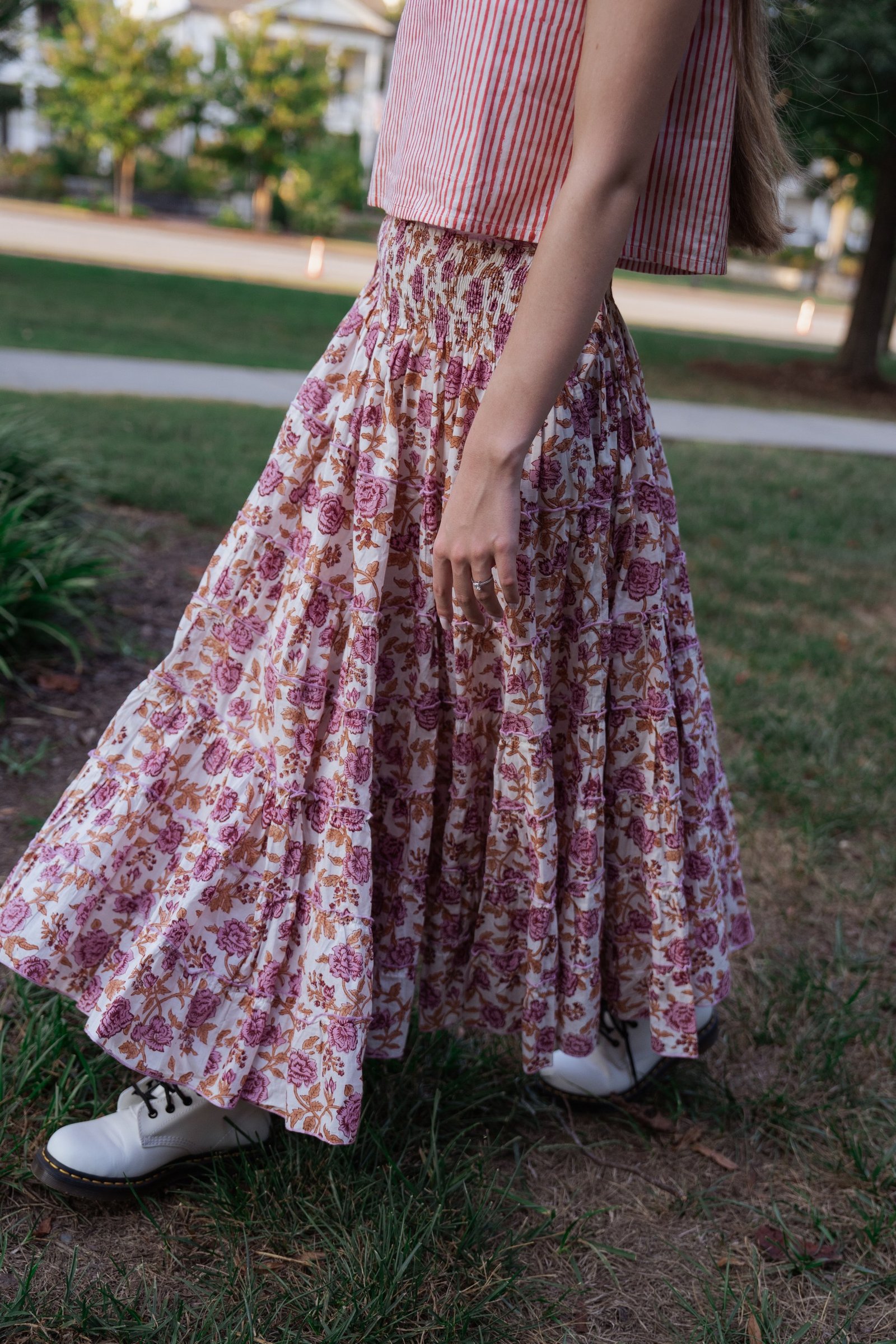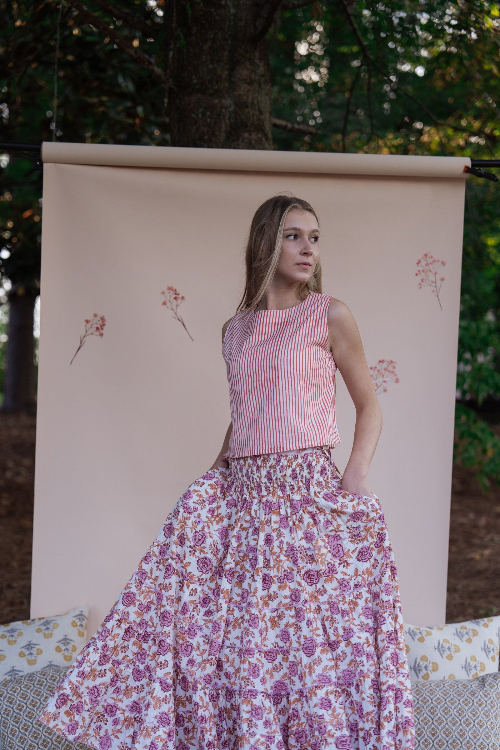 Bask in sunshine and slow fashion charm with 100% cotton, this flowy skirt/dress features a soft white base adorned with delicate rose pink and marigold yellow blooms, hand-block printed by skilled artisans.