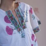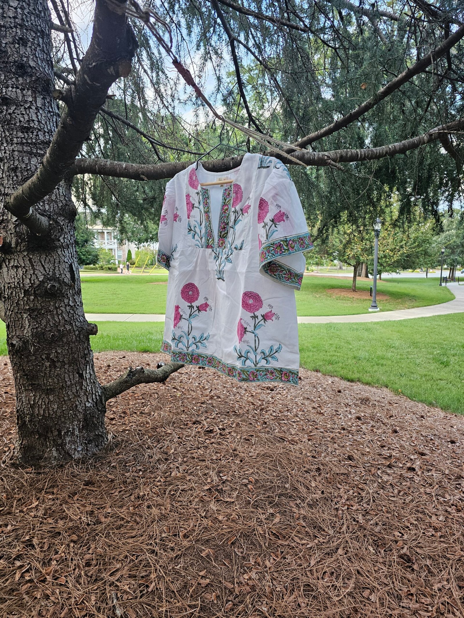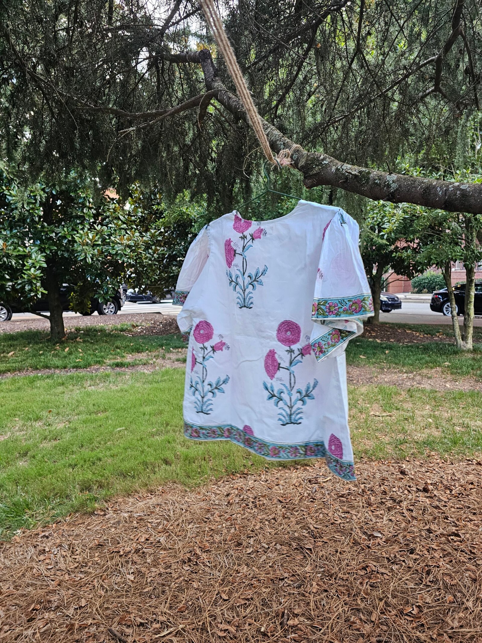 The crisp white base is beautifully decorated with blooming pink floral motifs and green-blue leafy vines, finished with a detailed floral border on the hem, sleeves, and neckline.