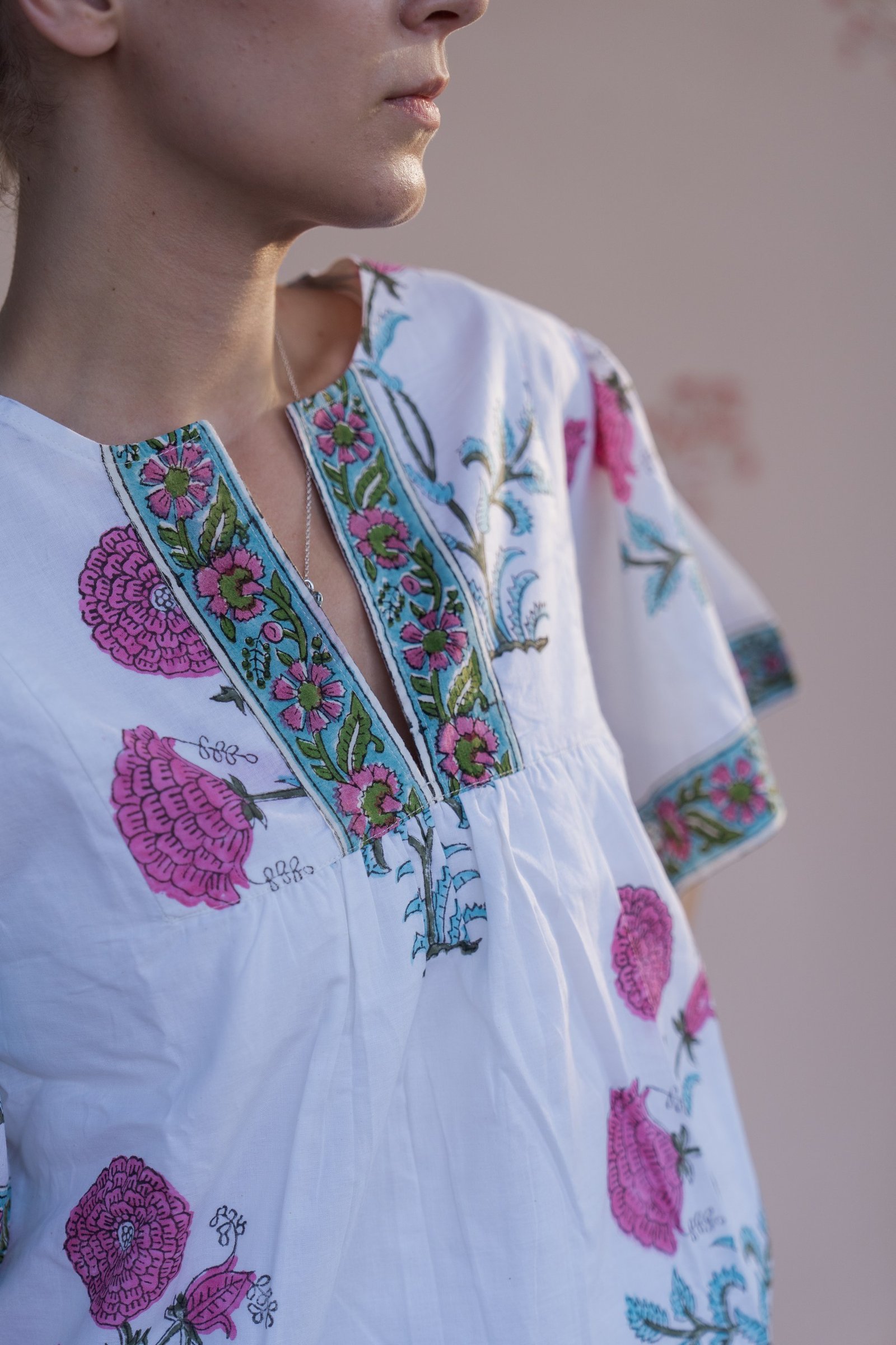 Our Gulab Bagh Top is crafted in soft cotton and adorned with traditional hand block prints.