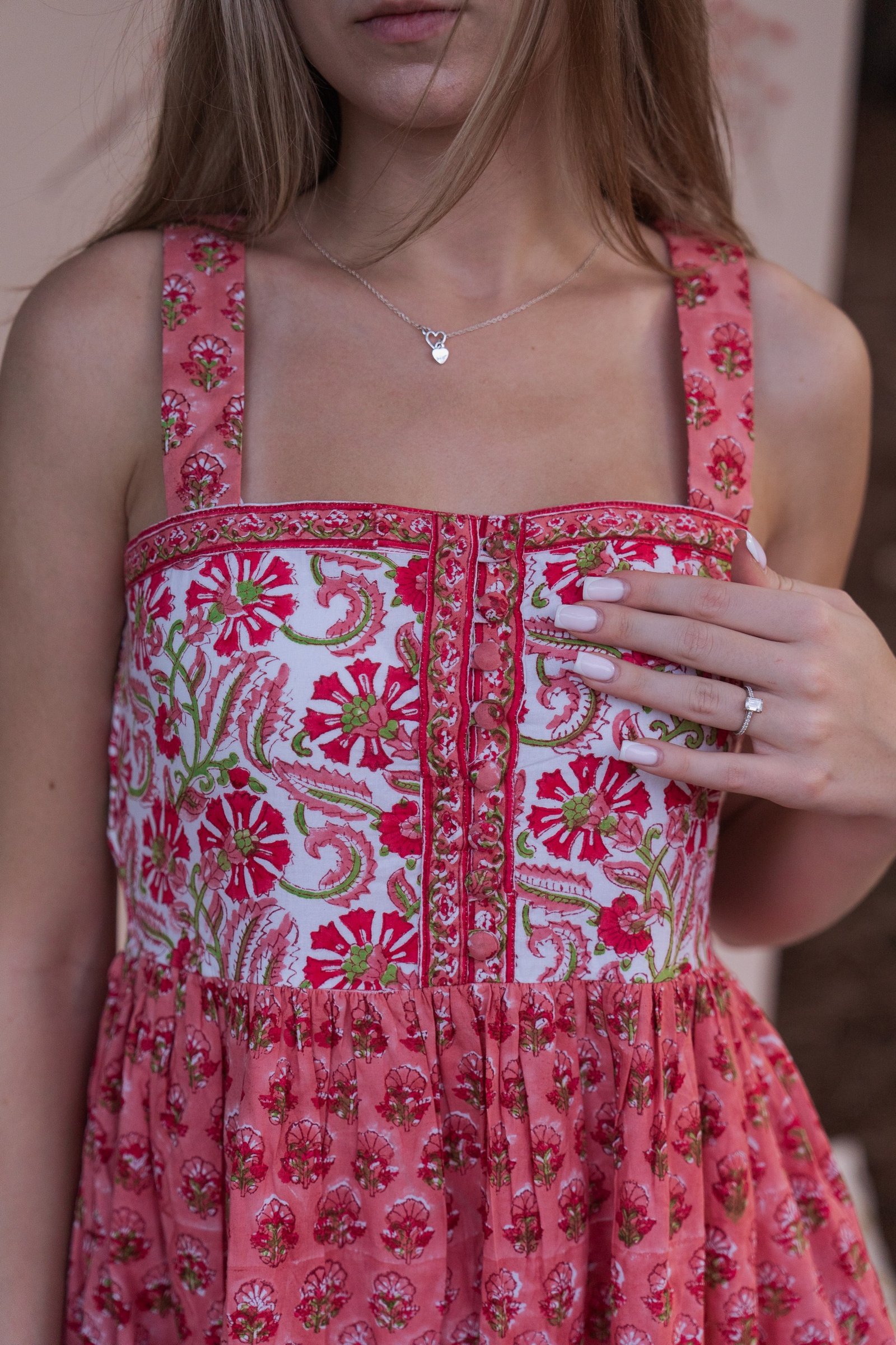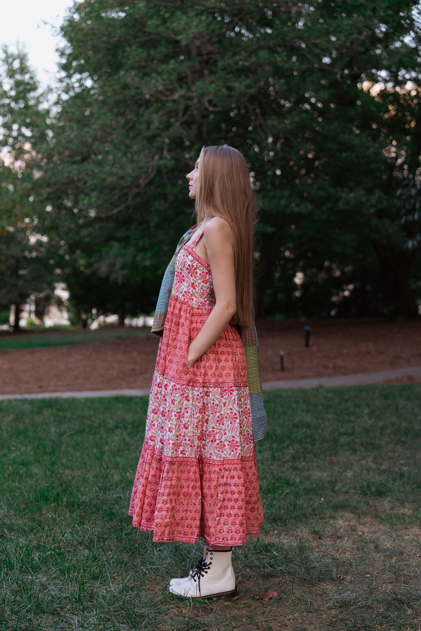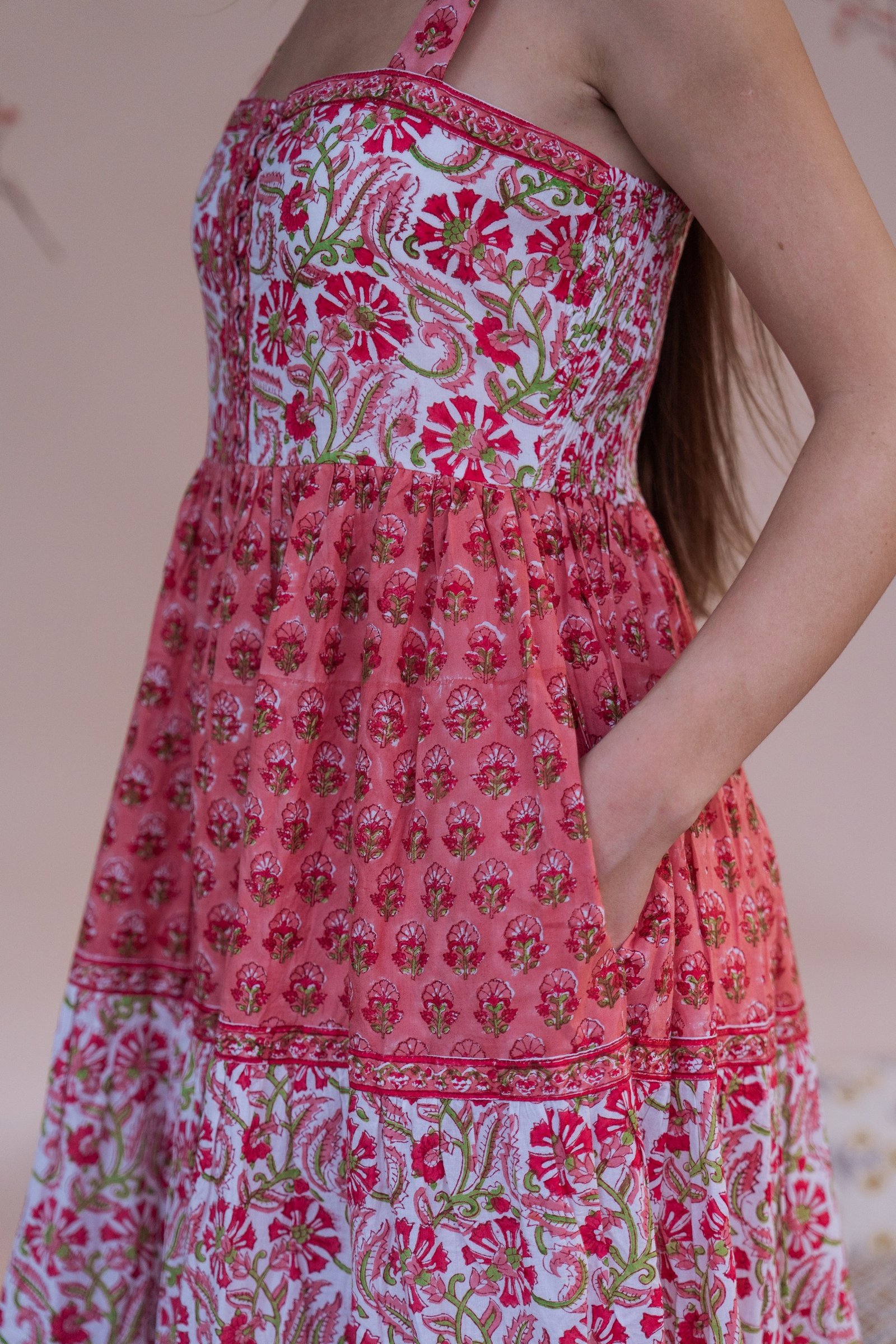 Step into summer with our Gulbahaar Maxi dress, a tiered beauty handcrafted using traditional hand block printing techniques. Featuring a flattering square neckline, broad shoulder straps, and a smocked back for comfort, this dress is a celebration of floral charm in rose pink and white hues.