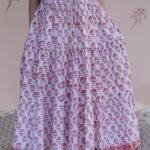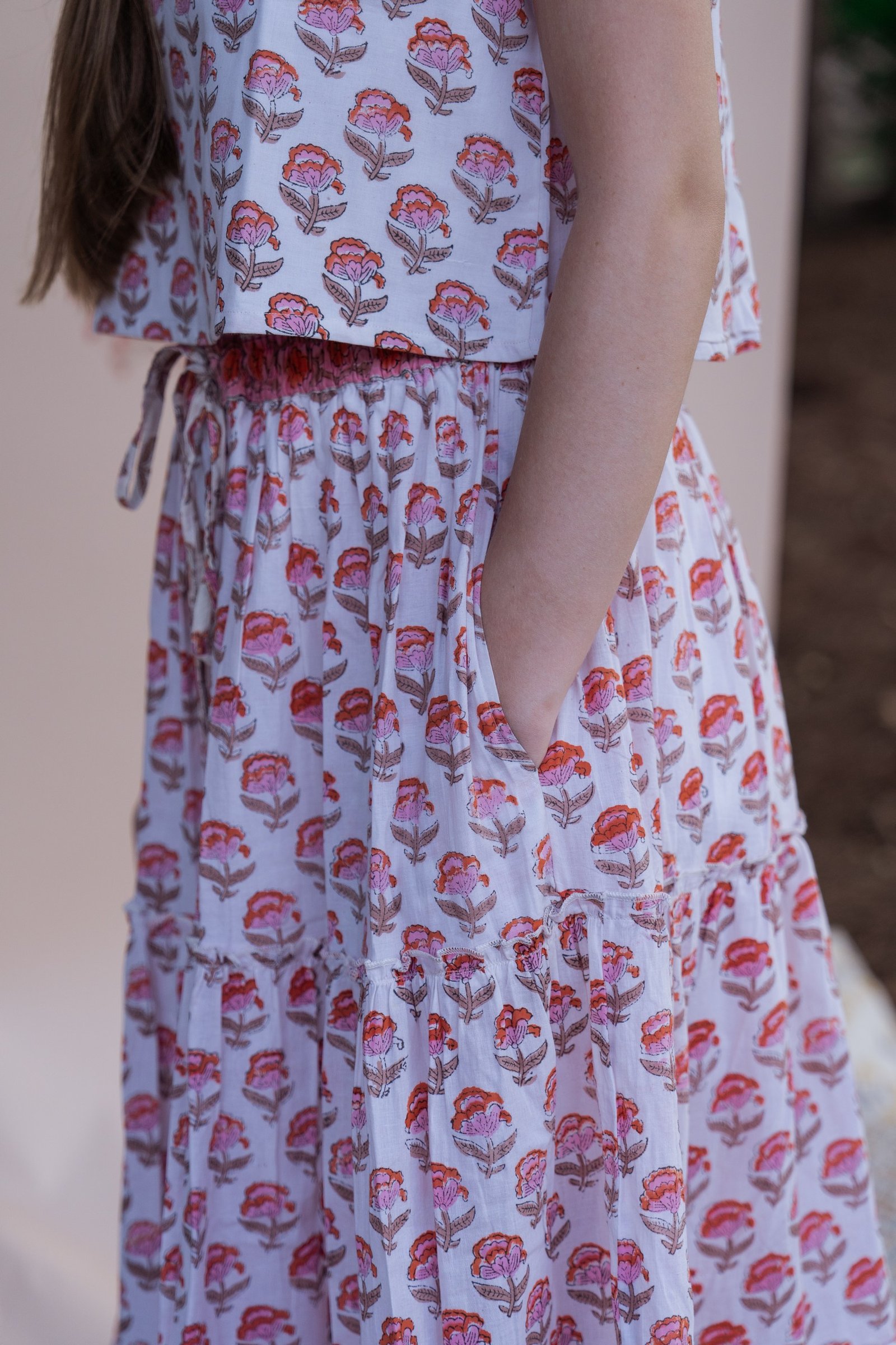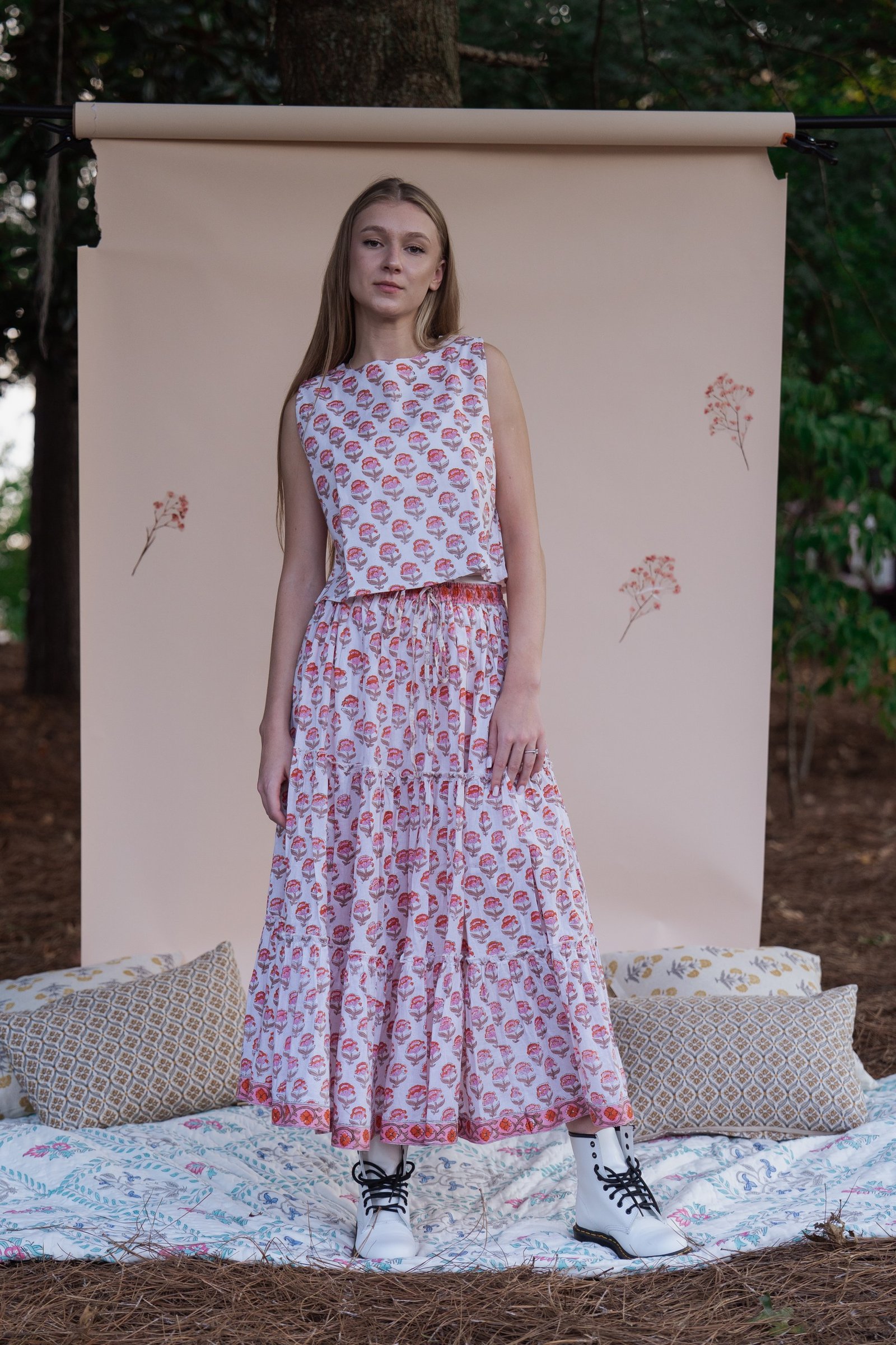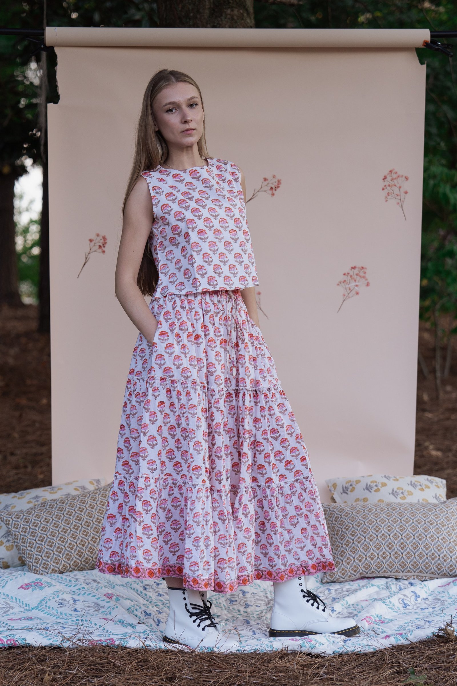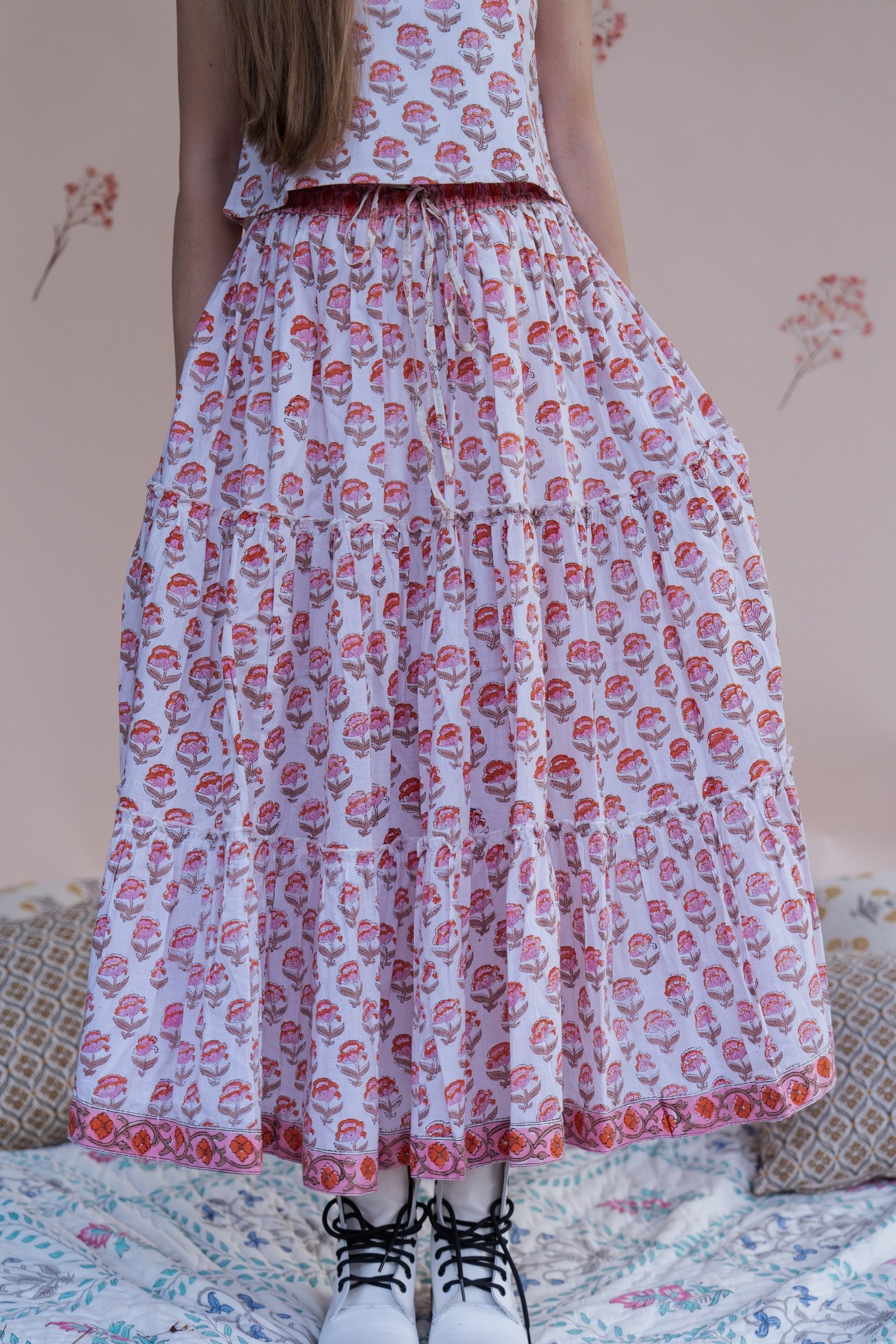 This breezy hand-block printed Tiered skirt exudes a soft, vintage charm with its delicate floral motifs in shades of pink
