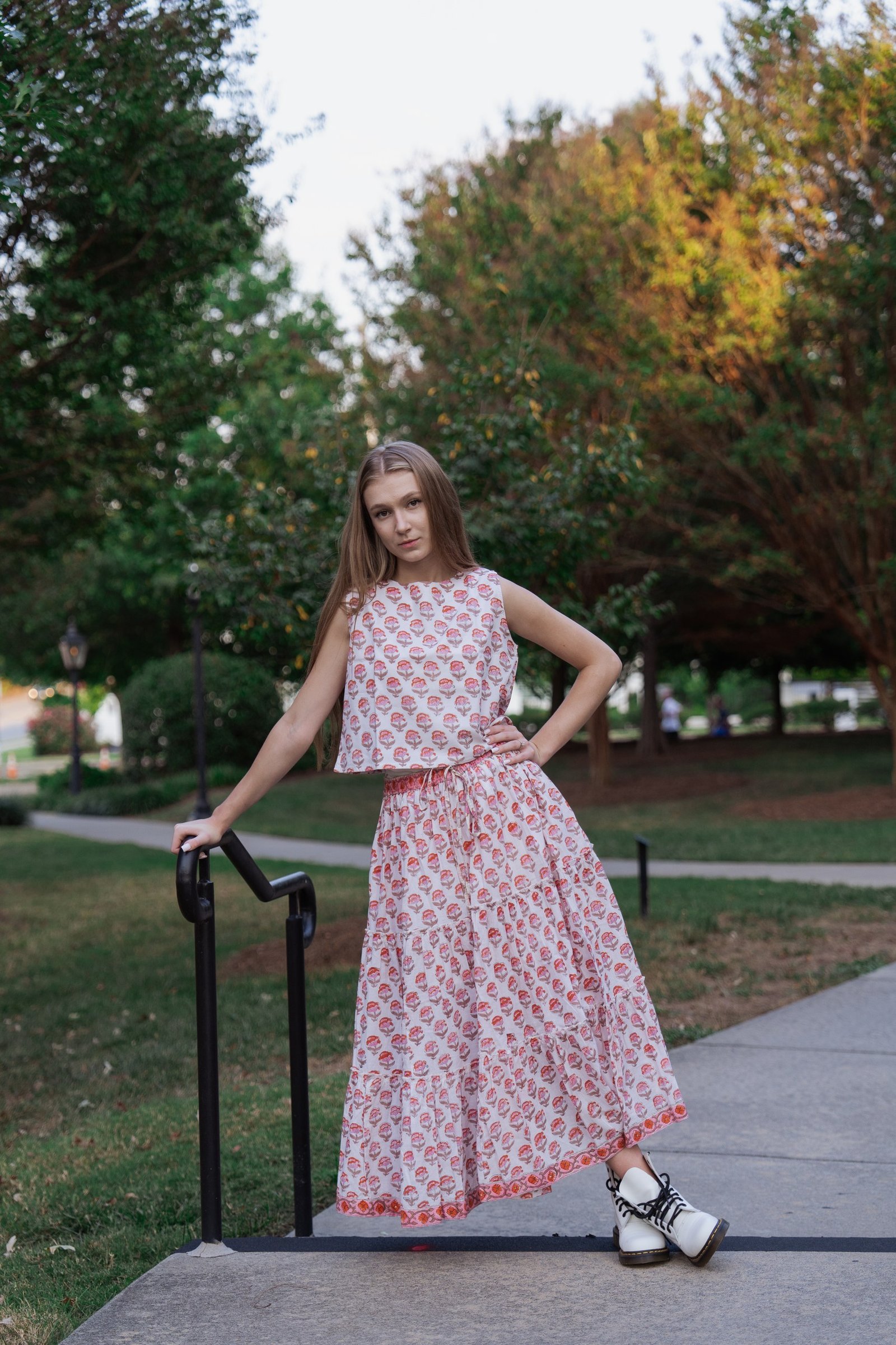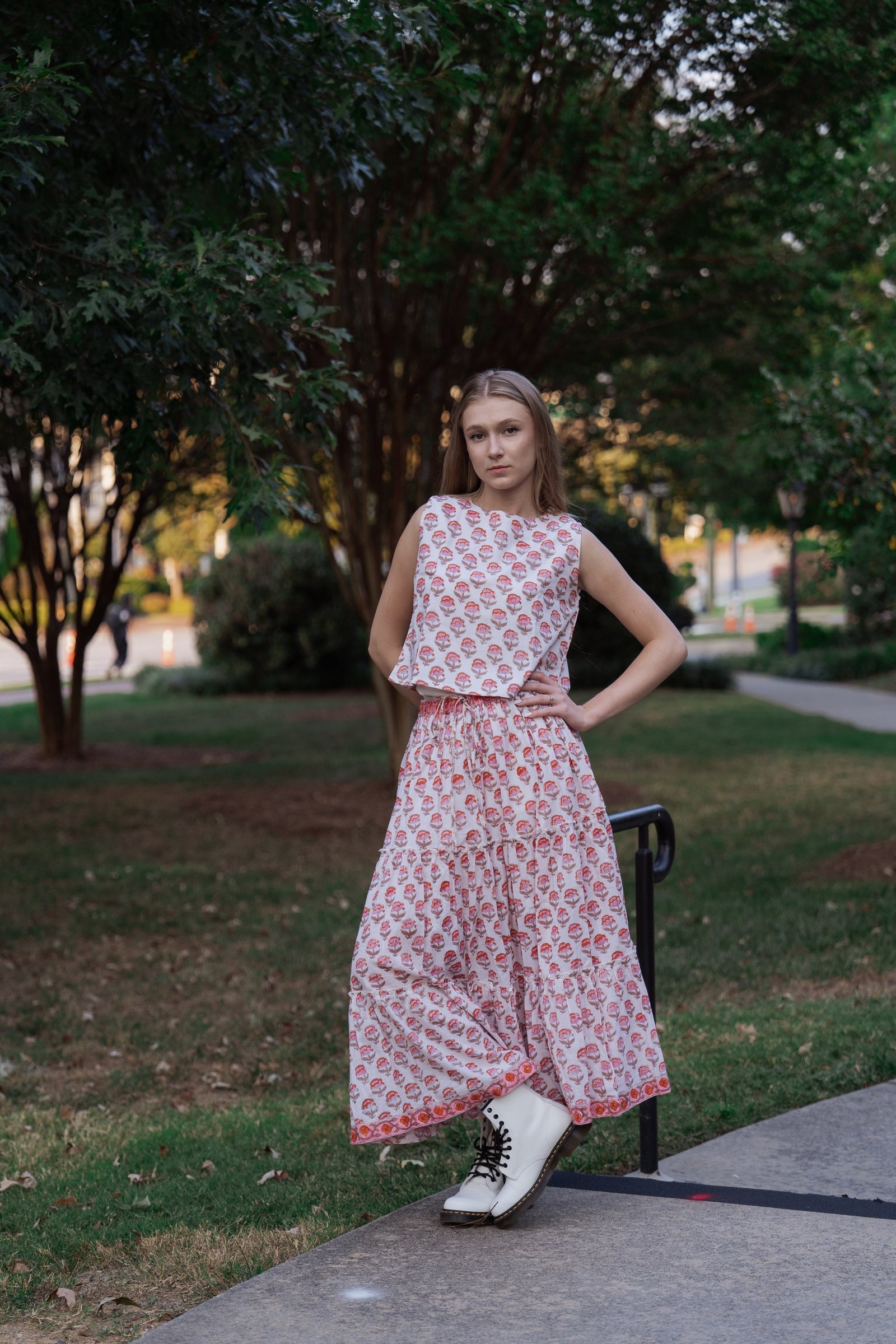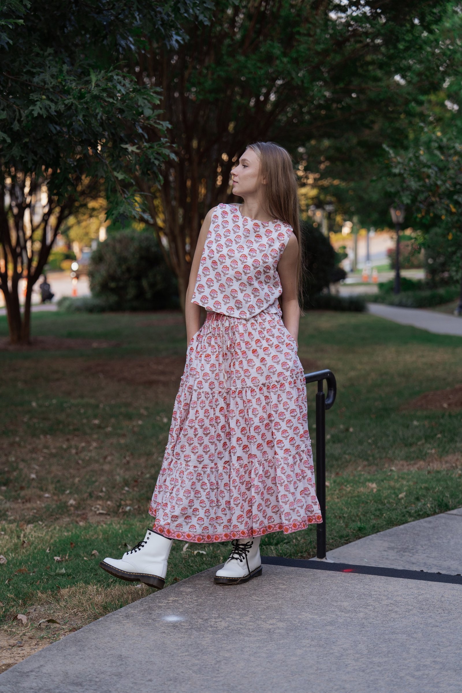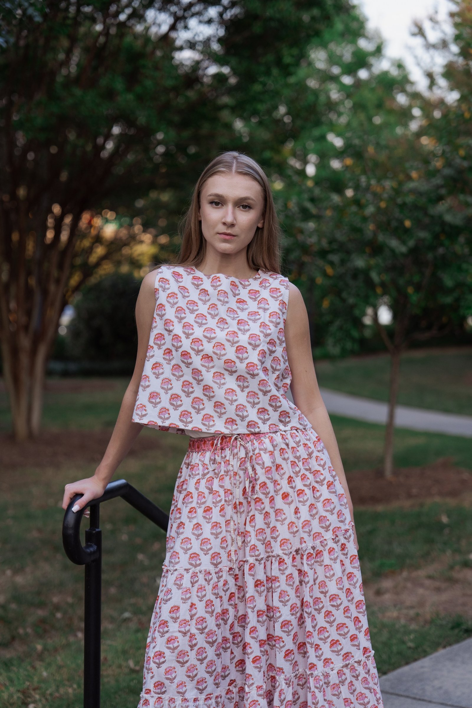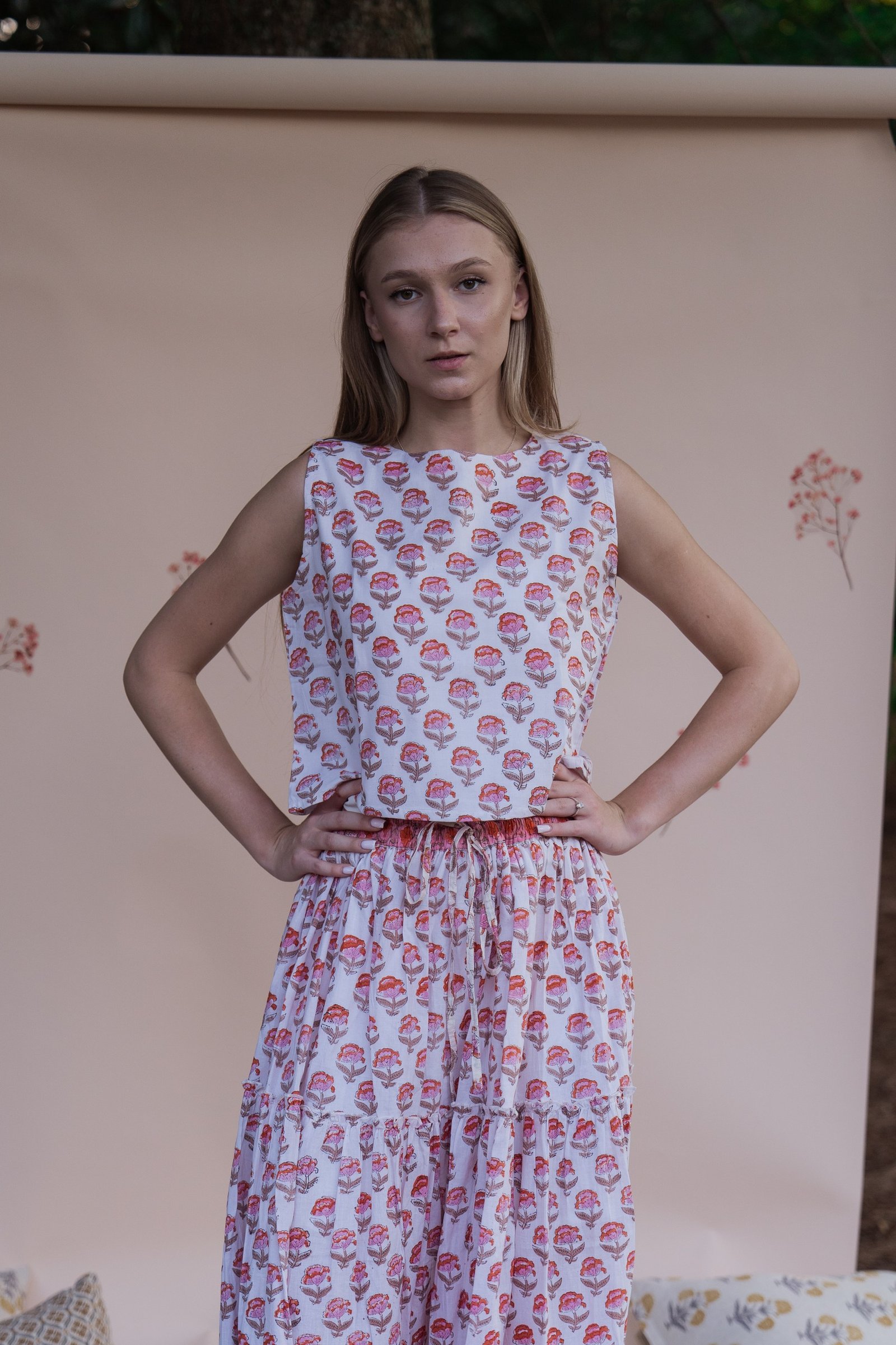 This breezy hand-block printed Tiered skirt exudes a soft, vintage charm with its delicate floral motifs in shades of pink