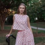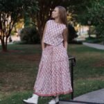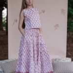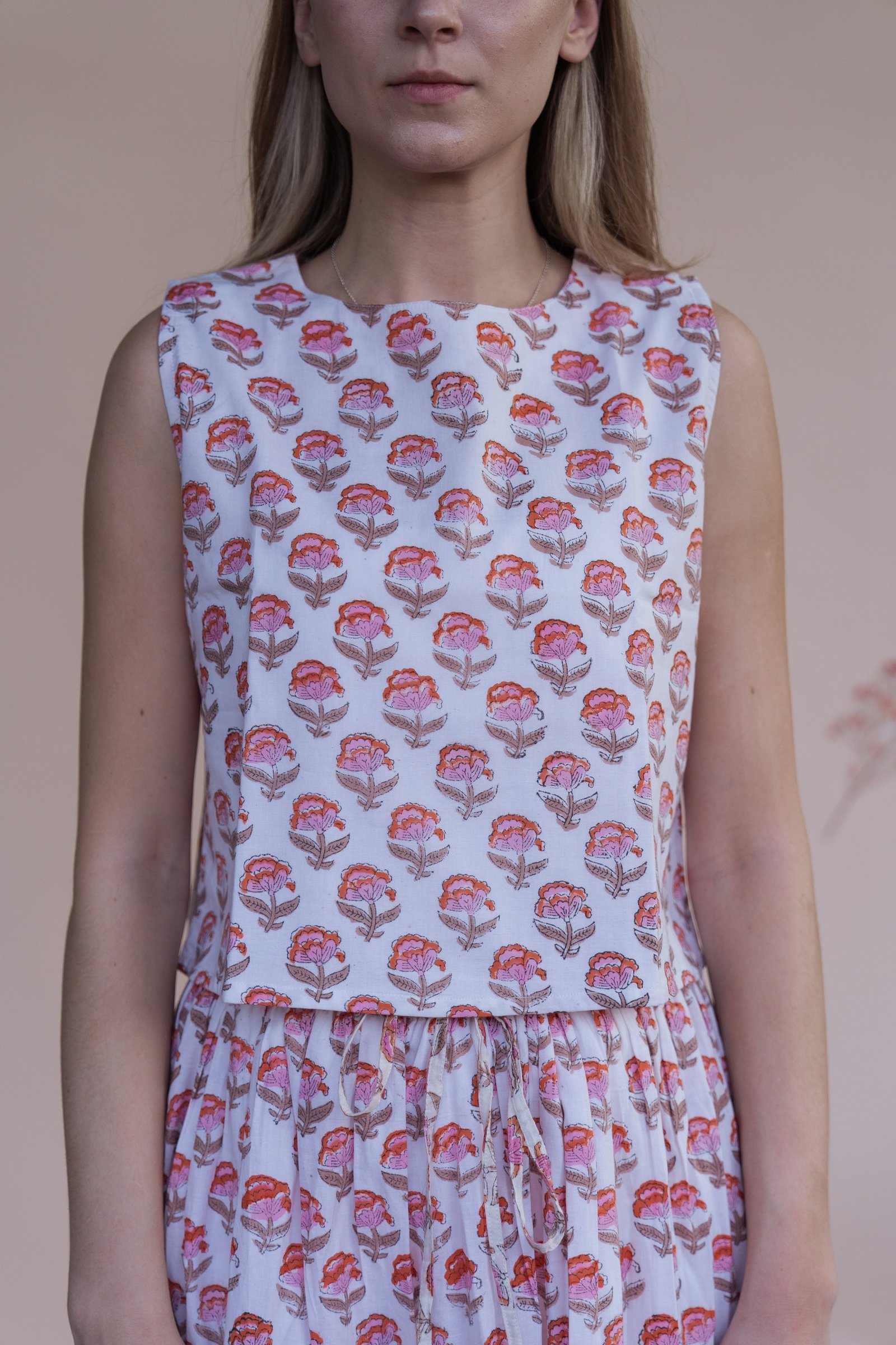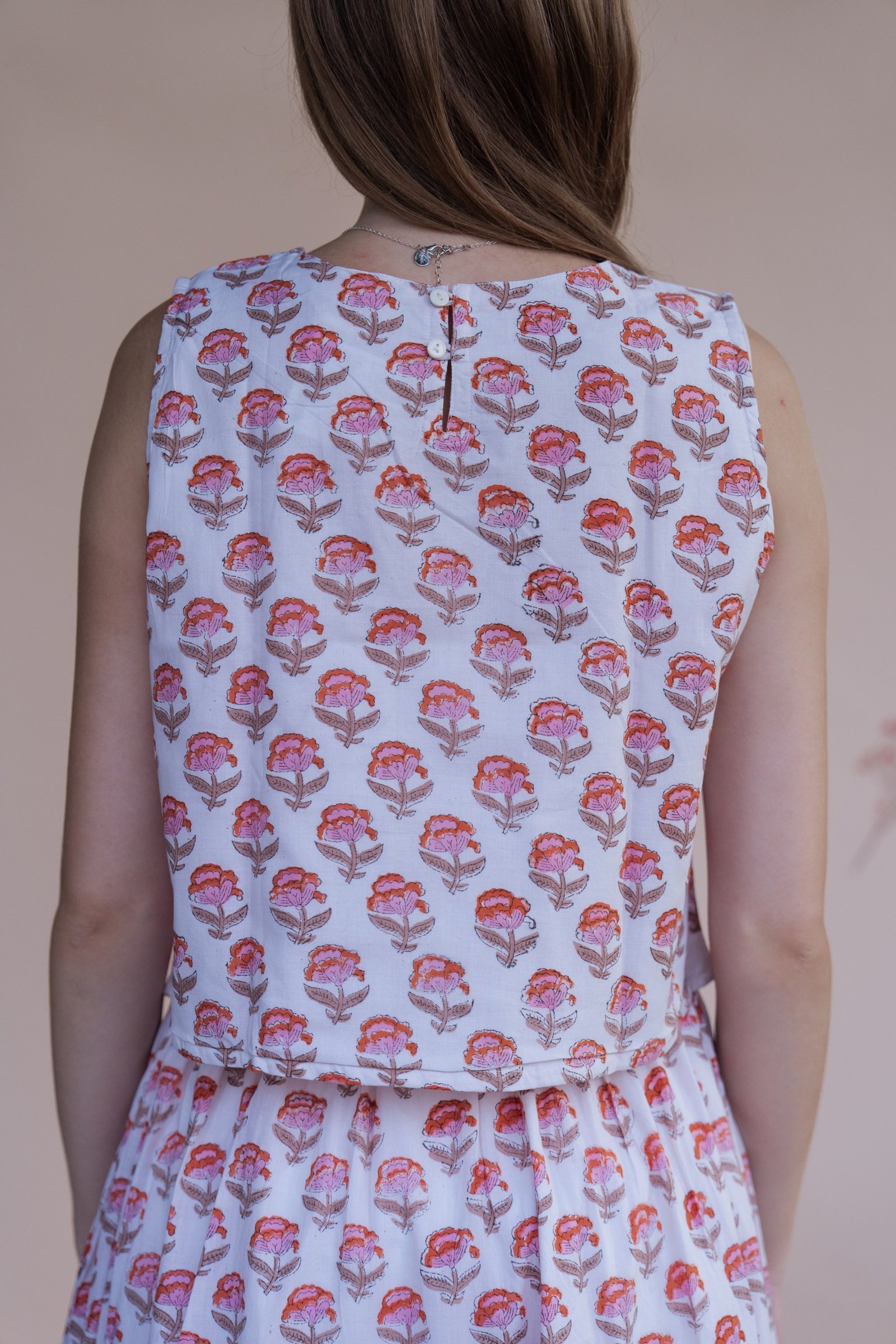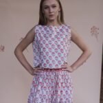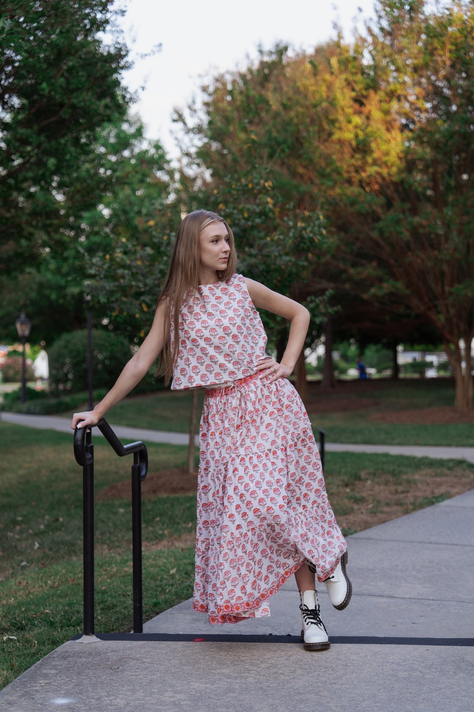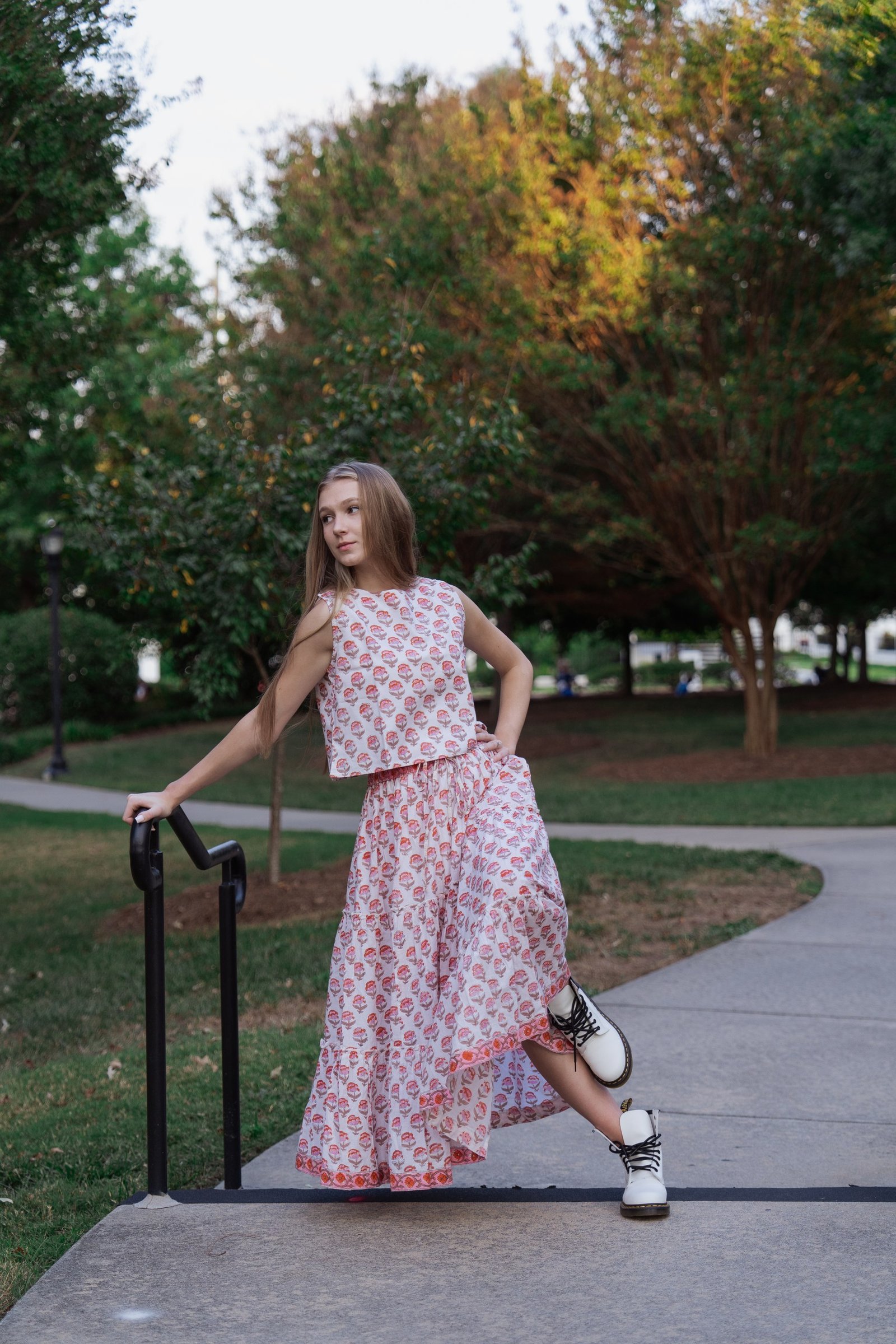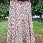 This breezy hand-block printed Tiered skirt exudes a soft, vintage charm with its delicate floral motifs in shades of pink