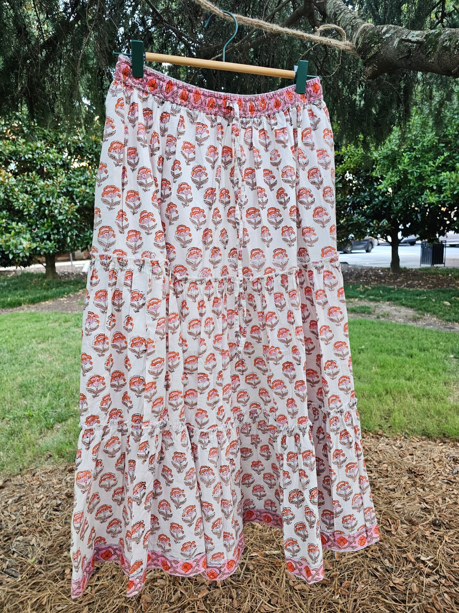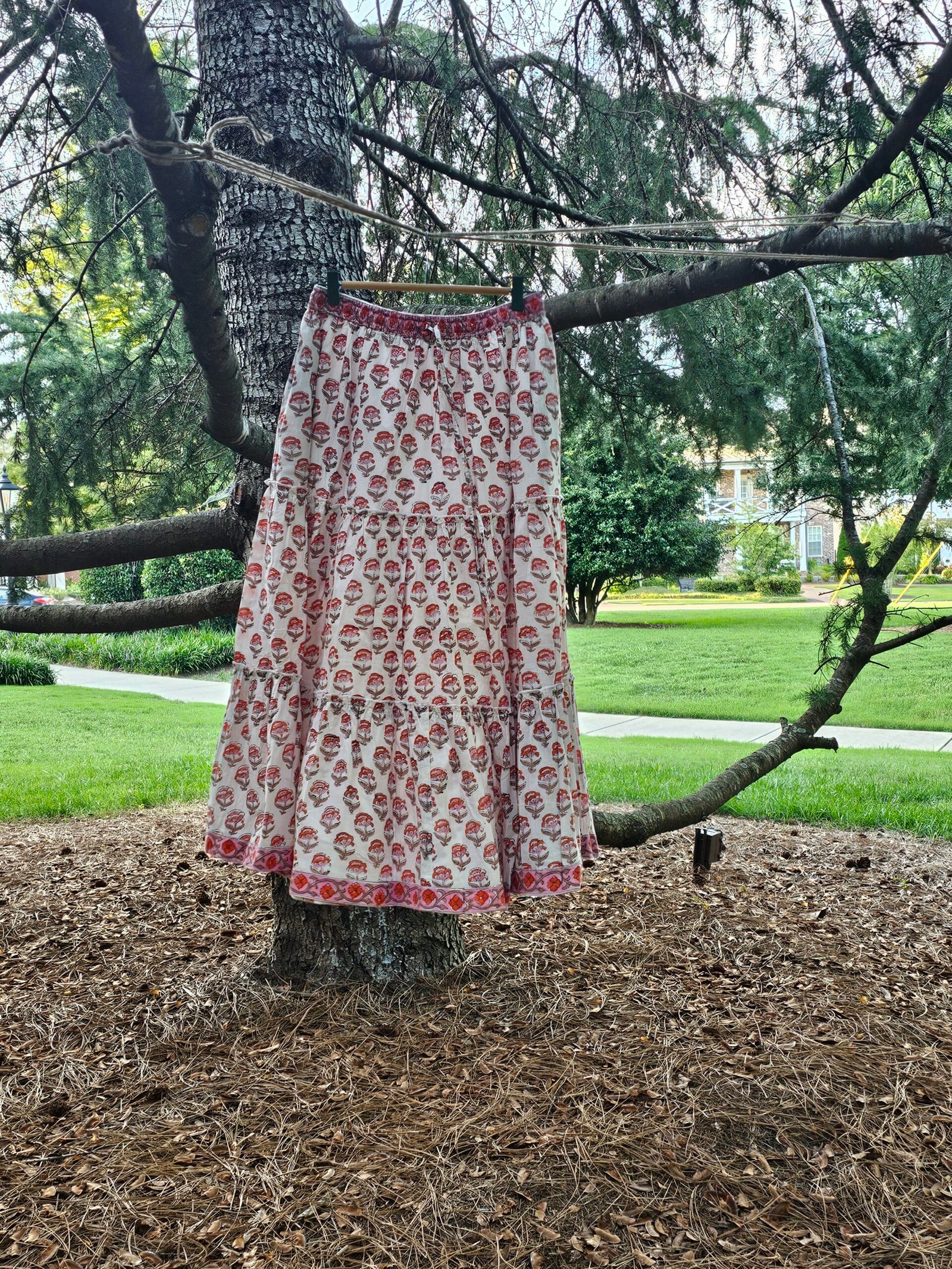 Hand Block Printed Tiered Skirt~ Pink Motifs