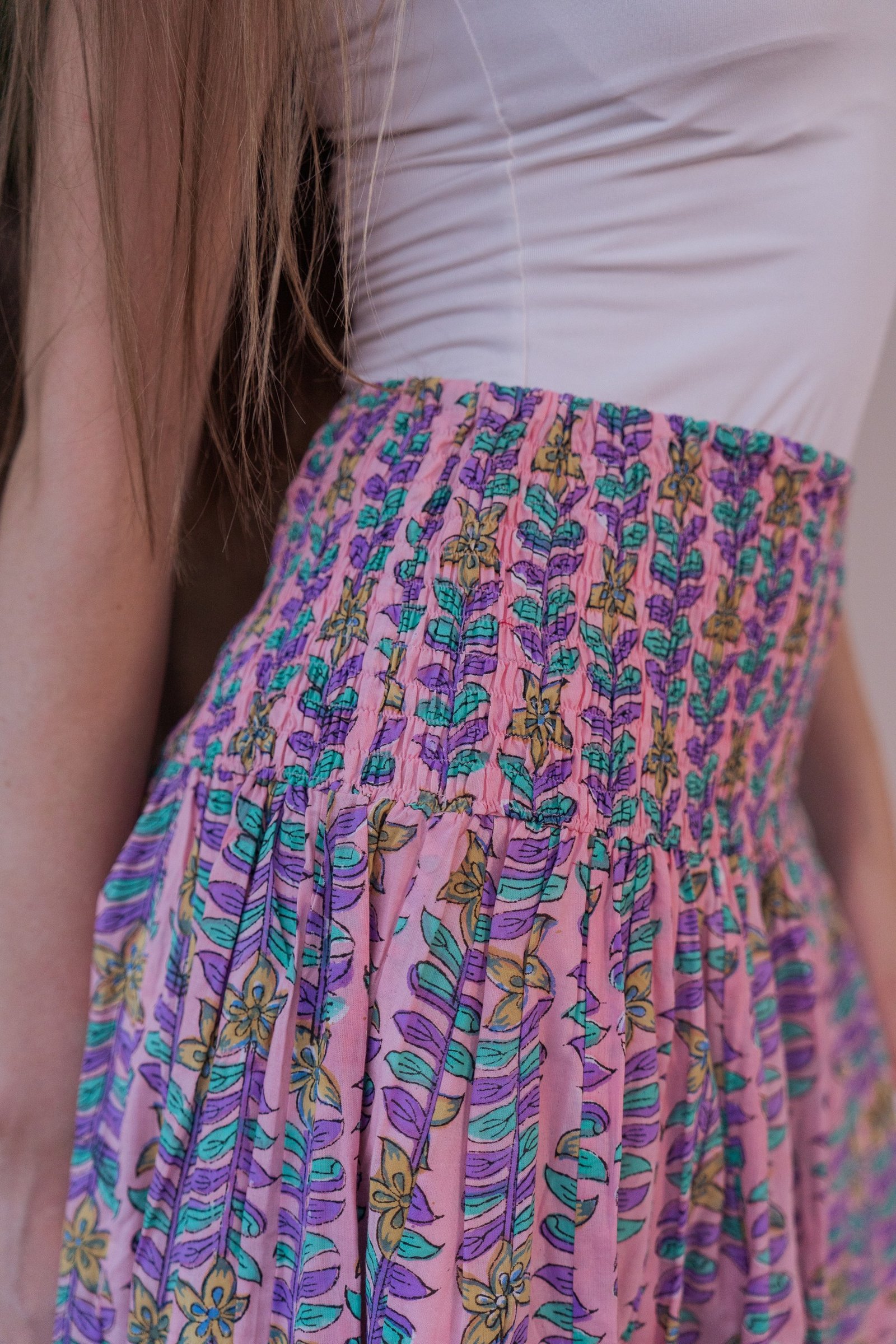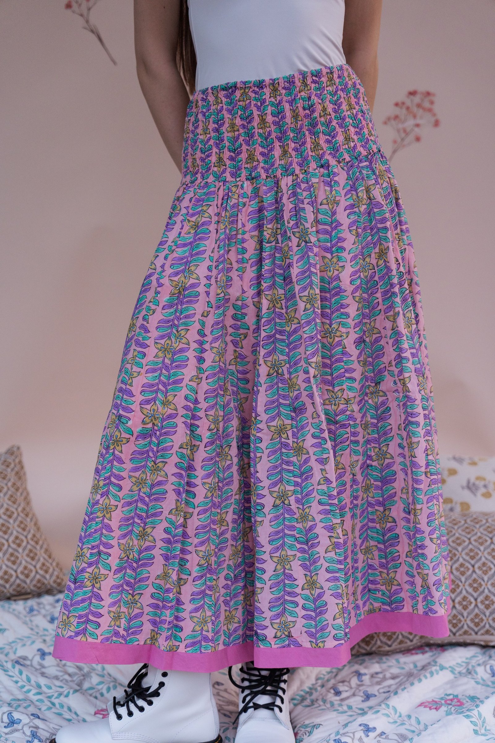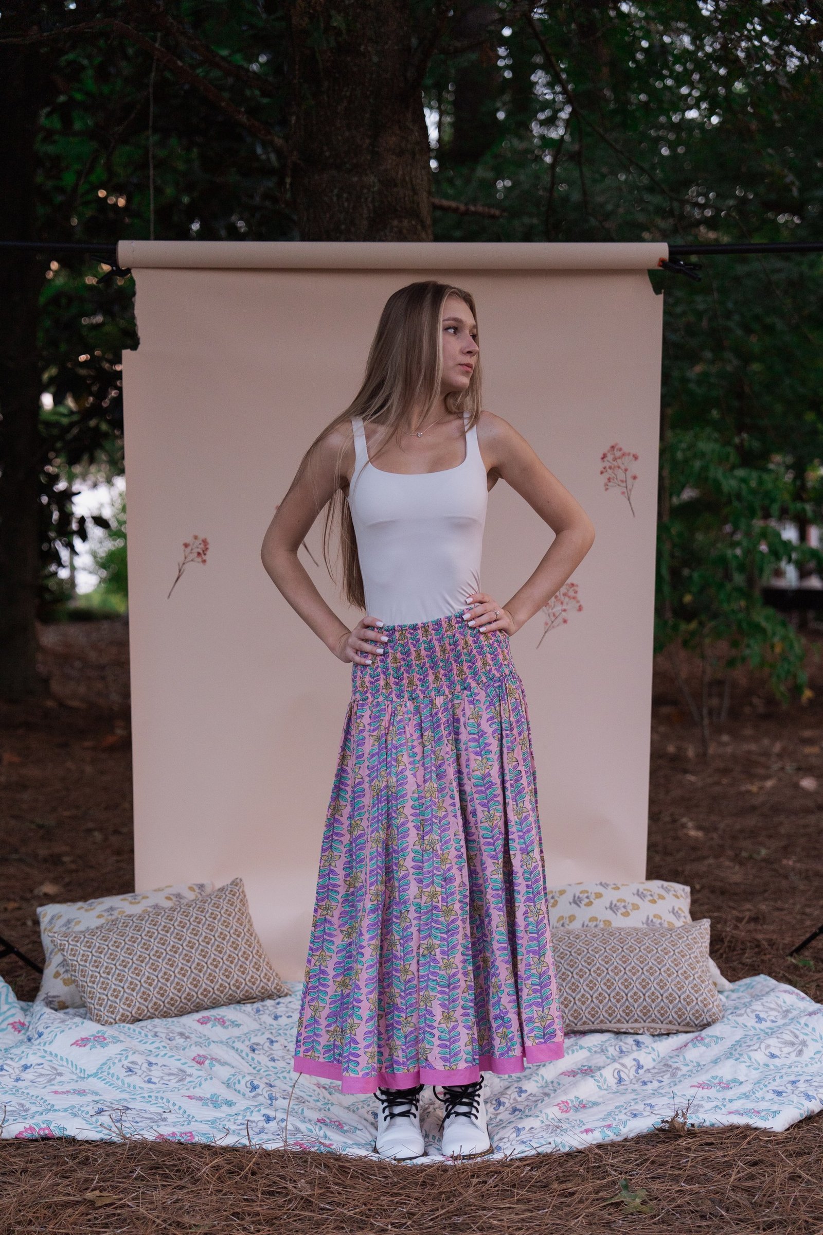 Pink Meadow Hand-Block Printed Paneled Skirt/Dress with Smocked waist~ Lavendar