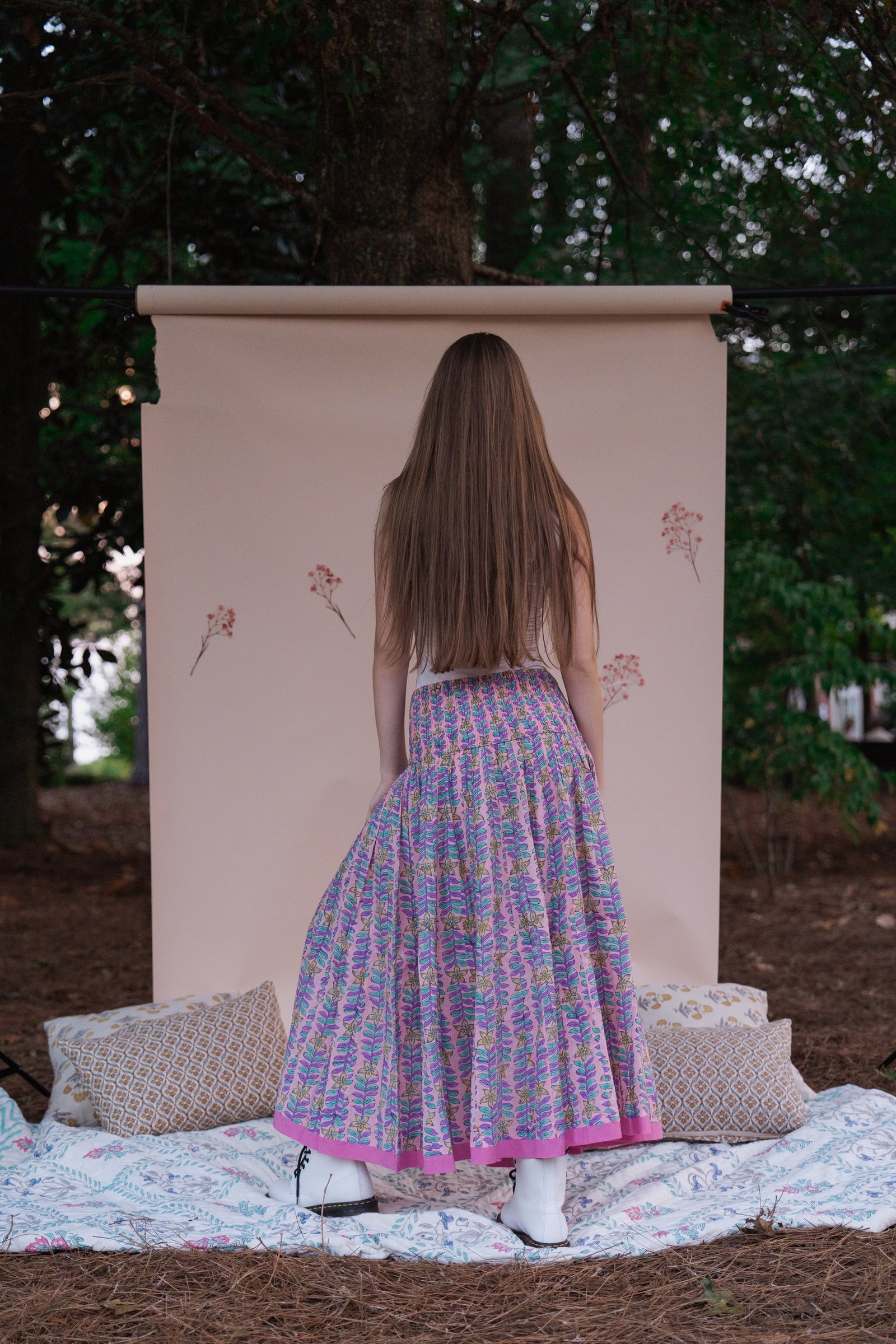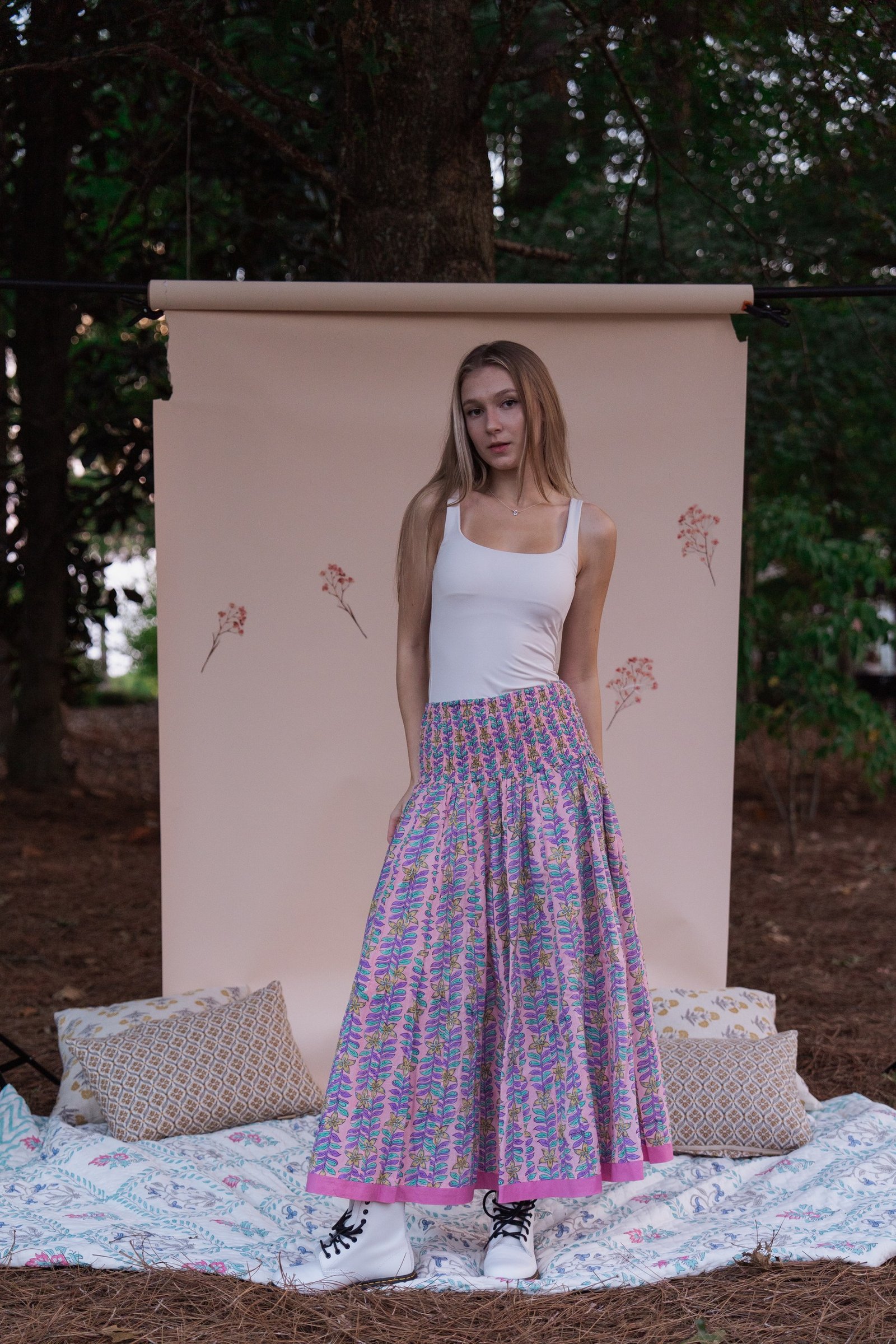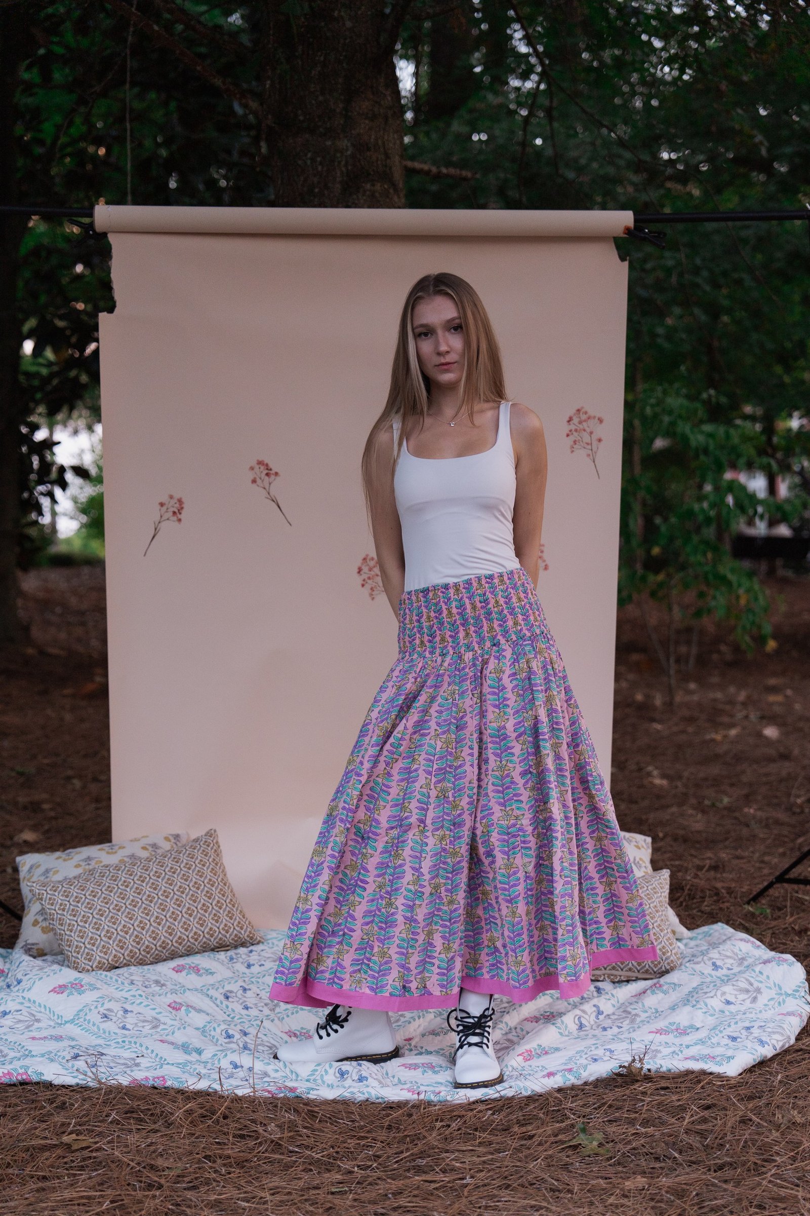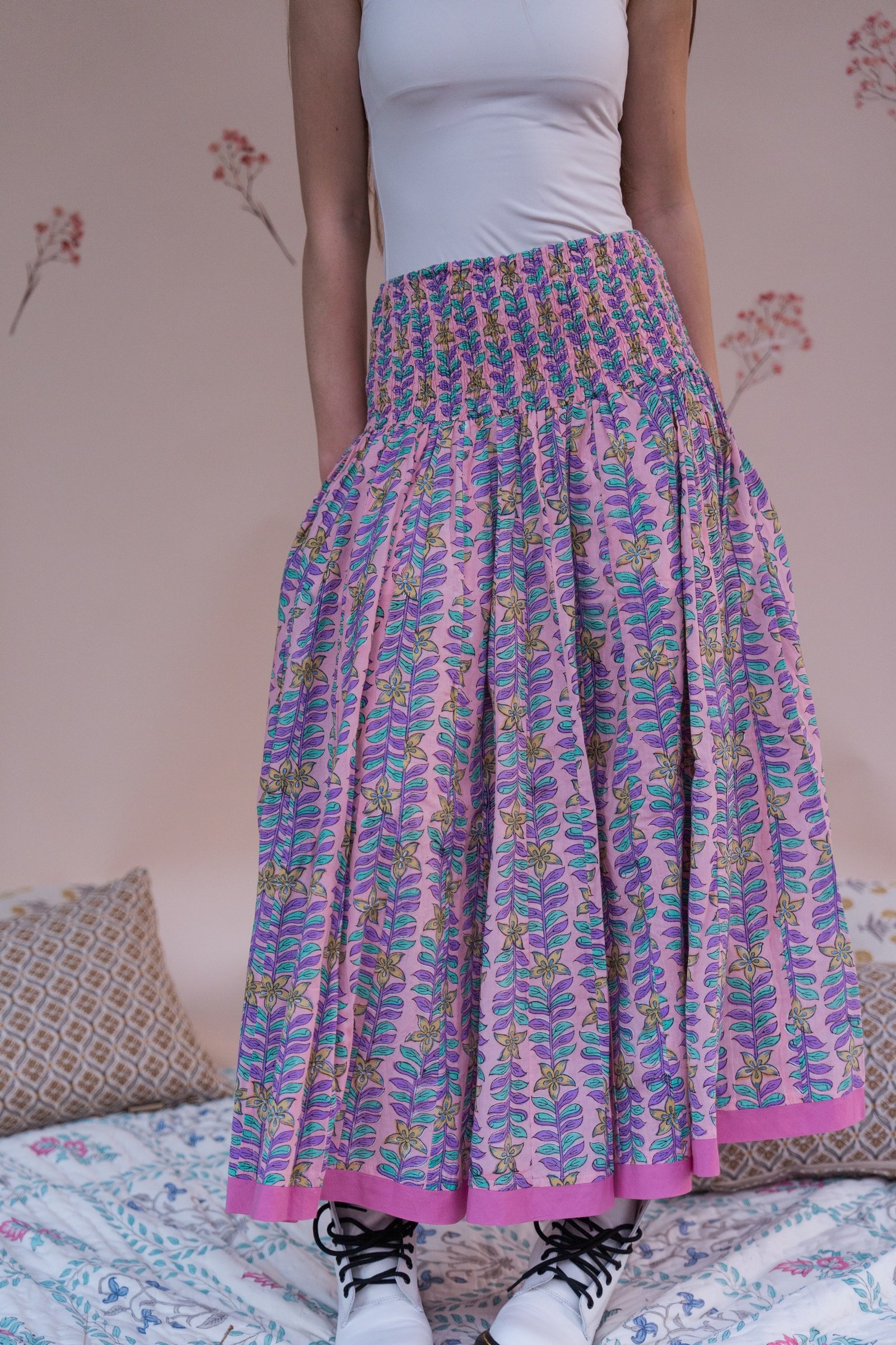Pink Meadow Hand-Block Printed Paneled Skirt/Dress with Smocked waist~ Lavendar