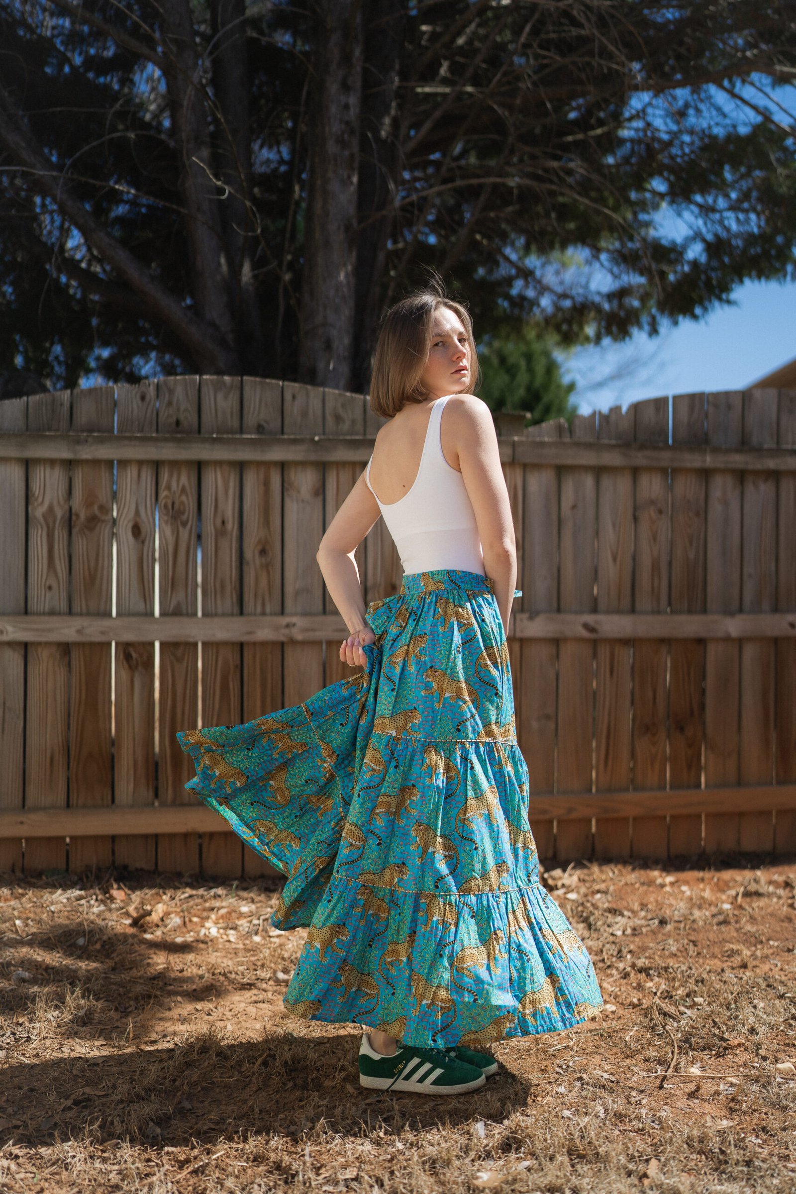 This screen printed skirt features a bold leopard motif set against a lush, nature-inspired backdrop. the tiered silhouette adds movement and volume, while the adjustable drawstring waist is finished with playful tassels.