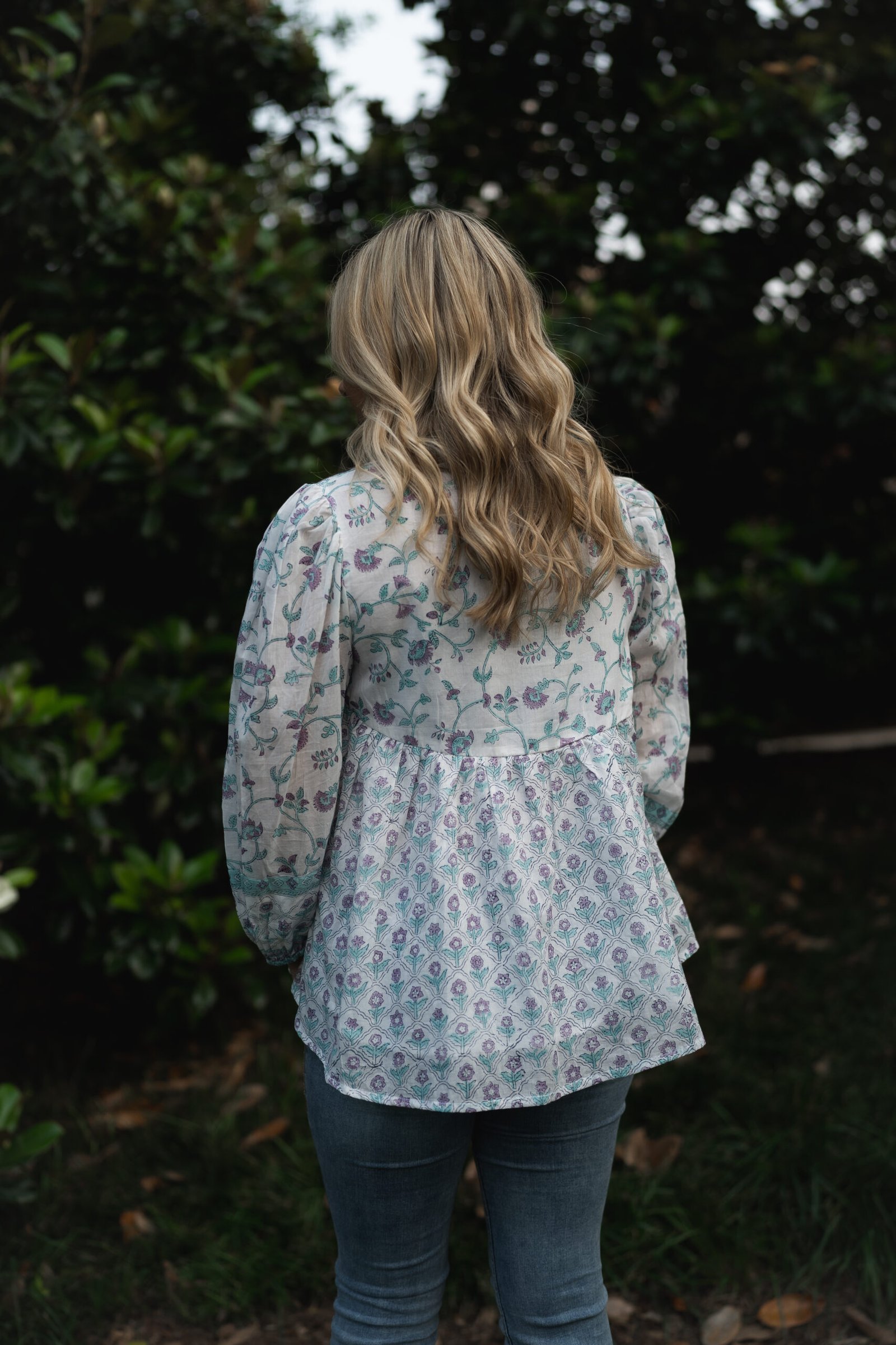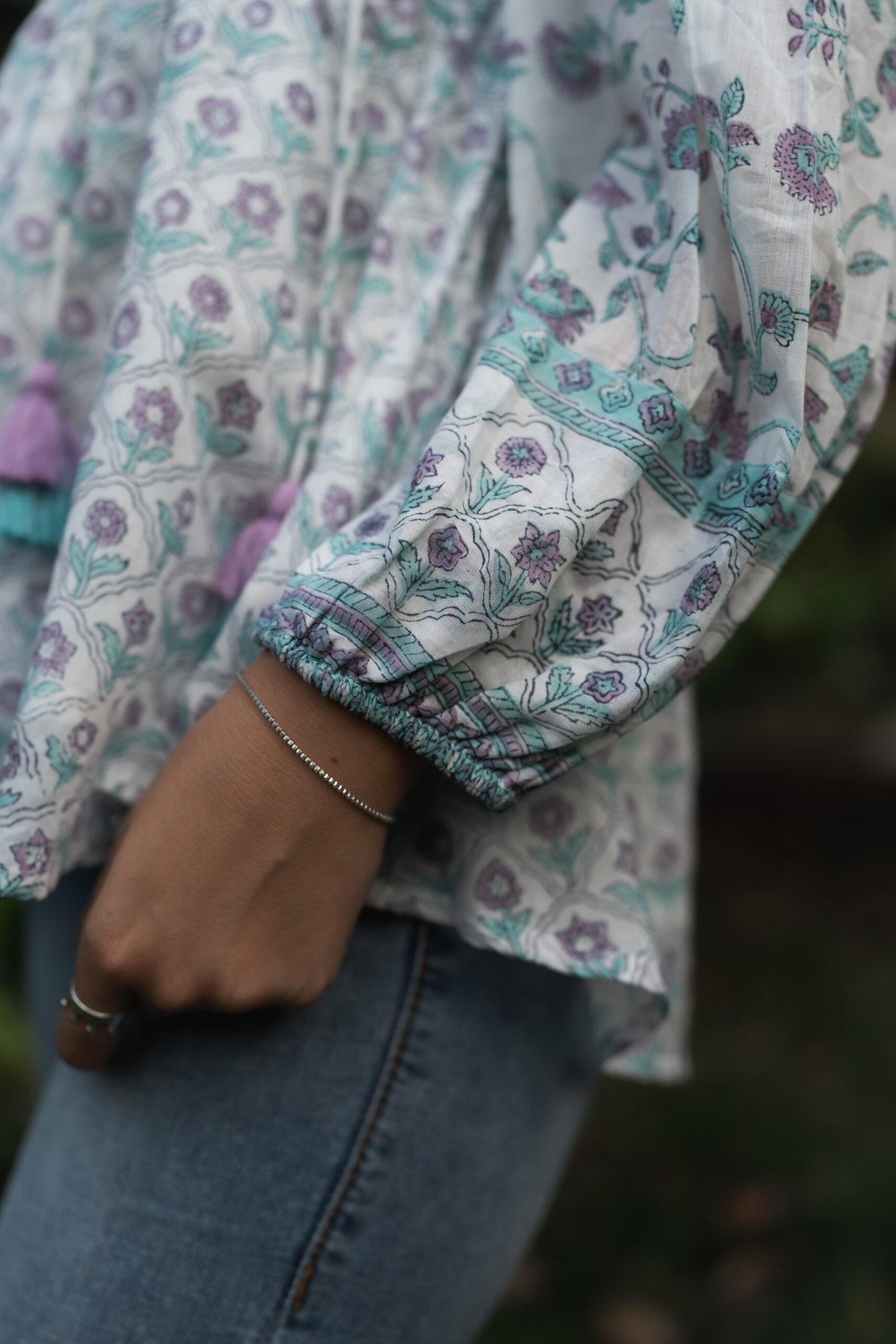 Ivory base with lavender, sage, and teal hand-block floral print