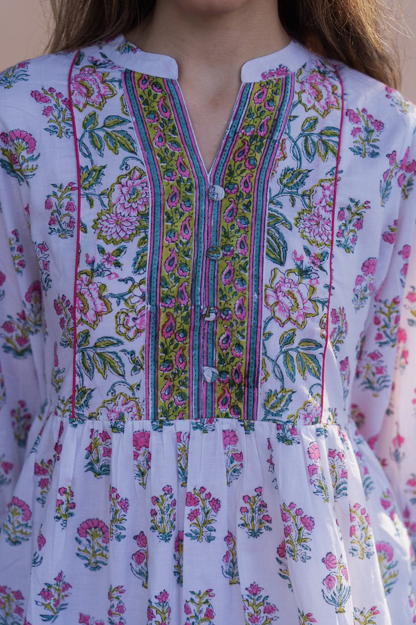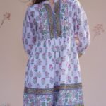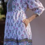 Bring the freshness of spring into your wardrobe with our spring Blossom Hand block Dress. Handcrafted on soft, breathable cotton, this dress features intricate floral block prints in lively shades of pink, green, and blue over a crisp white background. The detailed yoke design, soft gathers, and comfortable fit make it perfect for everyday wear or weekend gateways. A blend of elegance and tradition – celebrating the beauty of hand block printing with a modern silhouette.