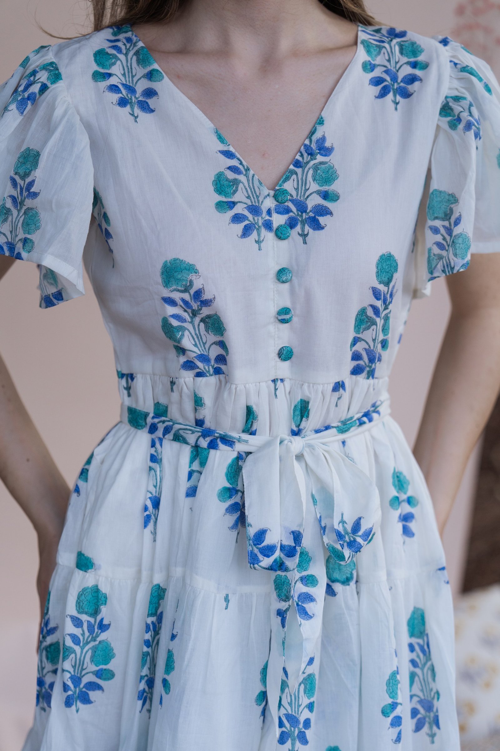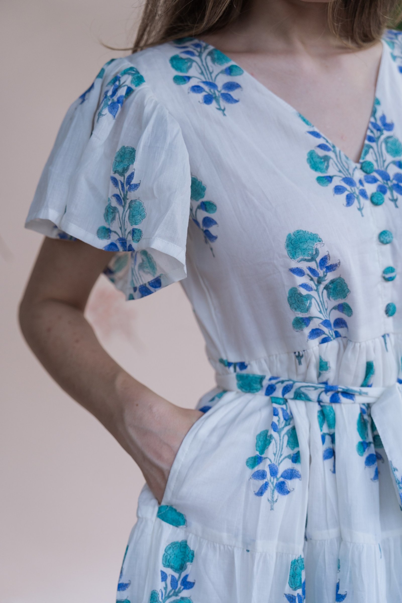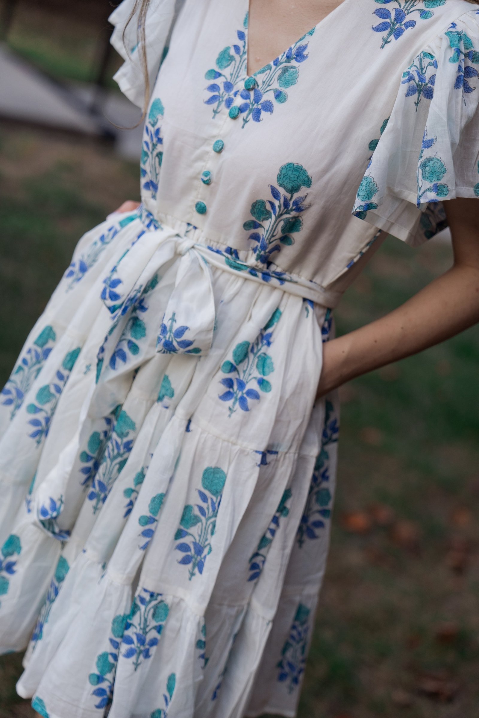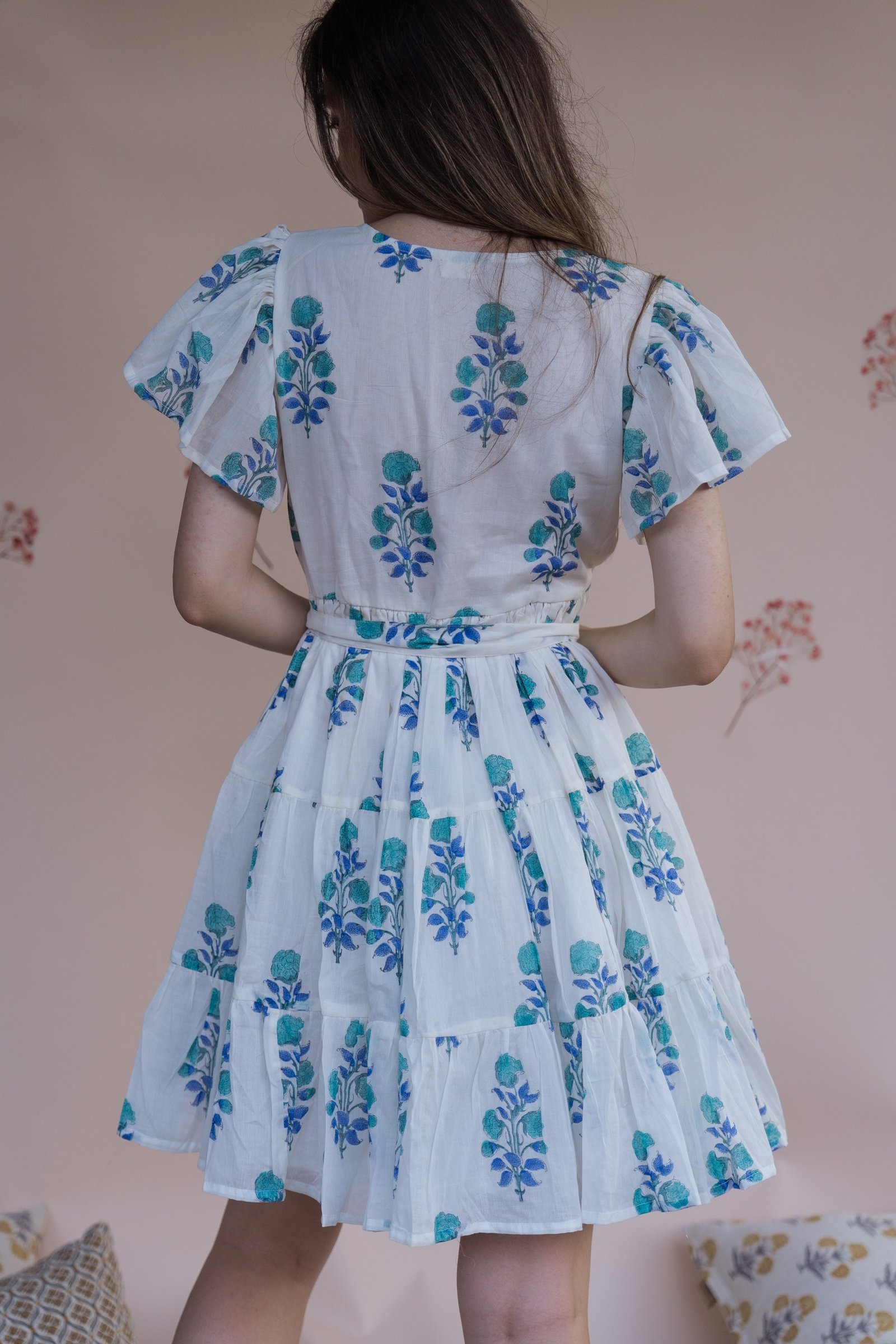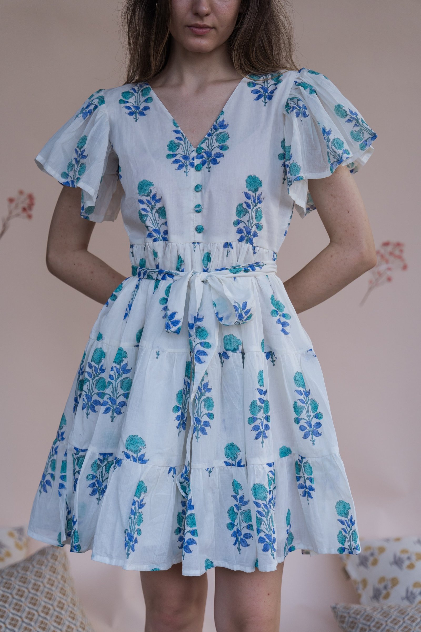 A breezy tiered cotton mini dress with flutter sleeves and hand block printed floral motif in beautiful shades of teal and indigo blue on a soft white cotton base. The print style is a Mughal-inspired floral buta. The floral elements resemble stylized marigold or mogra flowers with bold leafy stems.