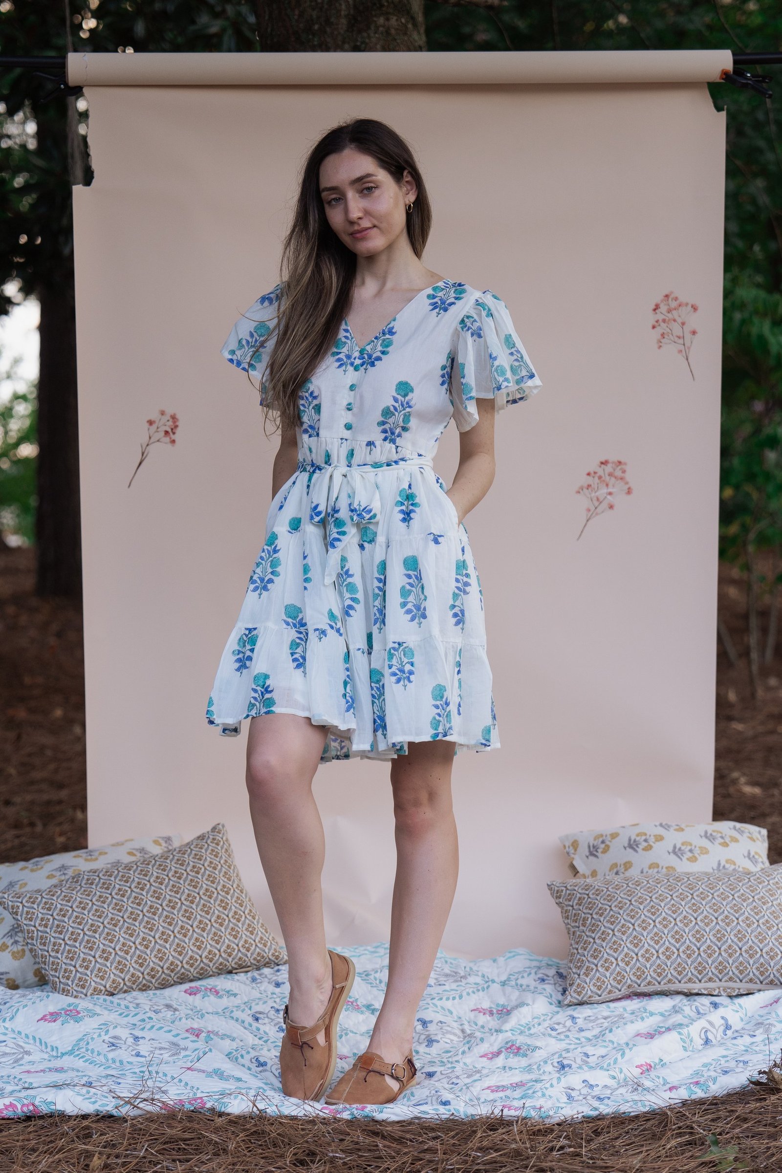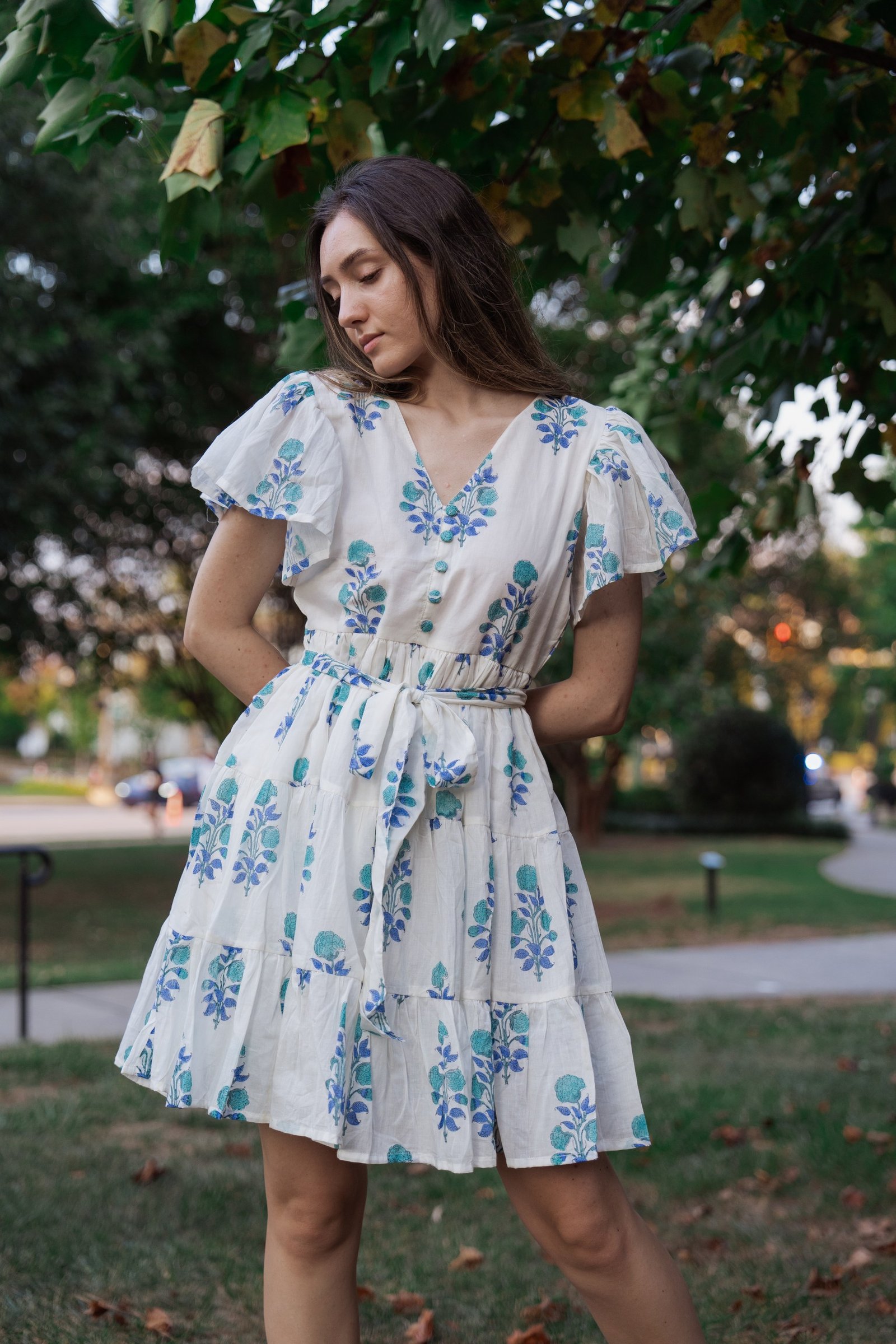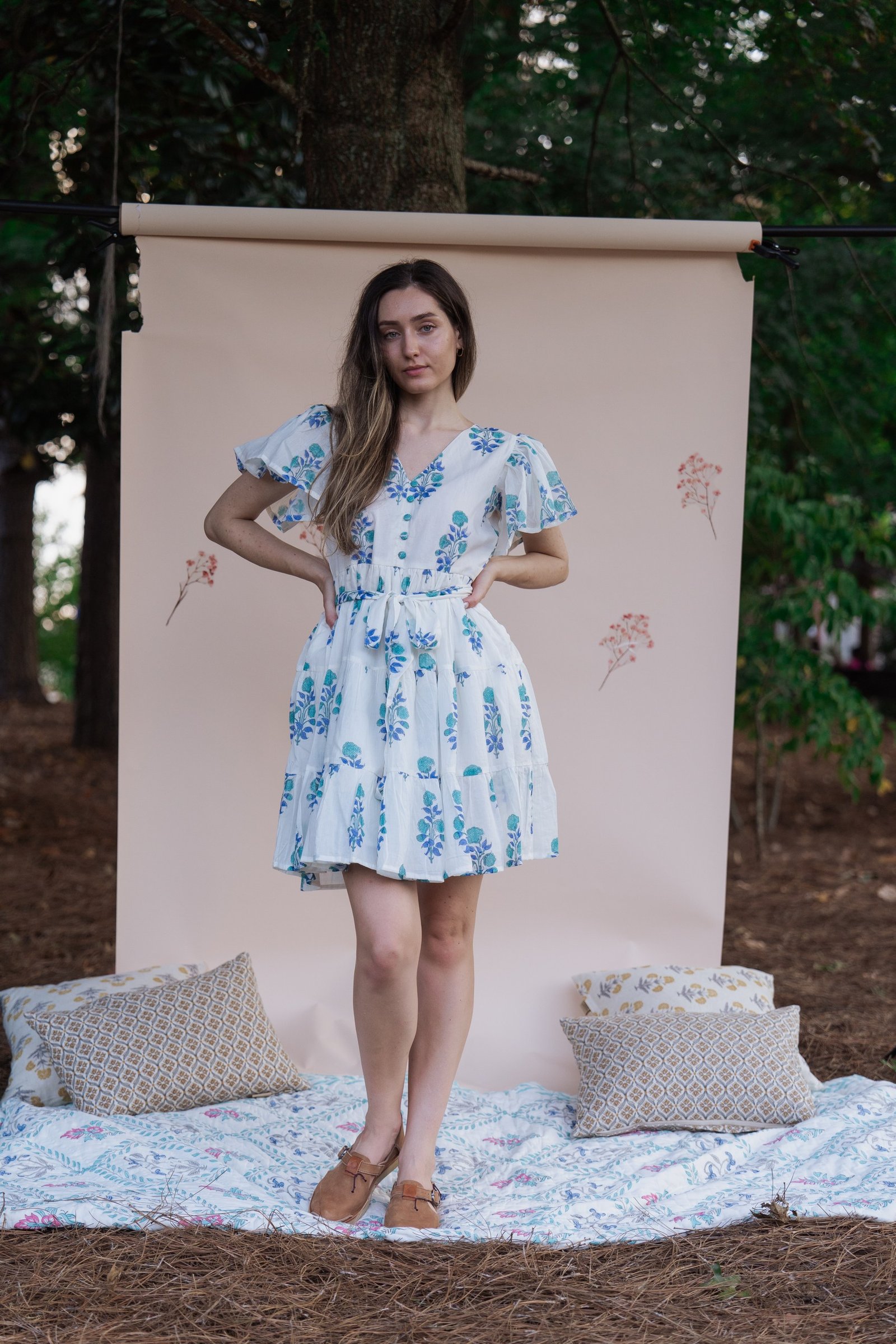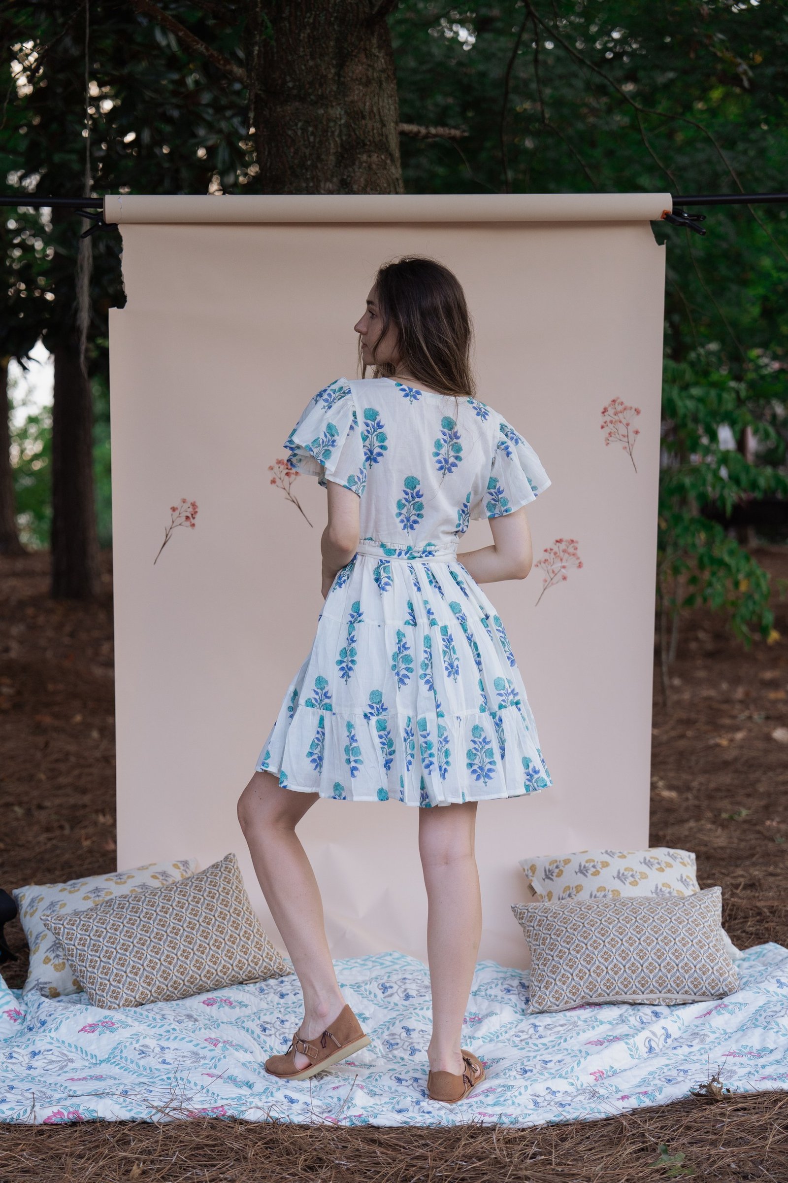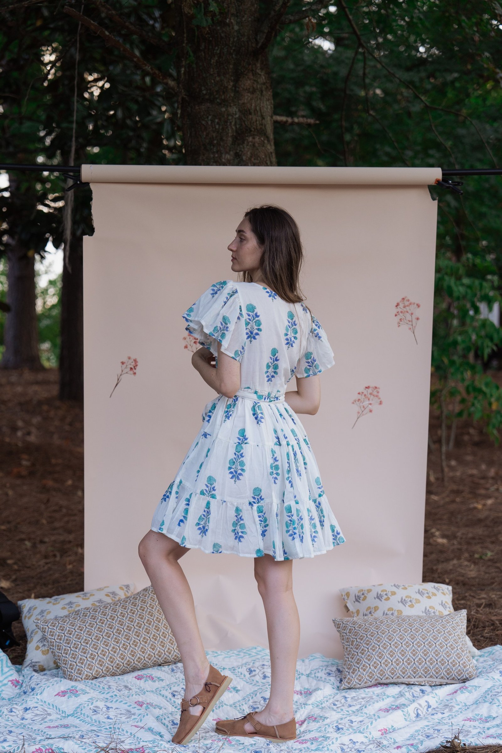 A breezy tiered cotton mini dress with flutter sleeves and hand block printed floral motif in beautiful shades of teal and indigo blue on a soft white cotton base. The print style is a Mughal-inspired floral buta. The floral elements resemble stylized marigold or mogra flowers with bold leafy stems.