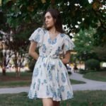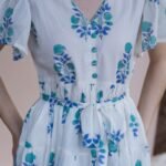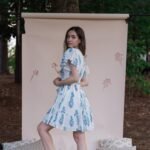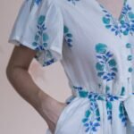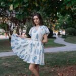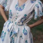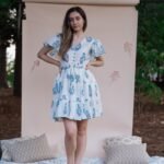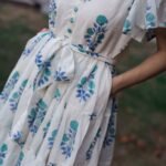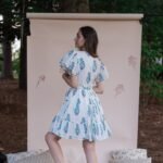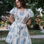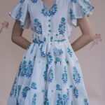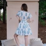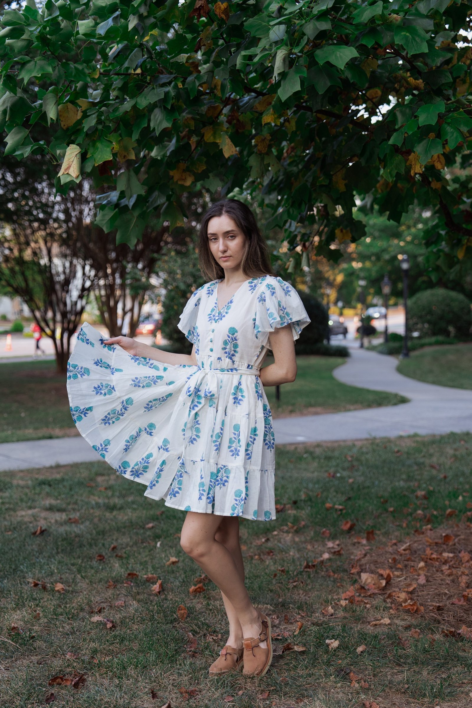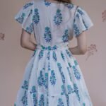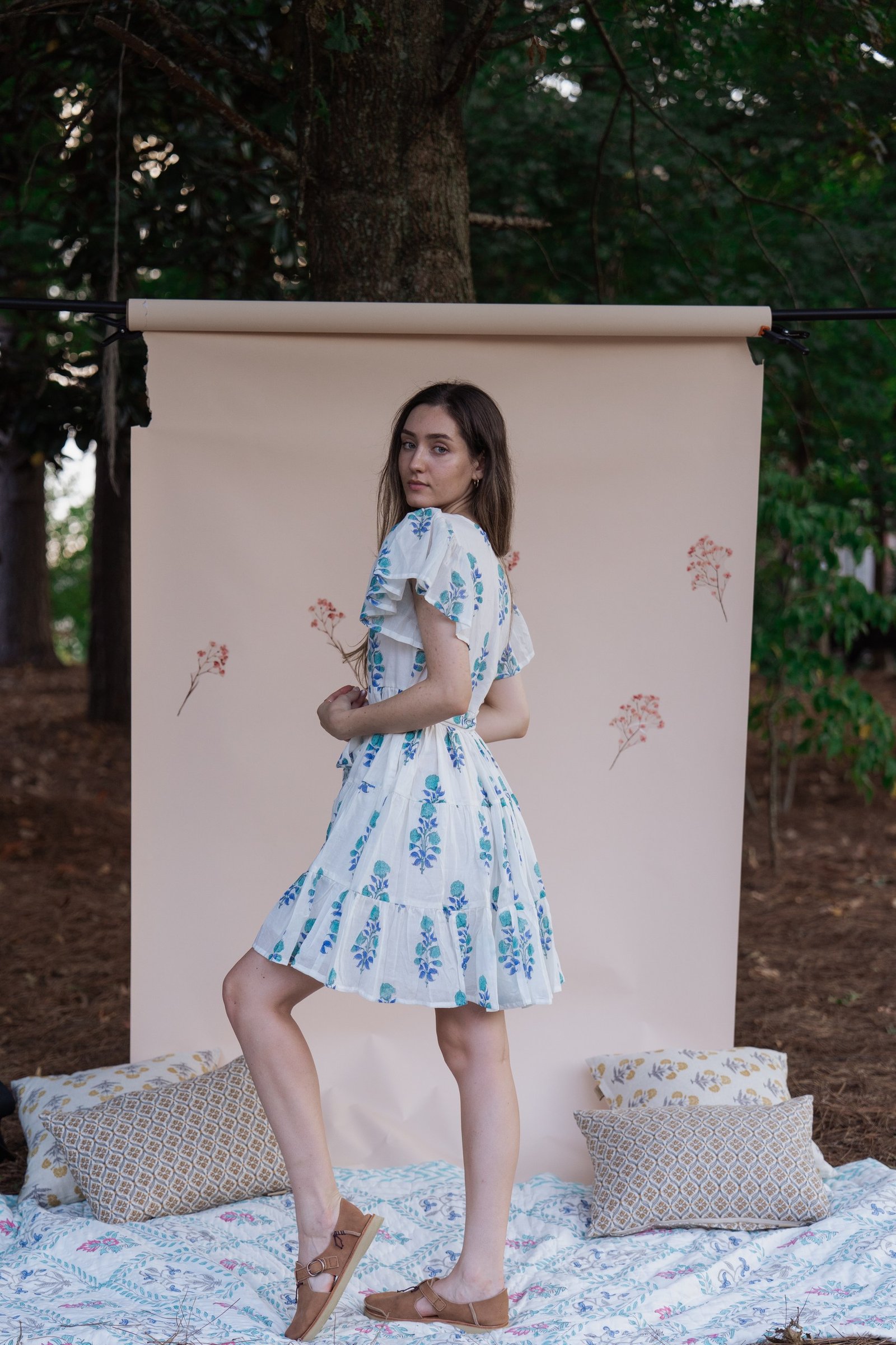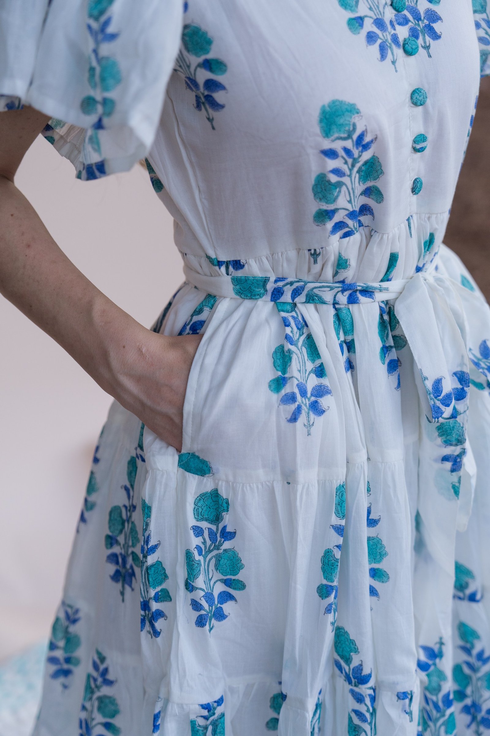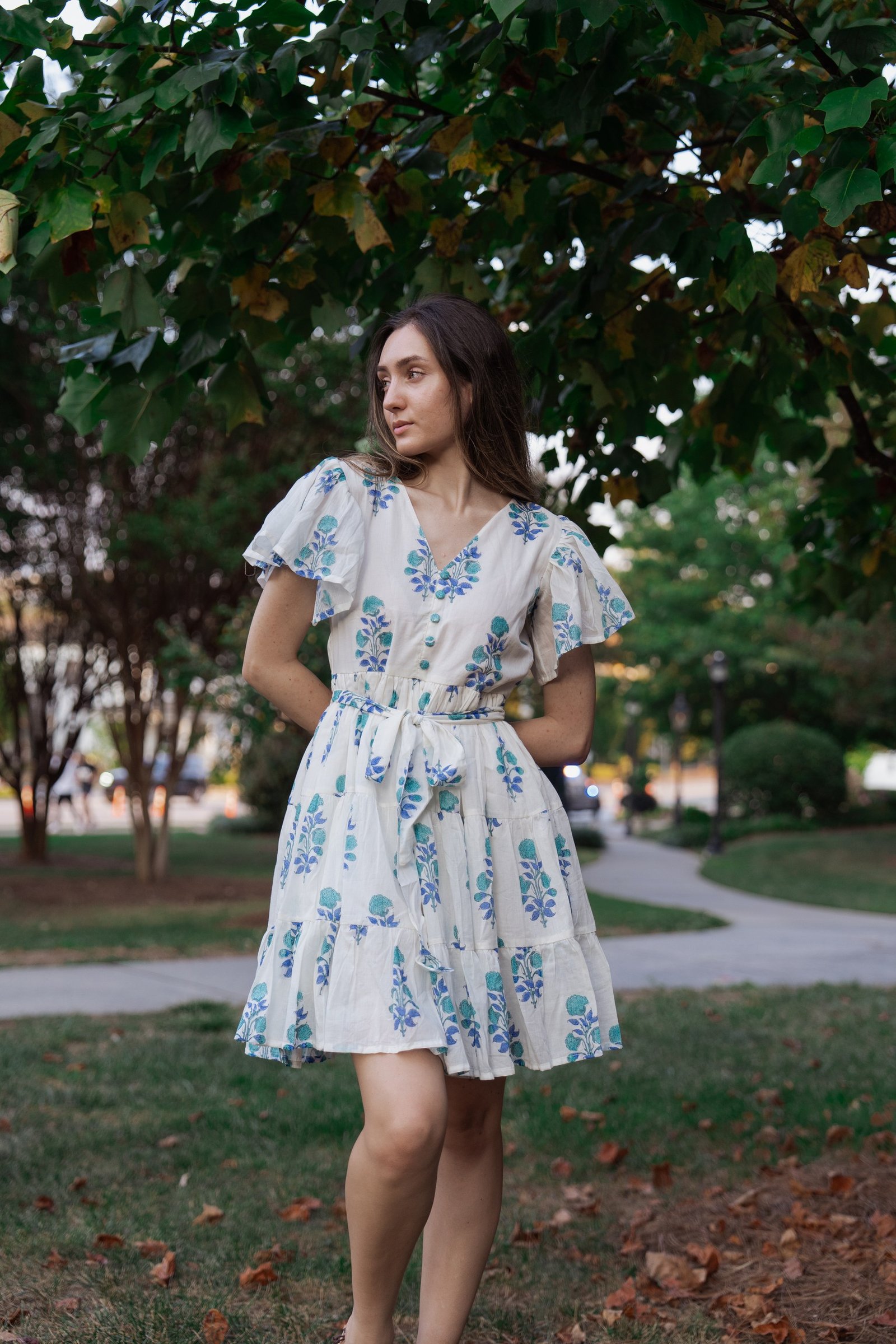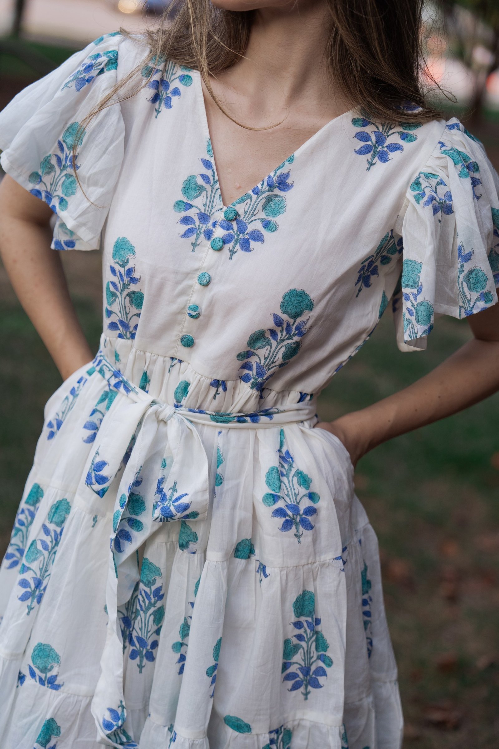 A breezy tiered cotton mini dress with flutter sleeves and hand block printed floral motif in beautiful shades of teal and indigo blue on a soft white cotton base. The print style is a Mughal-inspired floral buta. The floral elements resemble stylized marigold or mogra flowers with bold leafy stems.