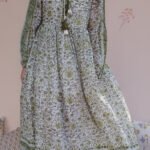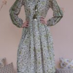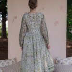 Designed with a gently gathered waist, full flowing skirt, and long sleeves finished