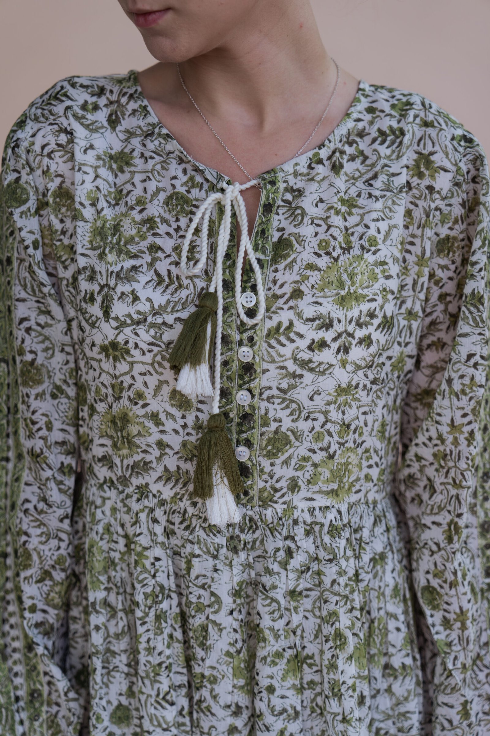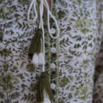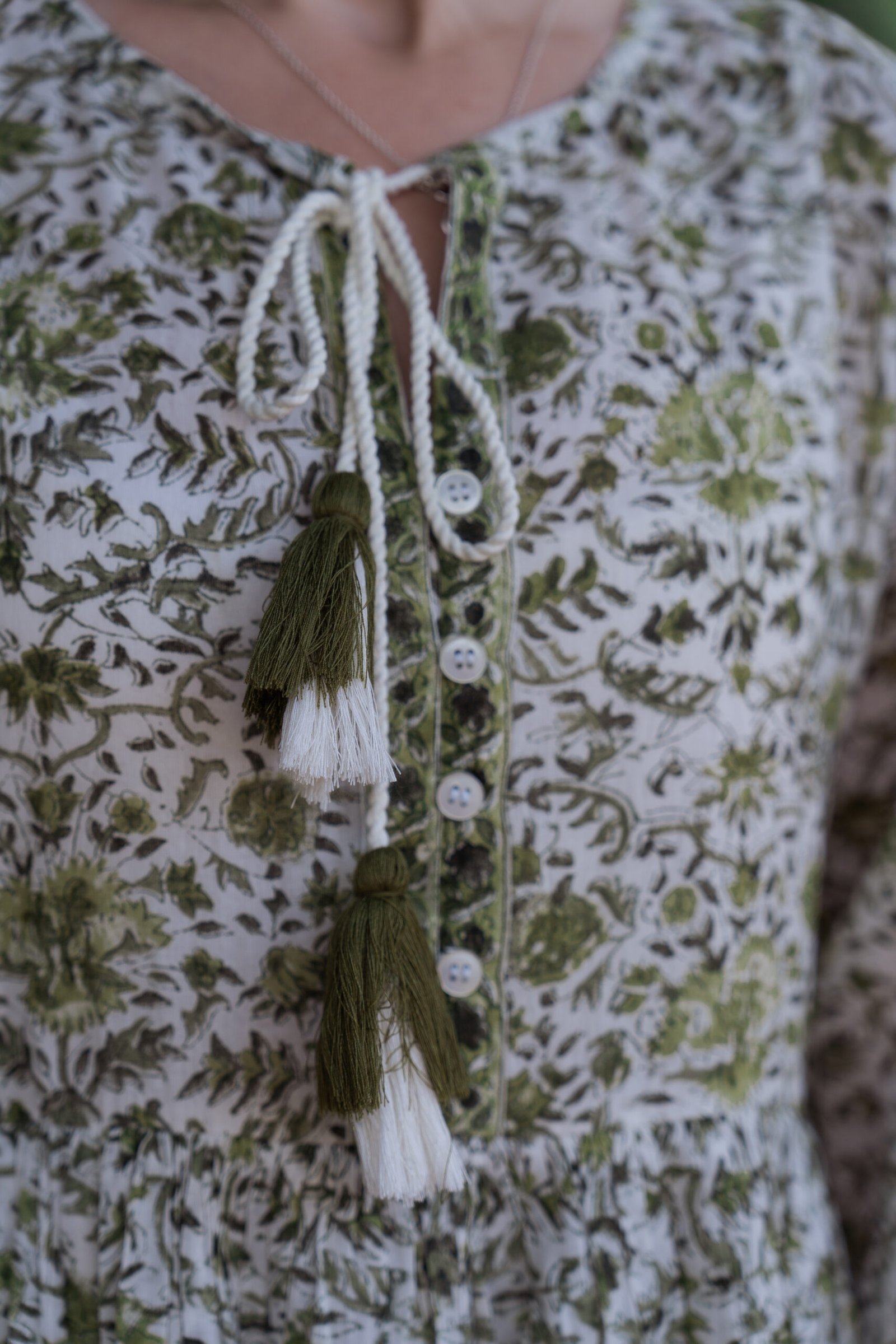 with coordinated border detailing. The tasseled tie-up neckline adds a handcrafted touch,